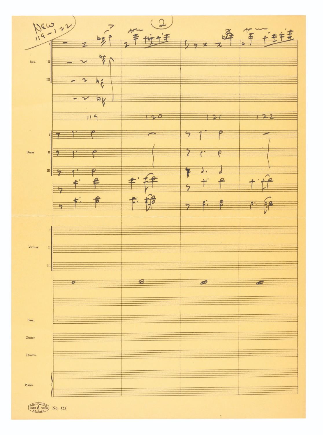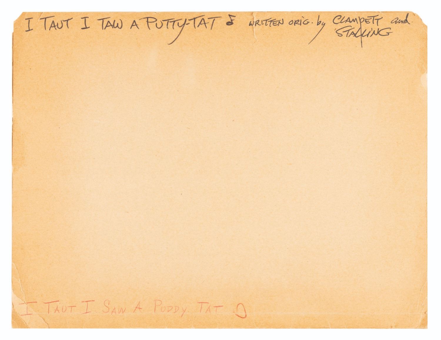 (Schlesinger, 1945) A partial score for the brass and saxophone sections of “I Taut I Taw A Putty-Tat” sung by Tweety Bird in the Merrie Melodies short “A Gruesome Twosome,” directed by Bob Clampett. The single page is presented in a folder with a header hand-written by Clampett crediting himself and Carl Stalling as the writers. Measuring 14.75” x 10.25”, the score is in good condition with light edge wear, a horizontal fold across the center, and light discoloration from age. The 9.75” x 13” folder is in good condition with edge wear, corner creases, a 0.5” tear on the left edge, a 1” tear on the top edge, and discoloration from age.