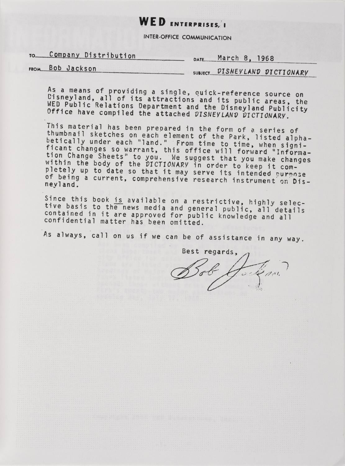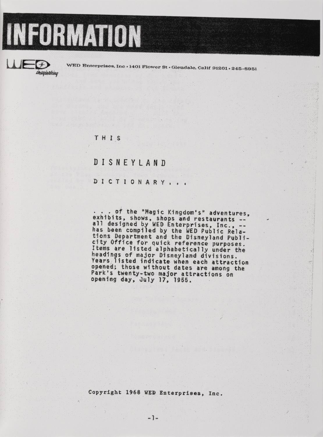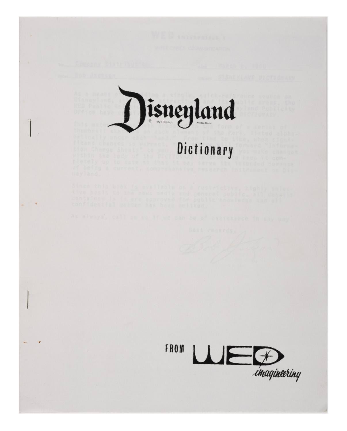 (WDI, 1990s-2000s) A reprinting of a "Disneyland Dictionary" from the WED era of Imagineering. The reprint of the original 1968 "quick-reference guide" to Disneyland comes with a copy of the original cover letter was issued to the media and general public during the 1990s. Measuring 8.5"x11", this document is in very good condition with minor wear.
