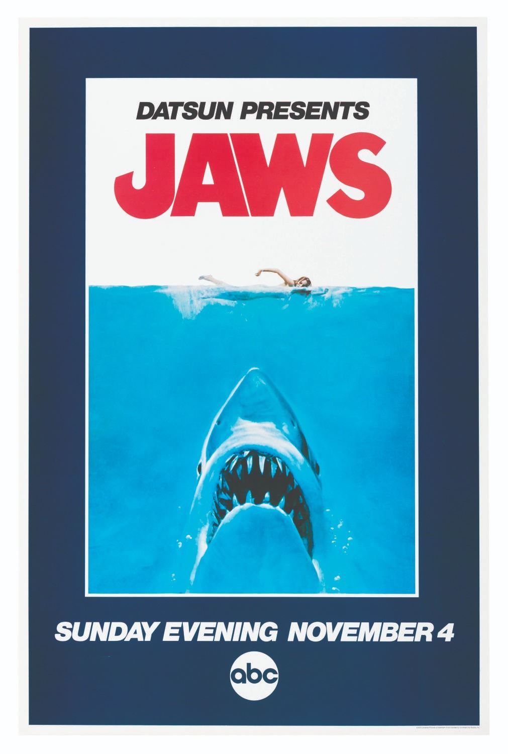 (ABC, 1979) A poster for the television premiere of "JAWS" on November 4, 1979. Presented by Datsun as part of "The ABC Sunday Night Movie" program, the debut of the blockbuster was a ratings smash, seen by over 80 million people. Measuring 23" x 35", the poster displays in very good condition with creases and edge wear.