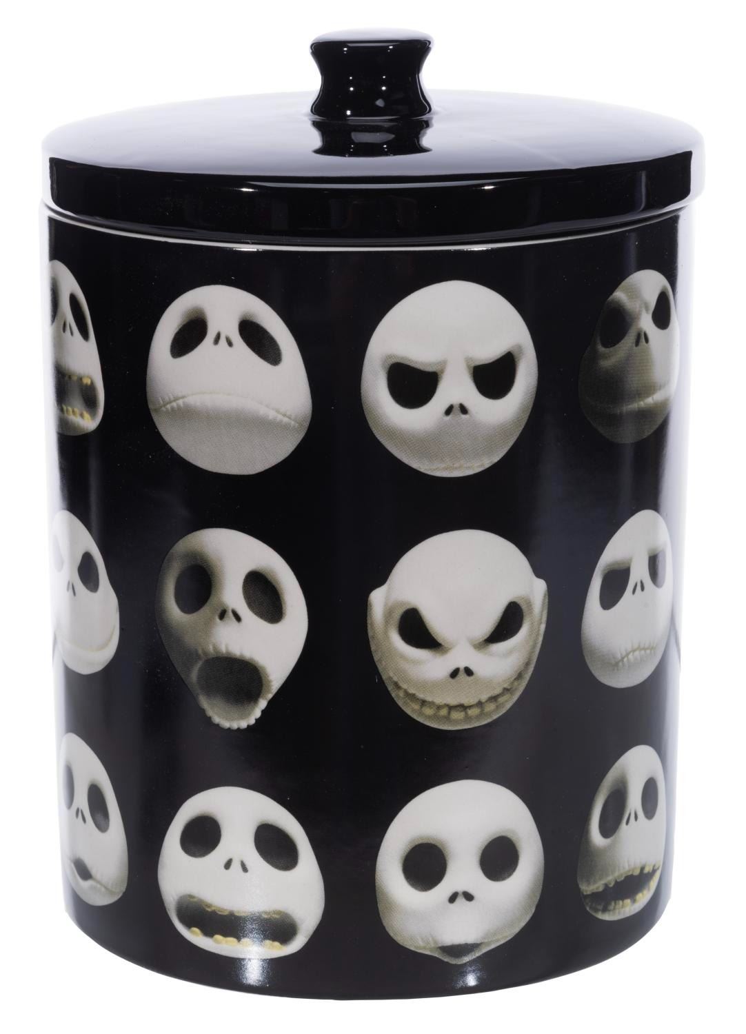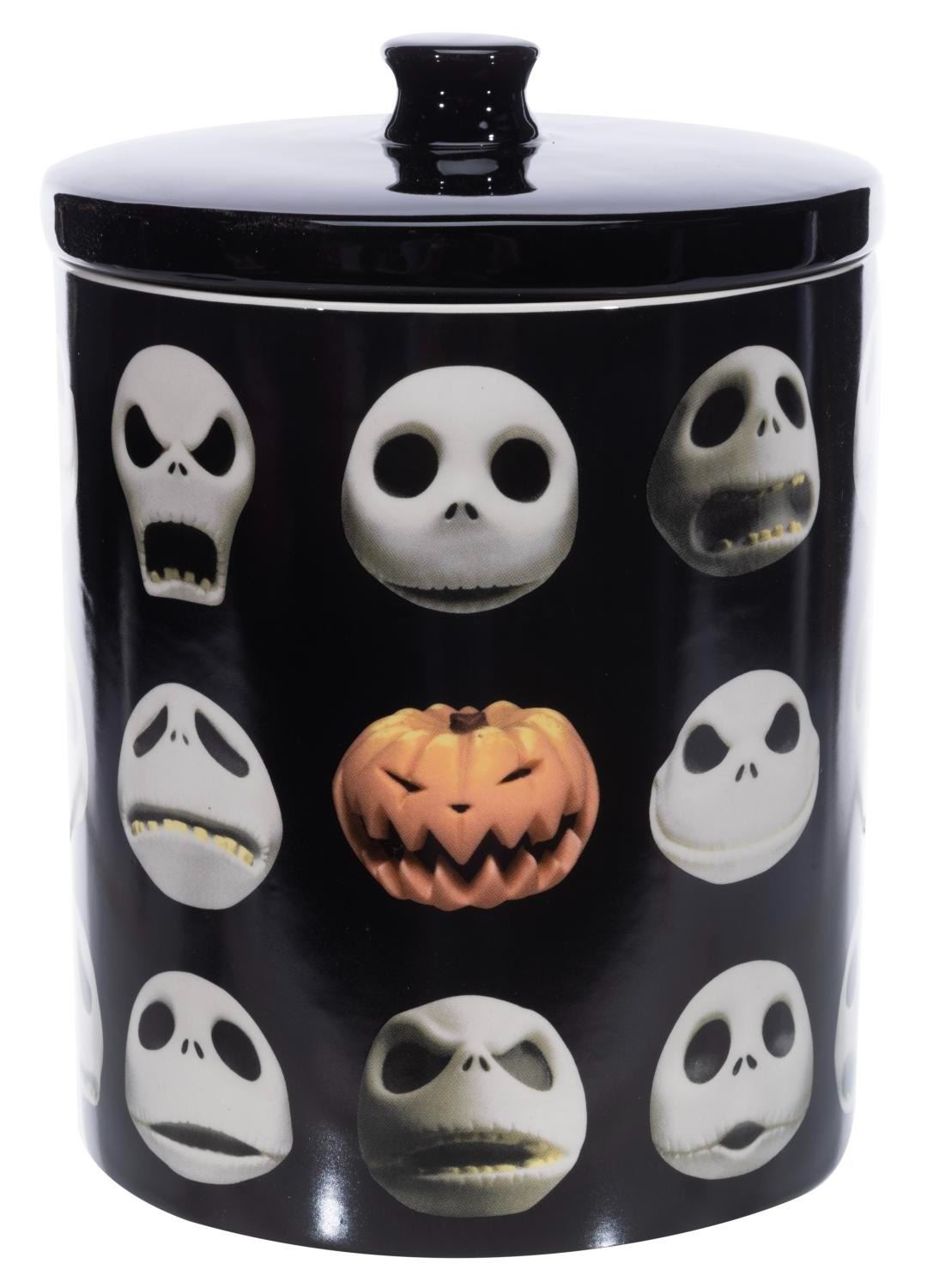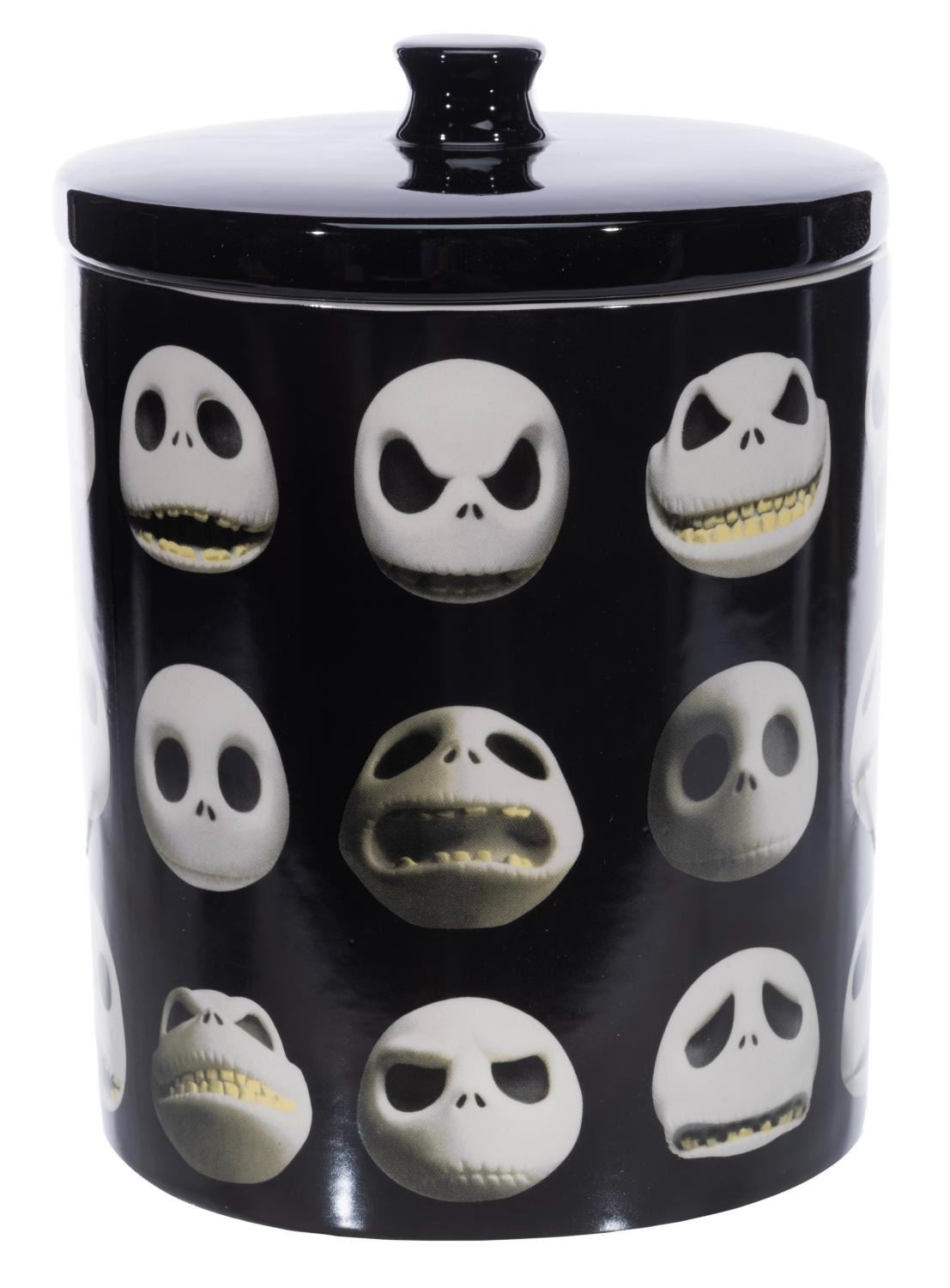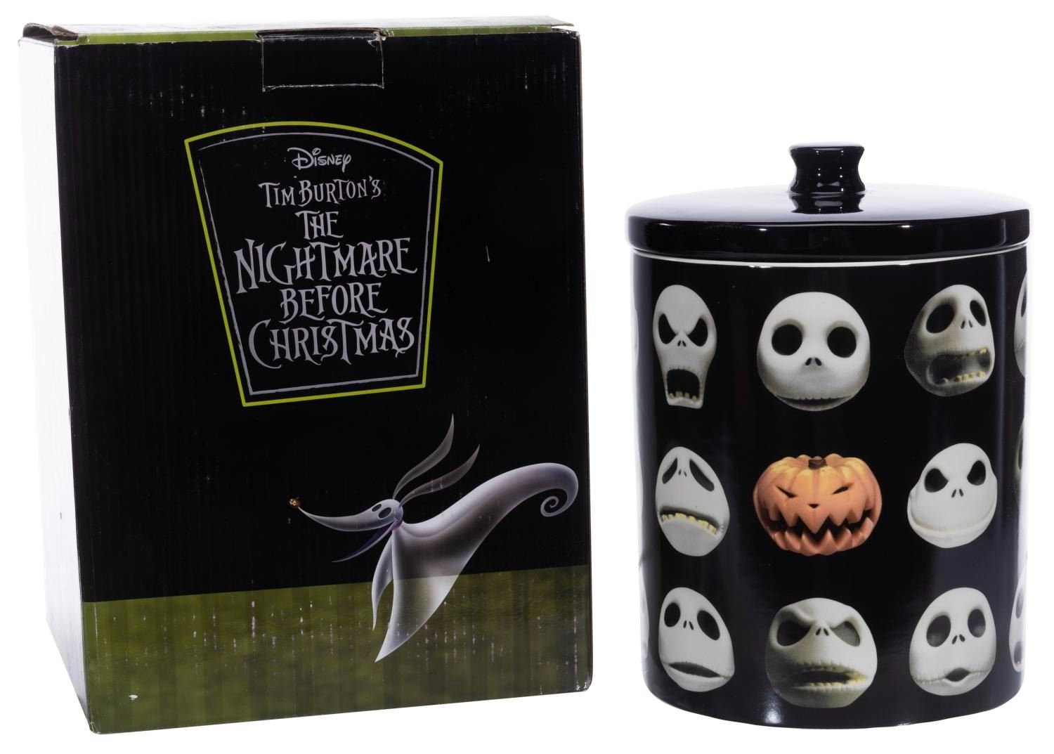 (Enesco, 2020s) A ceramic cookie jar featuring the many faces of Jack Skellington from "The Nightmare Before Christmas." Measuring 7" x 9" tall, the jar is in fine condition in its original box.