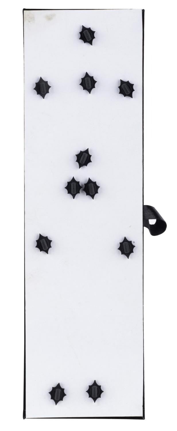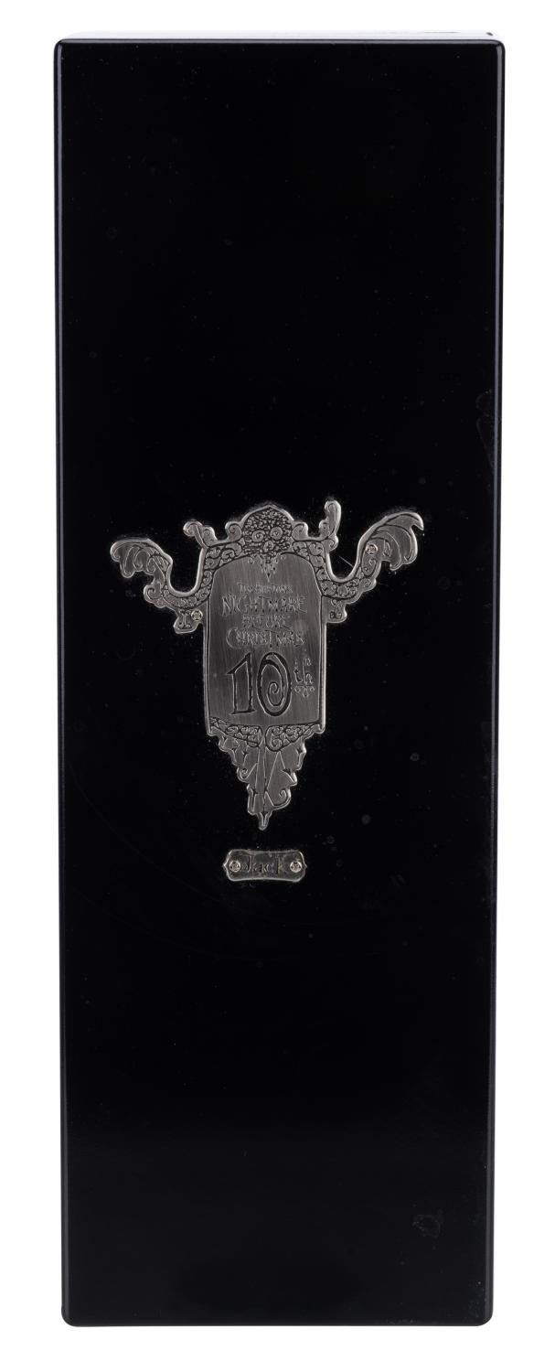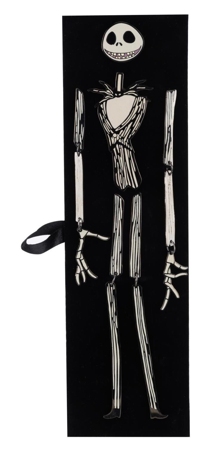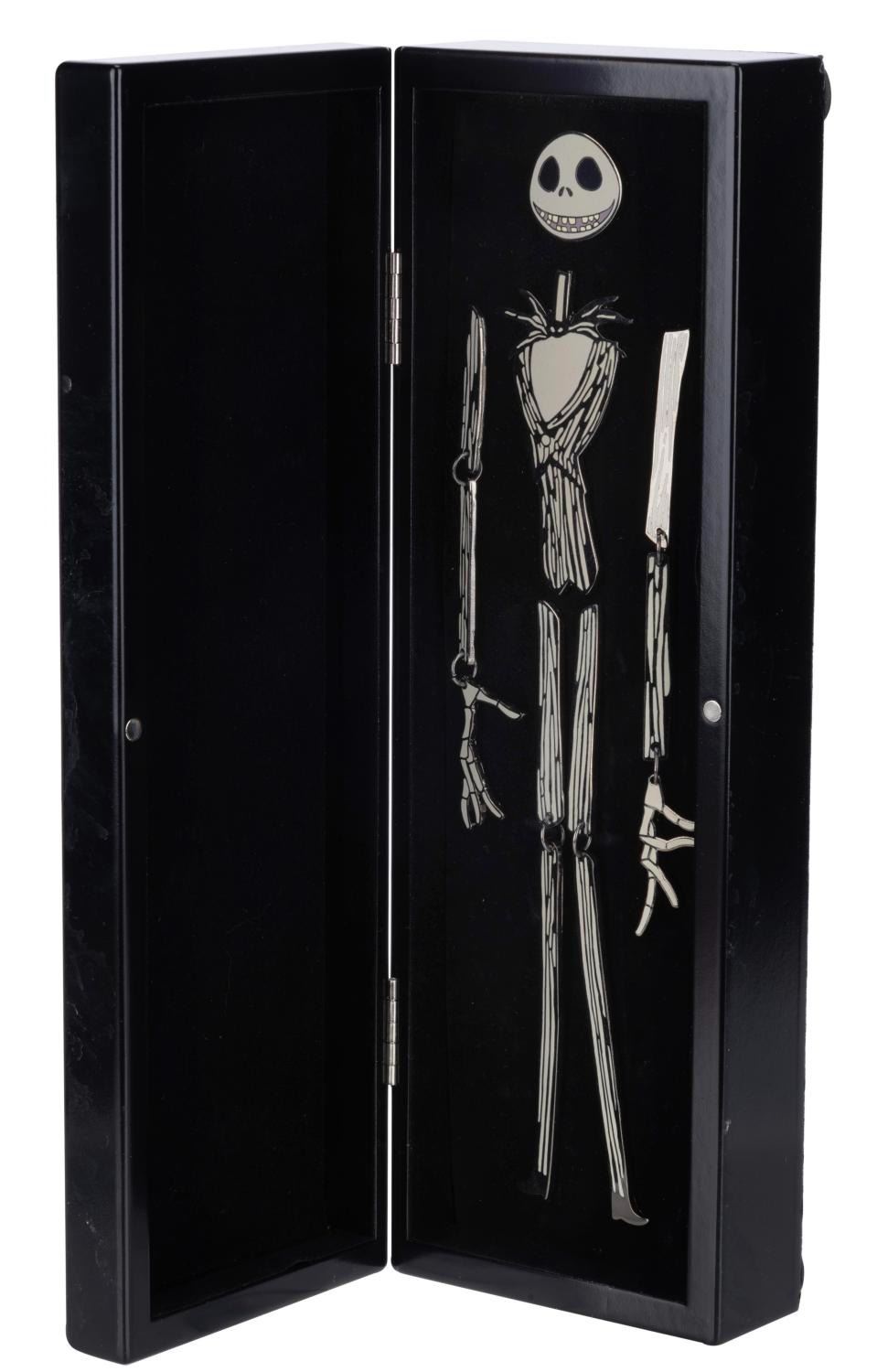(Disney Catalog, 2003) A limited edition Jack Skellington Puzzle Pin figure, commemorating the 10th anniversary of "Tim Burton’s The Nightmare Before Christmas." The enamel articulated eight pin set was released exclusively through The Disney Catalog in an edition of 2,500. Measuring from 1" in diameter to lengths of 3", each pin is in fine condition within the original 11.25" x 3.75" x 2" deep wooden box with a commemorative plaque. The box is in very good condition with two faint scratches to the top.