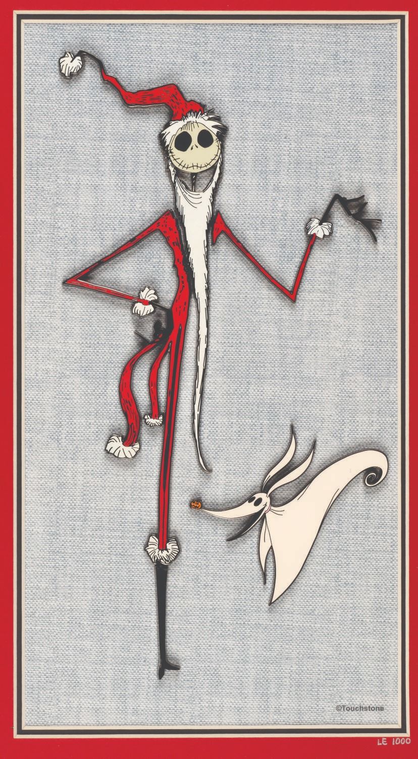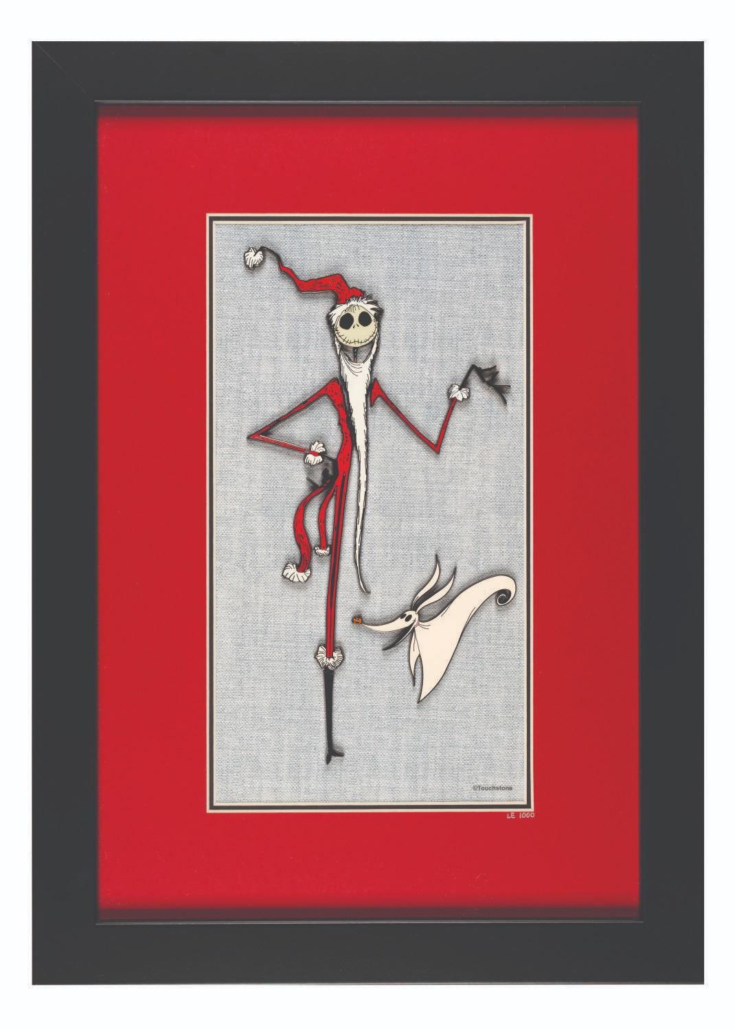 (Disney, 2004) A framed “The Nightmare Before Christmas” five-piece pin set depicting Jack Skellington as “Sandy Claws” and Zero. Four pins combine to form Jack, while one forms Zero. This set was released in a limited edition of 1000 and features “LE 1000” written in silver marker on the red matte. Ranging in size from 1.75” long to 6.5” long in a 6” x 11.5” opening of a 13.25” x 18.5” framed matte, the pin set displays in fine condition with light scratches on the glass.
