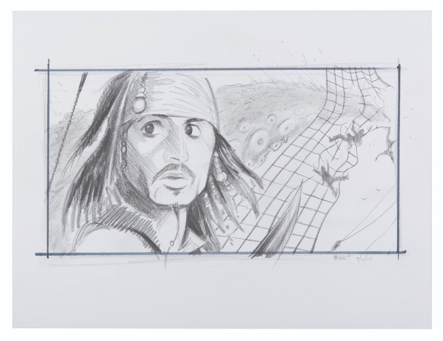 (Disney, 2004) A "Dead Man’s Chest” storyboard drawing of Captain Jack Sparrow during the epic Kraken battle aboard the Black Pearl. The film’s creative consultant and storyboard artist, James Byrkit, accomplished the drawing in graphite. Measuring 11” x 17”, the drawing is in fine condition.