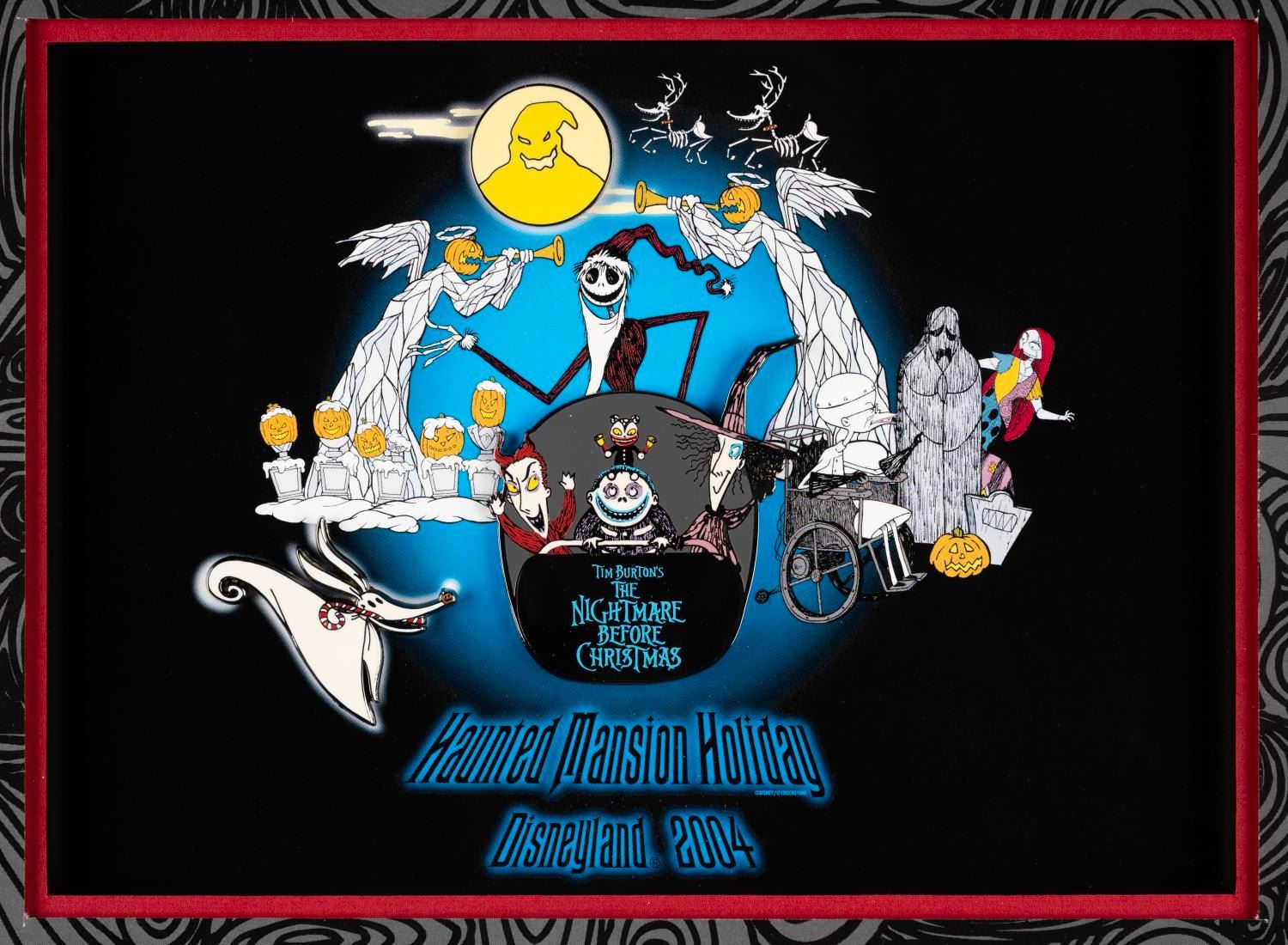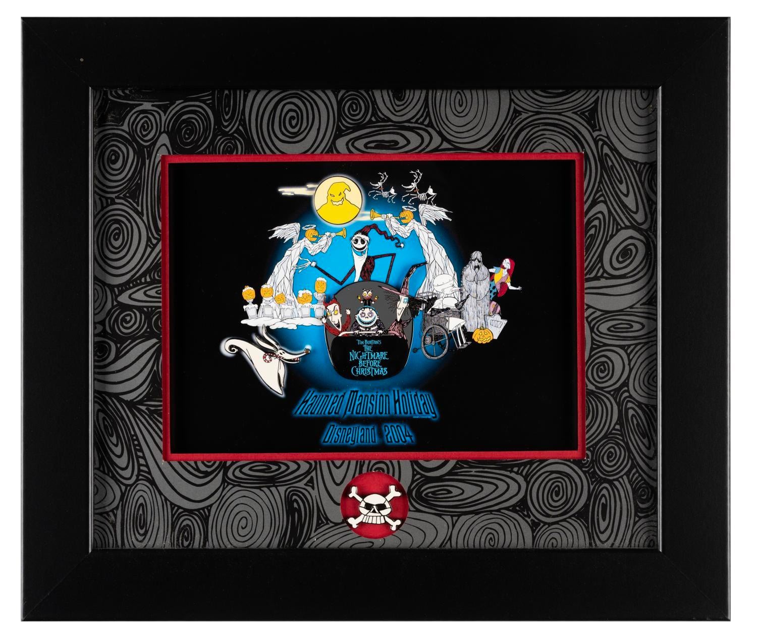 (Disneyland, 2004) A "Jack's Haunted Holiday Gathering" framed 4-pin set including Oogie Boogie, Zero, and Lock, Shock & Barrel in a Doom Buggy. A fourth skull and crossbones pin is in the matte. The set was released in an edition of 500 during the Haunted Mansion Holiday at Disneyland In 2004. Measuring 12.25" x 10.5", the piece is in very good condition with a few light scuffs on the frame, and its Certificate of Verification on the reverse.