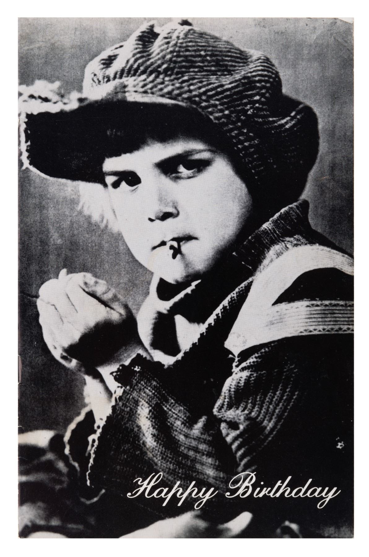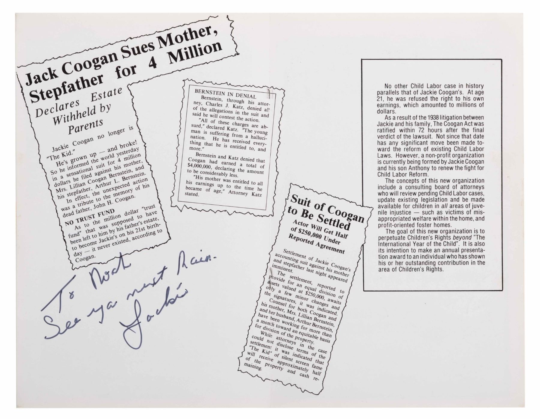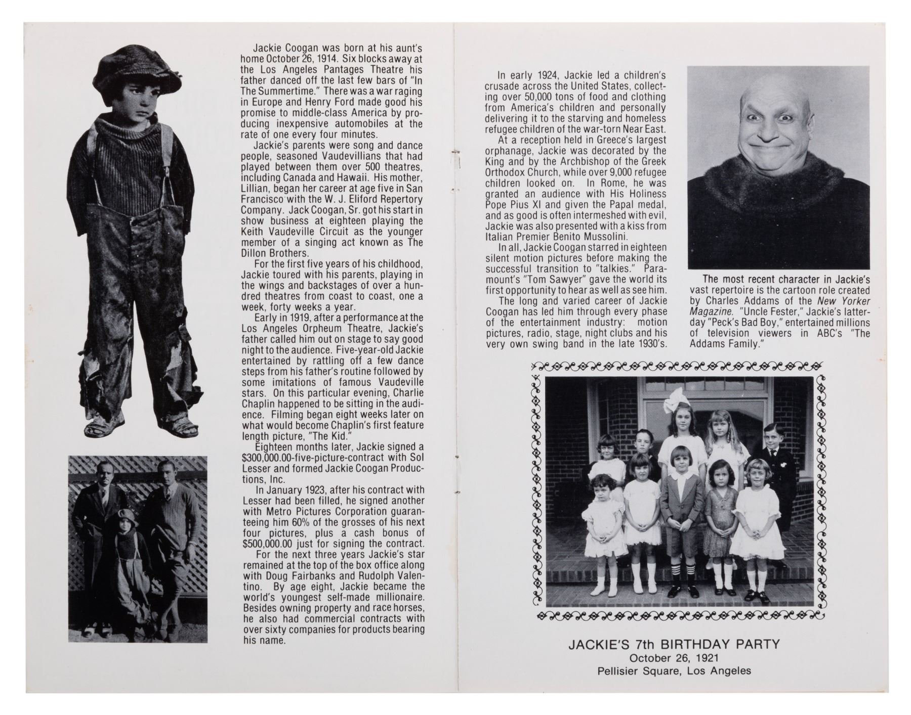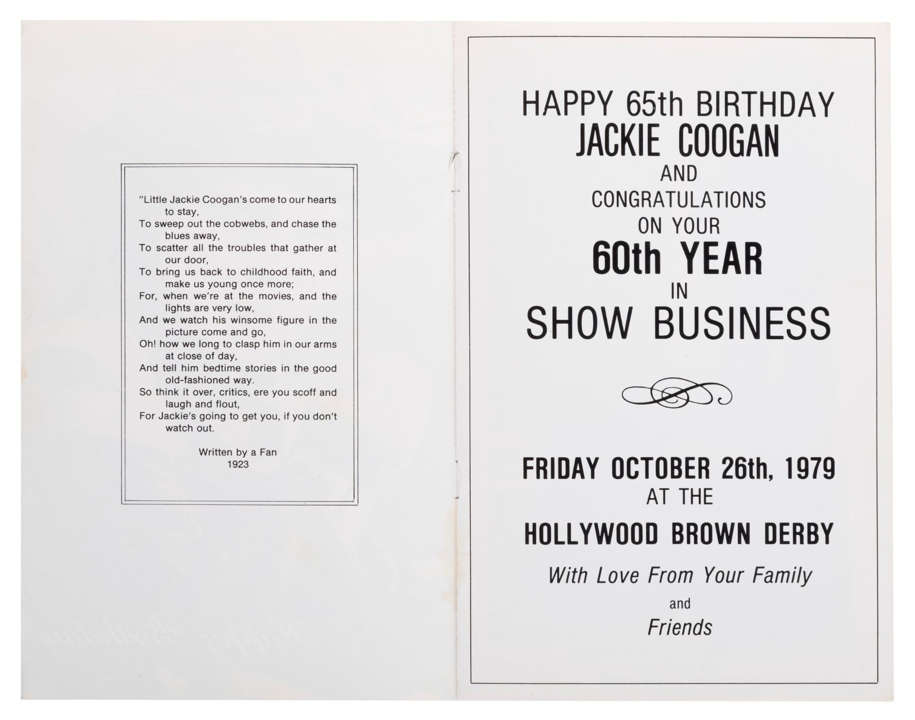 (Jackie Coogan, 1979) A five-page birthday booklet celebrating actor Jackie Coogan's 65th birthday, signed by Jackie, known for his role in Charlie Chaplin's "The Kid" and as Uncle Fester in the 1960s "The Addams Family." Measuring 5.5" x 8.5", the booklet is in good condition with light soiling, edge wear, creasing, and a loose staple.