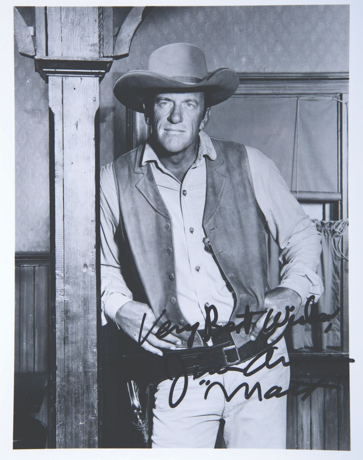 (James Arness, 2000) A signed publicity photo of actor James Arness in his most famous role, Marshal Matt Dillon on Gunsmoke. Measuring 8"x10", the photo and autograph are in fine condition.
