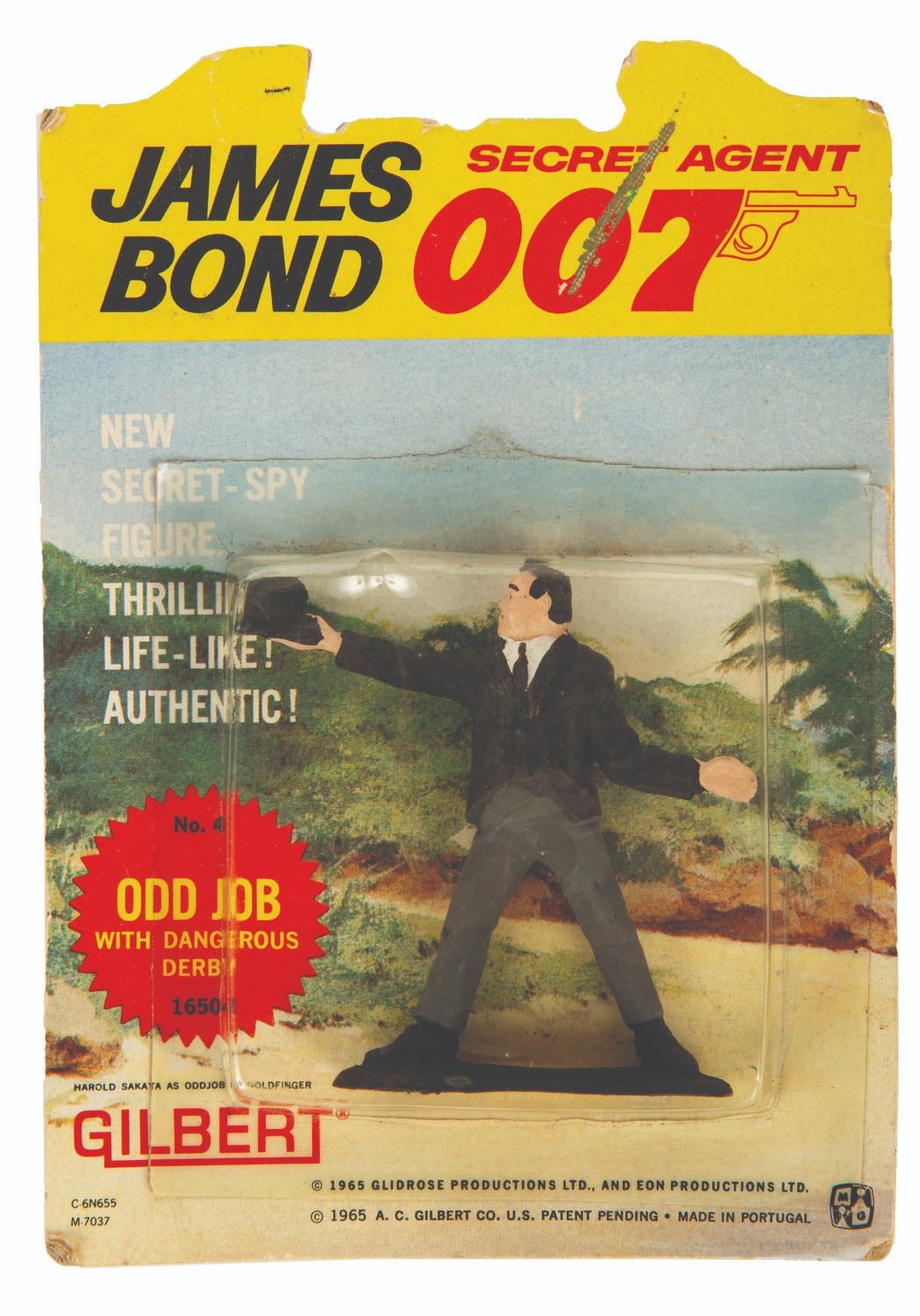 (Gilbert, 1965) A James Bond Secret Agent 007 Oddjob with Derby figure by Gilbert. Measuring 3" x 3", the figure is in fine condition, sealed on the 5" x 7" fair condition card with scratches, creases, overall wear, and the peg hole for display torn.