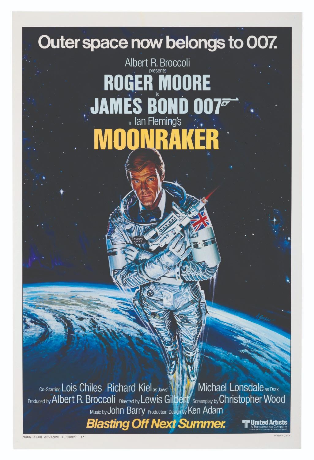 (United Artists, 1979) An original advance release one-sheet for "Moonraker." The space-themed film starring Roger Moore as James Bond was the franchise’s answer to the success of "Star Wars." Measuring 27" x 41", the poster displays in very good condition with light edge wear and creasing.