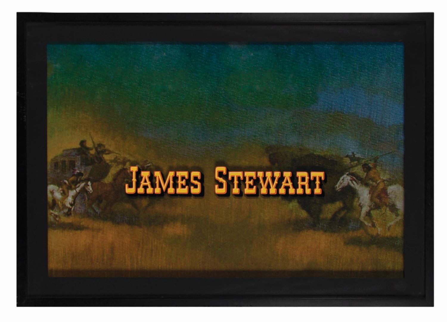 (MGM, 1962) An original James Stewart opening title credit from “How the West Was Won.” Along with Jimmy Stewart, the star-studded cast included Henry Fonda, Karl Malden, Debbie Reynolds, and John Wayne. Although very similar to the screen-used credit, the production ultimately opted for an alternate version where Stewart’s first and last names were stacked. Accomplished in enamel on glass, the hand-painted title has been matted and framed with a color reproduction background. With an image size of 18.25” x 28.25” in a 23.25” x 33.5” frame, the piece is in very good condition with spots of paint loss, paint cracks, and scratches, while the frame displays in good condition with scratches, scuffs, and wear. This item requires special shipping arrangements. Please inquire before bidding.