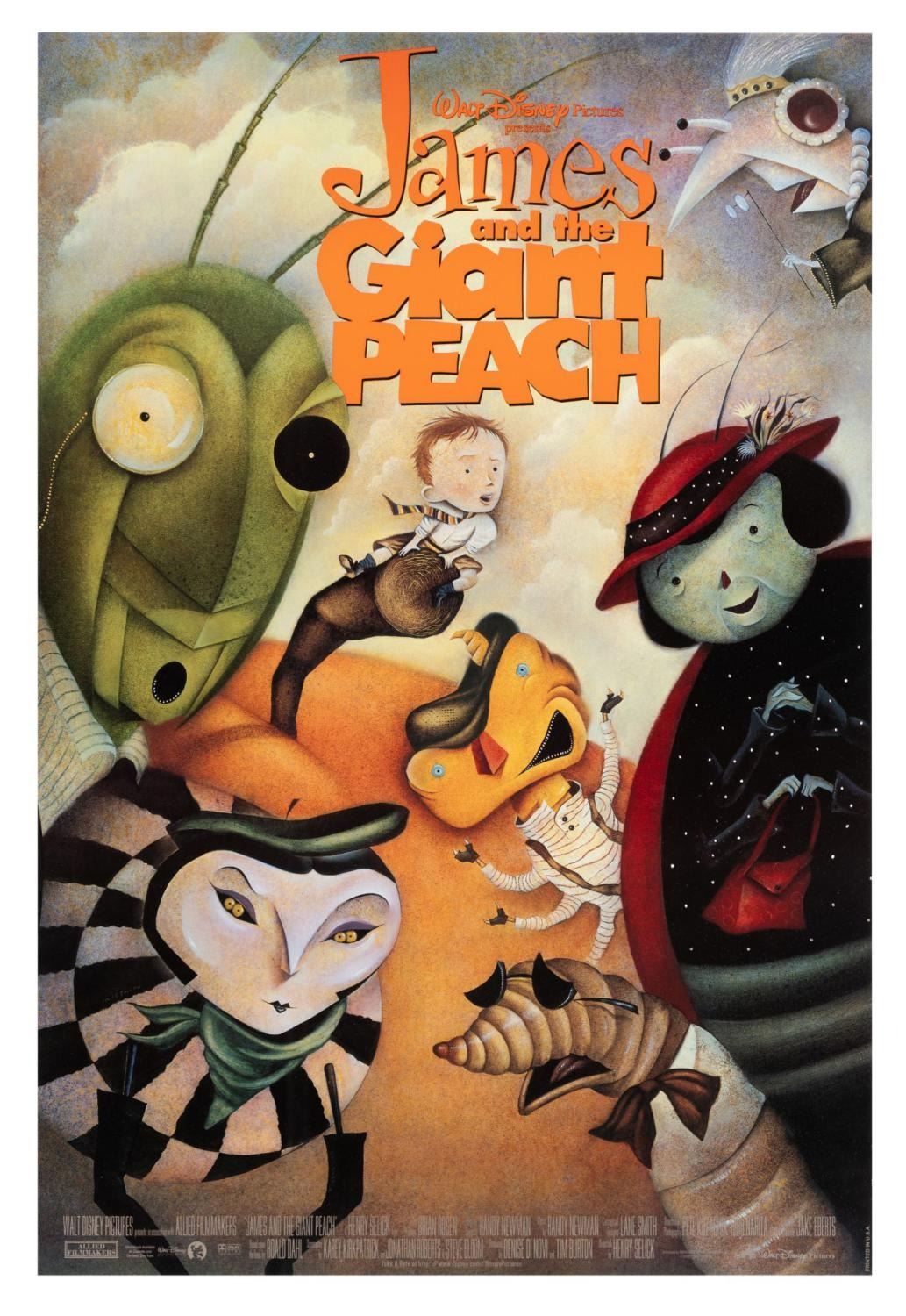 (Disney, 1996) A theatrical one-sheet for Disney's stop motion animated feature "James and the Giant Peach." The poster features artwork by Lane Smith, whose illustrations for the book were the basis of the film's design. Measuring 27" x 40", the poster is in very good to fine condition.