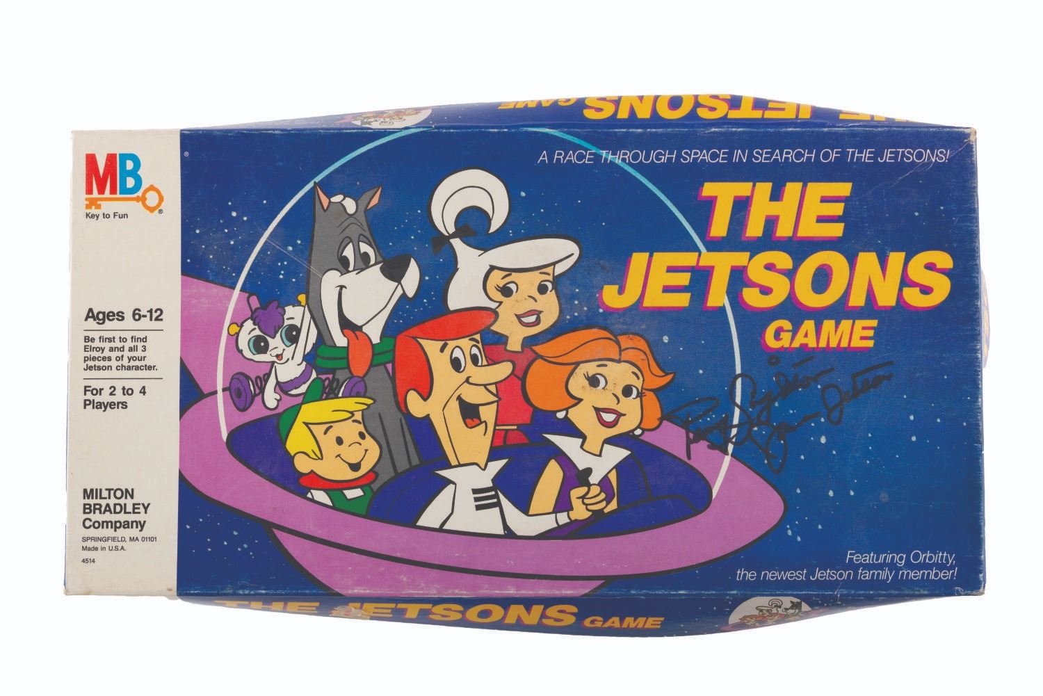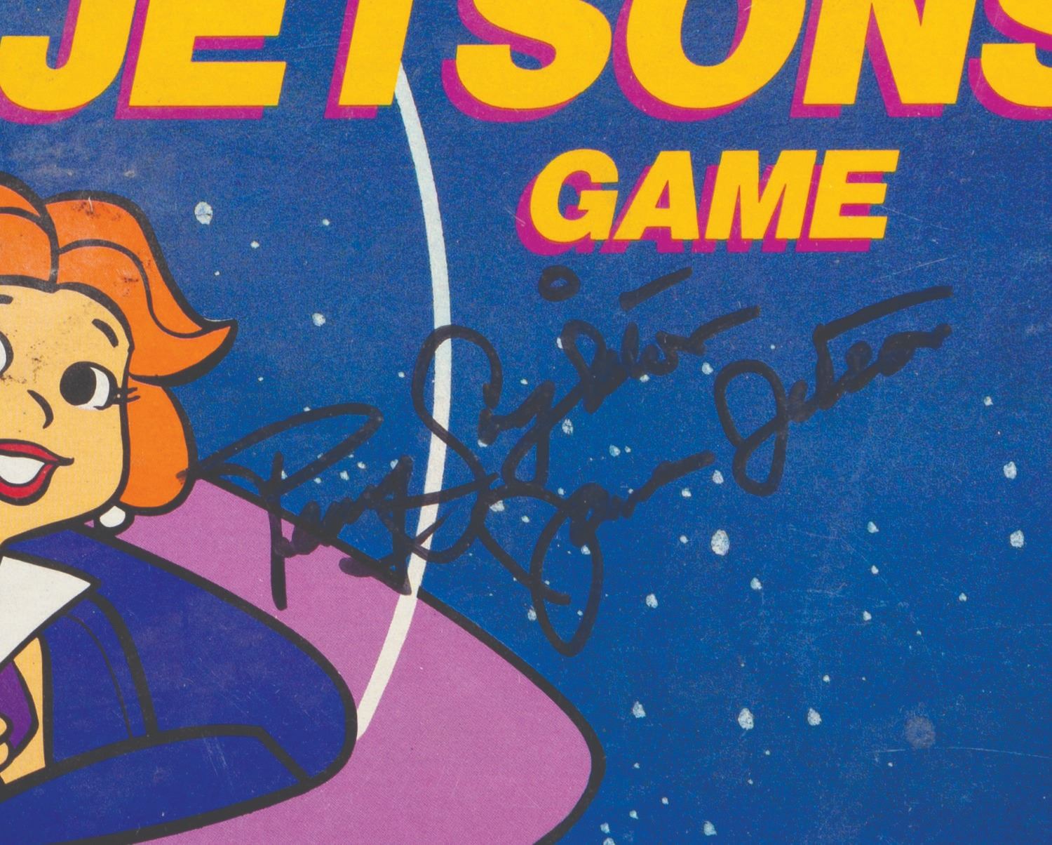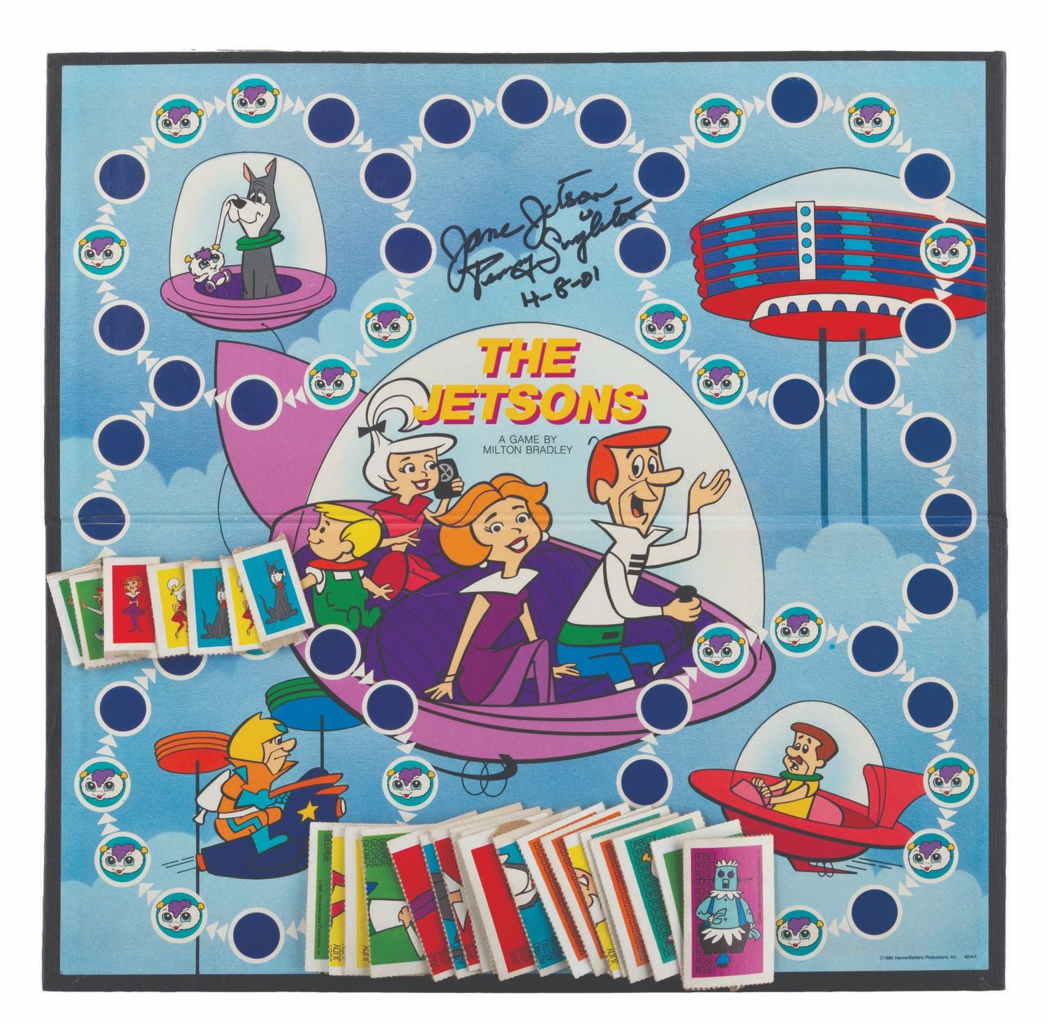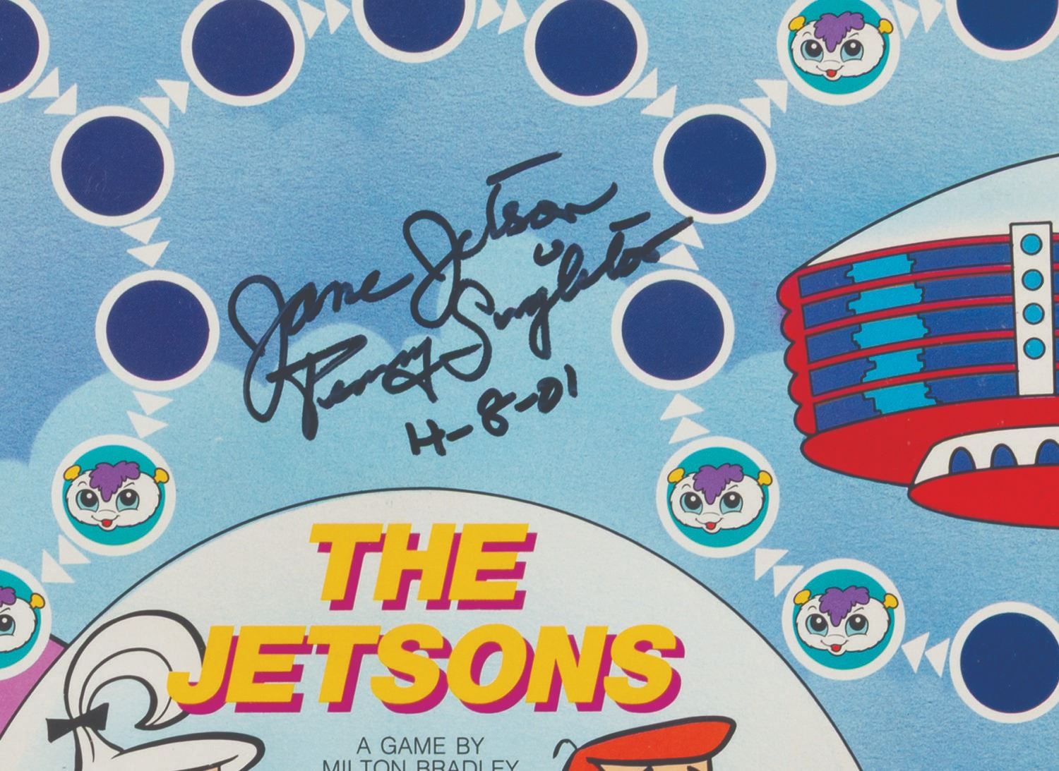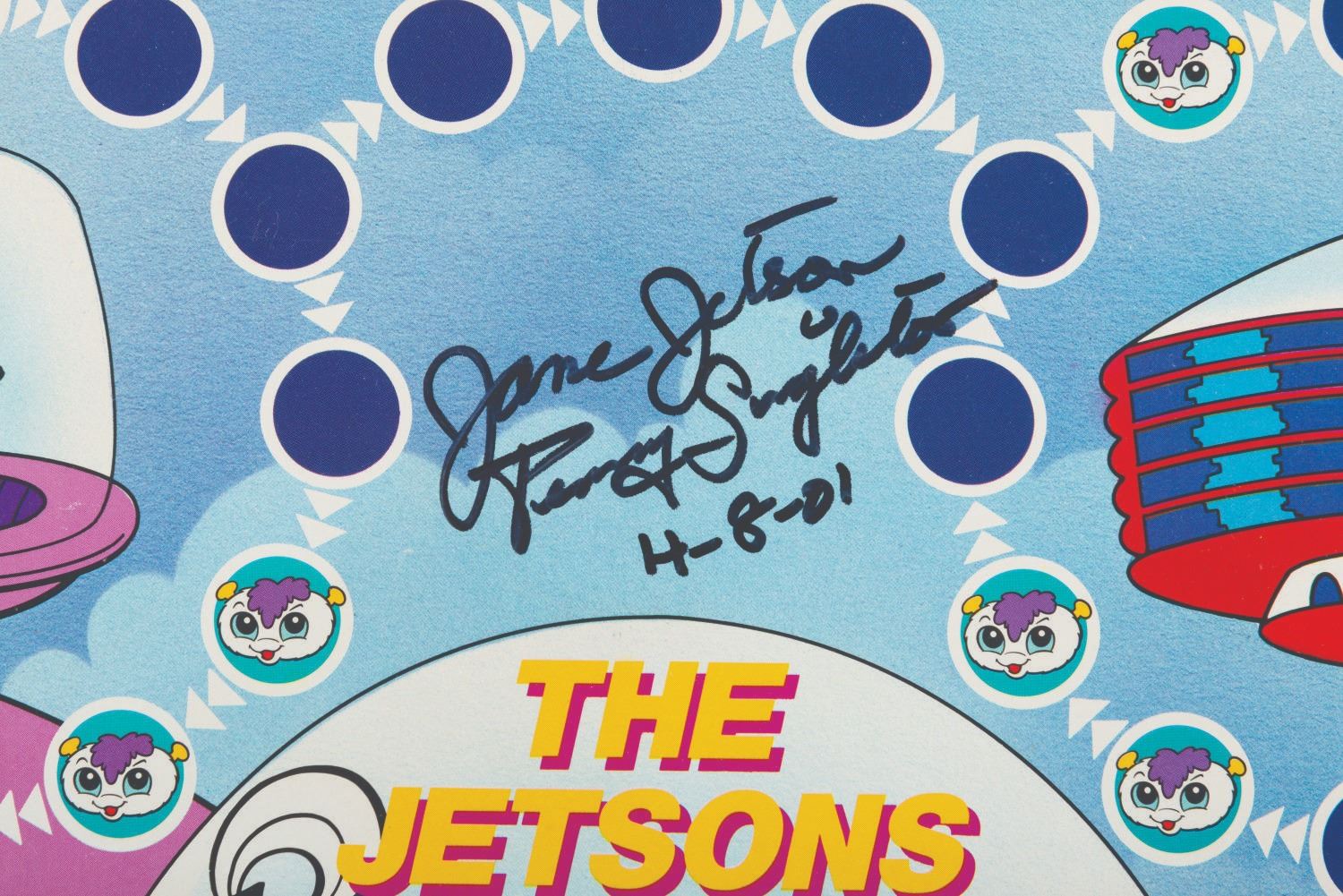 (Milton Bradley, 1985) A The Jetsons board game, signed on the box and board by Penny Singleton, the voice of Judy Jetson. The game is nearly complete, missing the dice and the plastic base for one player token. The signed board is in very good condition, with the box in fair condition, with heavy creases and crushed on the right side.