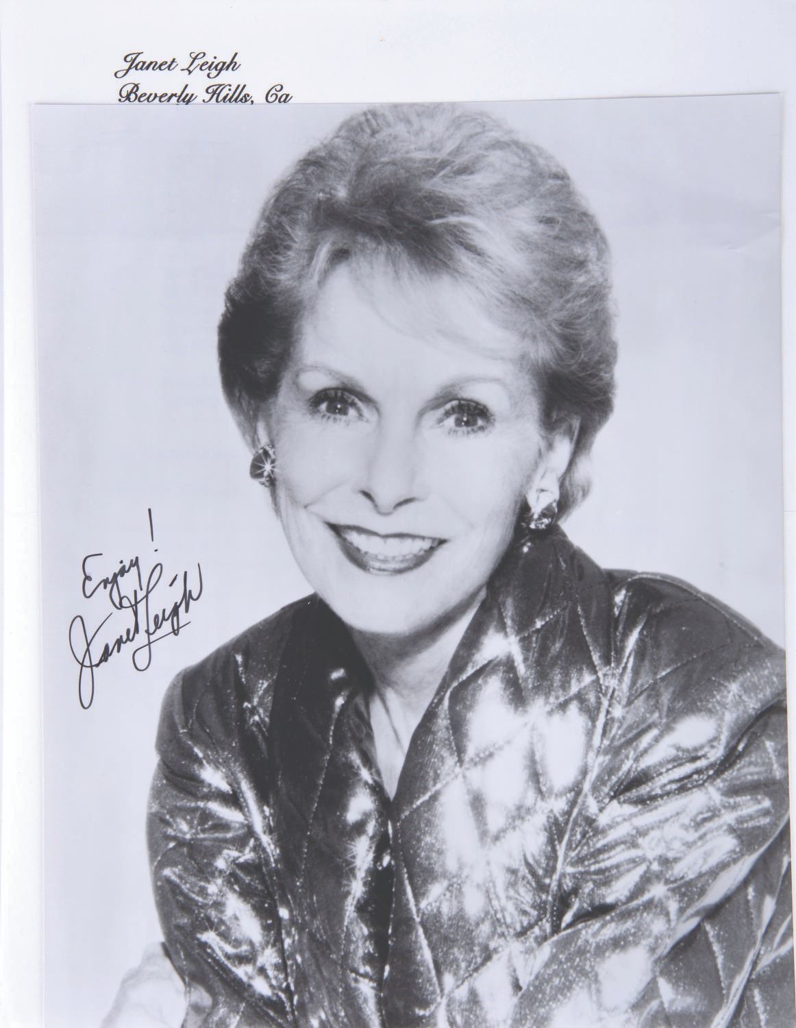 (Janet Leigh, 2000) A publicity photo signed by actor Janet Leigh, best known for her role as Marion Crane in Alfred Hitchcock's Psycho. The lot also comes with a second Leigh signature on a small label. Measuring 8"x10", the signed photo is in good condition, with slight crumpling to the edges and top.