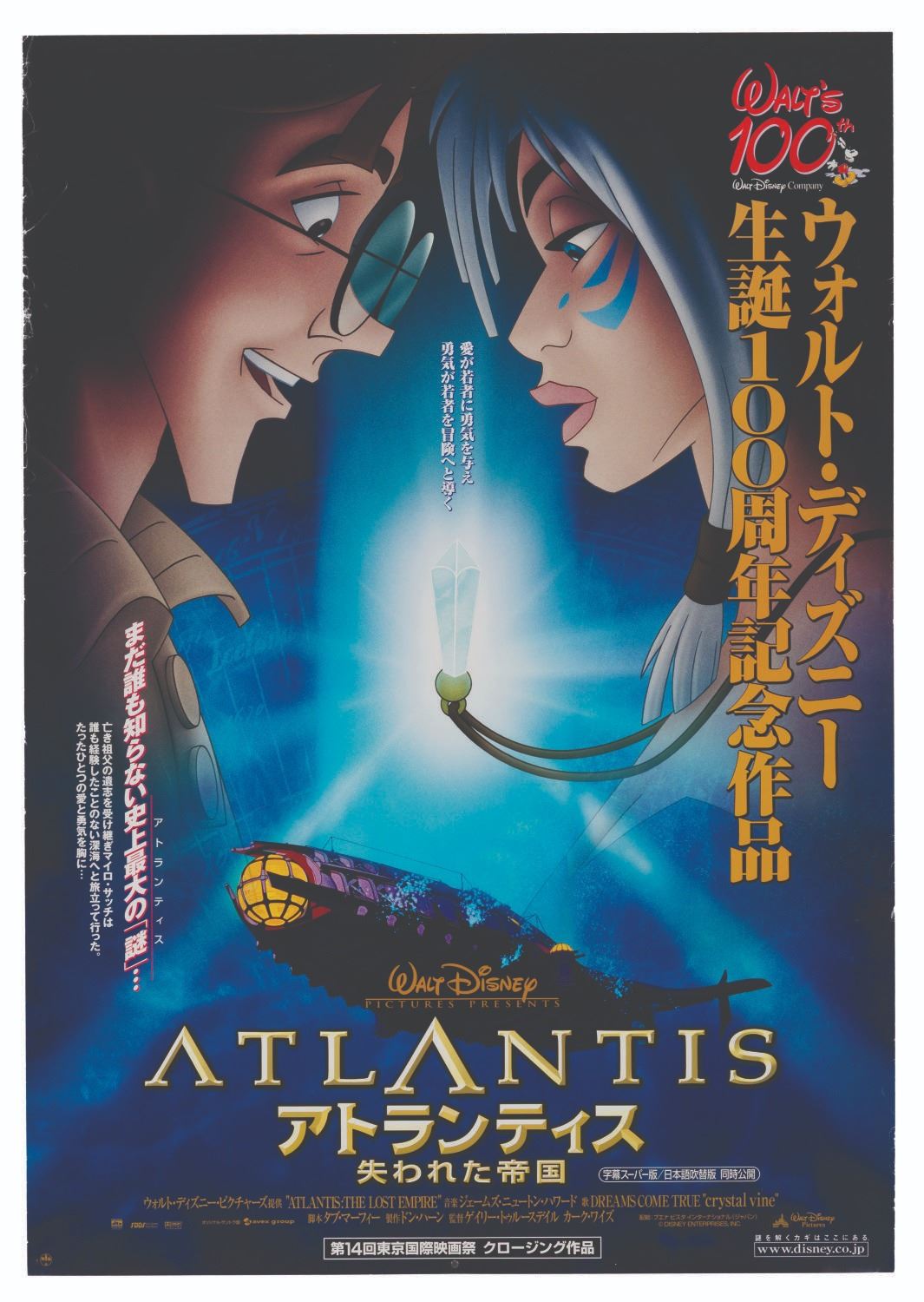 (Disney, 2001) A one-sheet for the Japanese theatrical release of"Atlantis: The Lost Empire," featuring a"Walt's 100th" logo at the top right. Measuring 28.5" x 40.5", the poster is in good condition with heavy edge wear, creases, edge tears, and scratches.