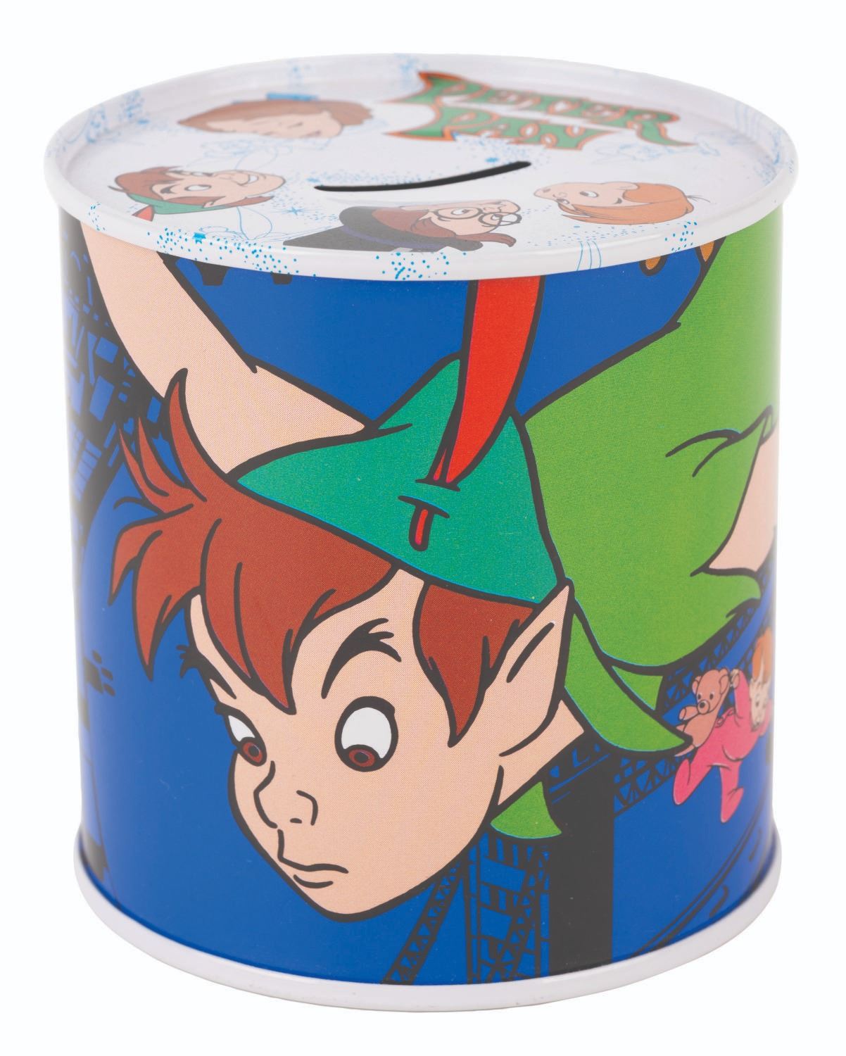 (Disney Parks, 1990s-2000s) A tin bank featuring Peter Pan and the Darling children, likely sold at Tokyo Disneyland. The bank does not have a stopper or plug on the bottom and can only be opened by cutting through the tin. Measuring 3.5" in diameter and 3.5" tall, the bank is in fine condition.