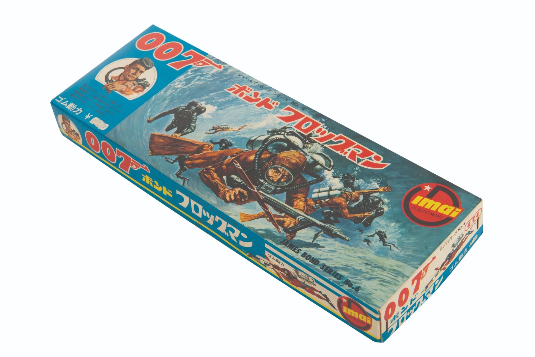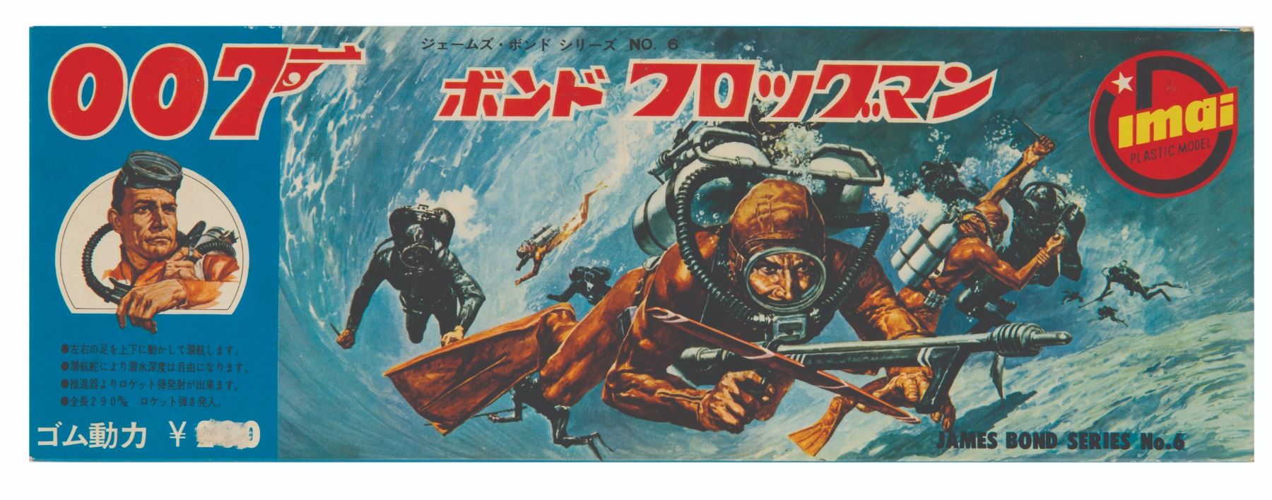(Imai, 1966) An extremely rare unused Japanese model kit of James Bond in scuba diving gear as seen in "Thunderball." The model is complete and unpunched, with the small pieces and accessories sealed in their original bags. The box measures 4.25" x 12.25" and 1.25" deep. While the price has been partially scratched off the front panel, the box and model components are in very fine condition. The original Japanese instruction sheet is also included.