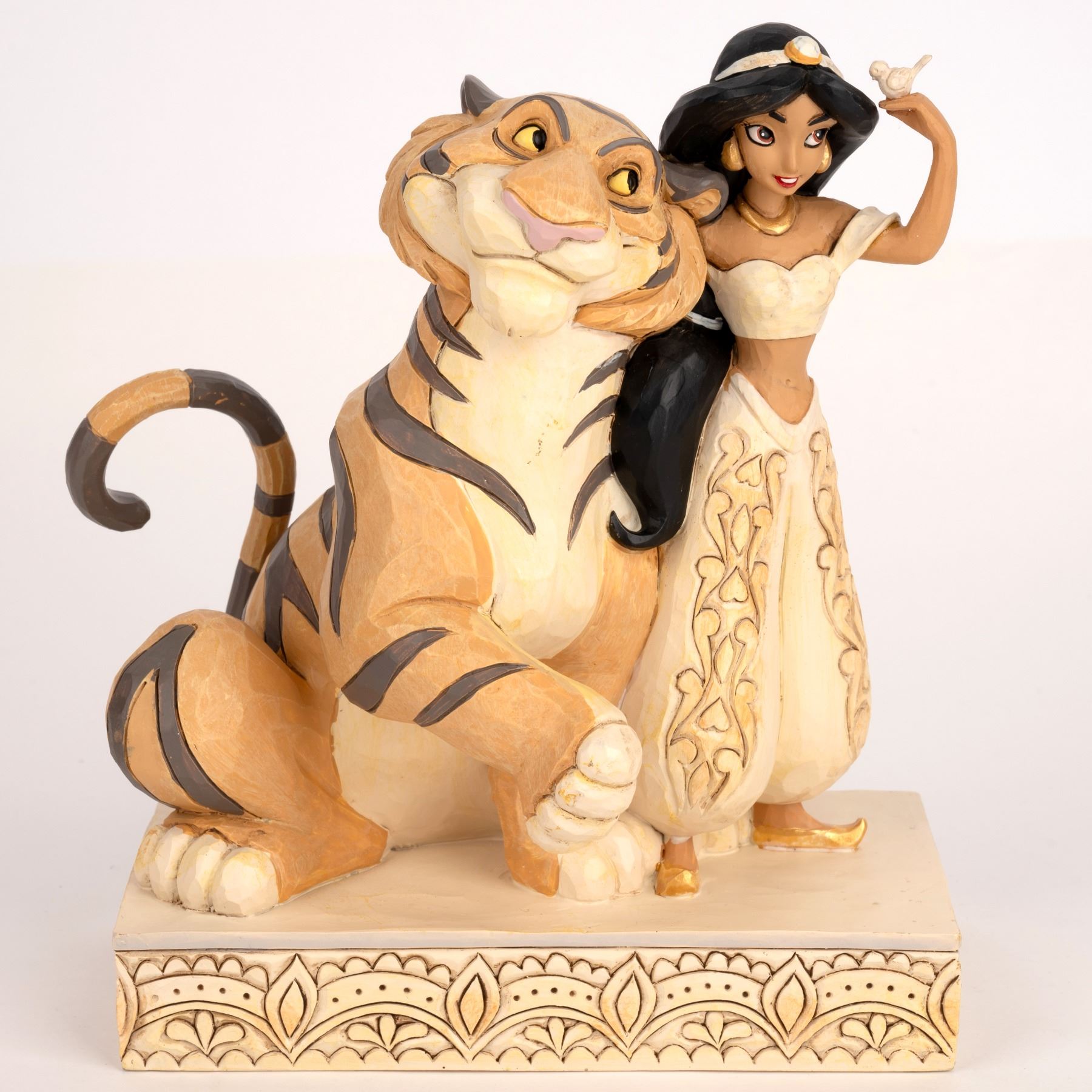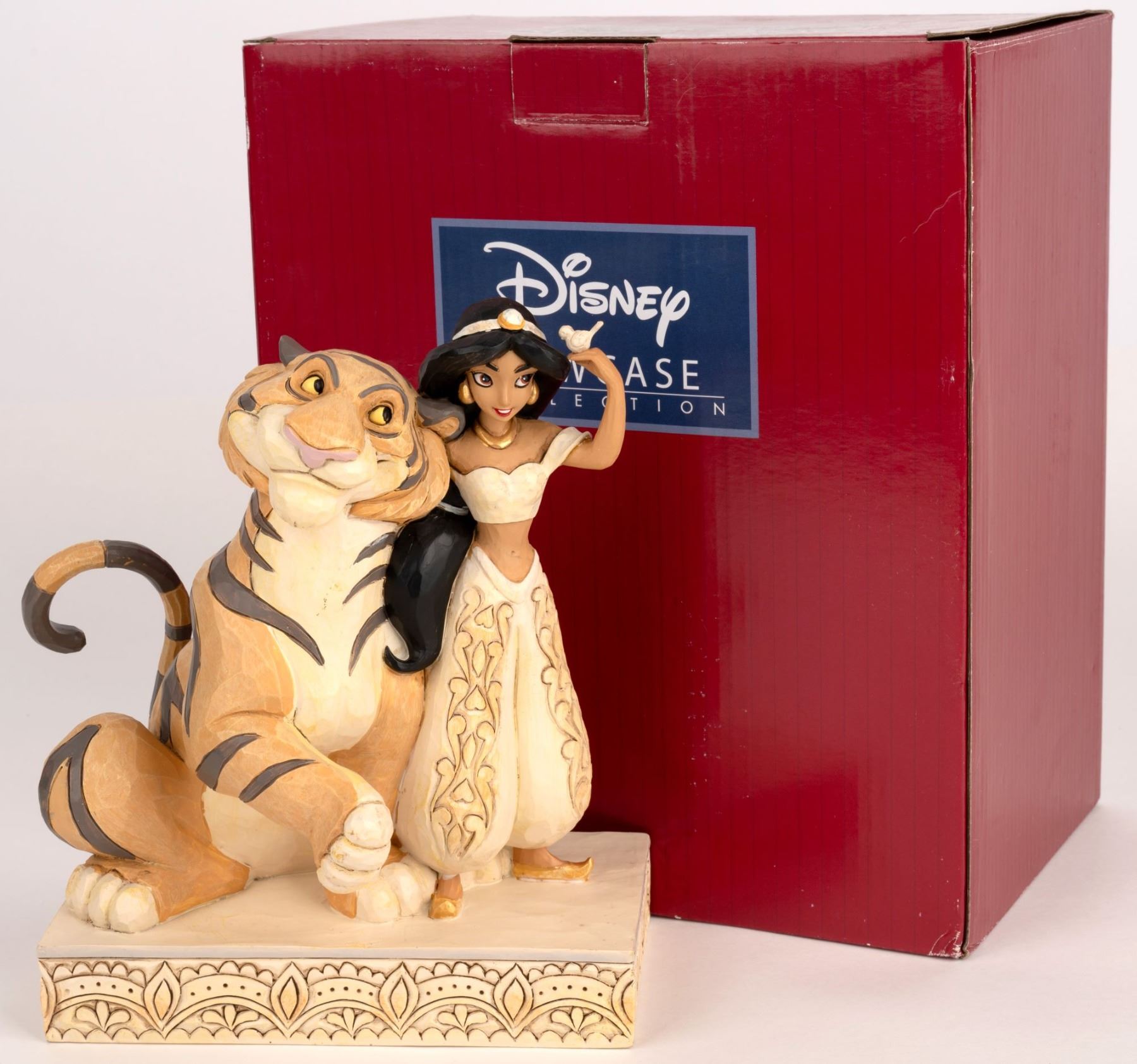 (Enesco, 2019) A Disney Traditions figurine of Jasmine and Rajah from “Aladdin." Titled “Wondrous Wishes", the resin figurine was designed by Jim Shore and released as part of the Disney Showcase Collection. Measuring 4.25" x 6.5" and 7.25" tall, the figurine is in fine condition and comes with the original 8.5" x 5.5" x 9.75" box.