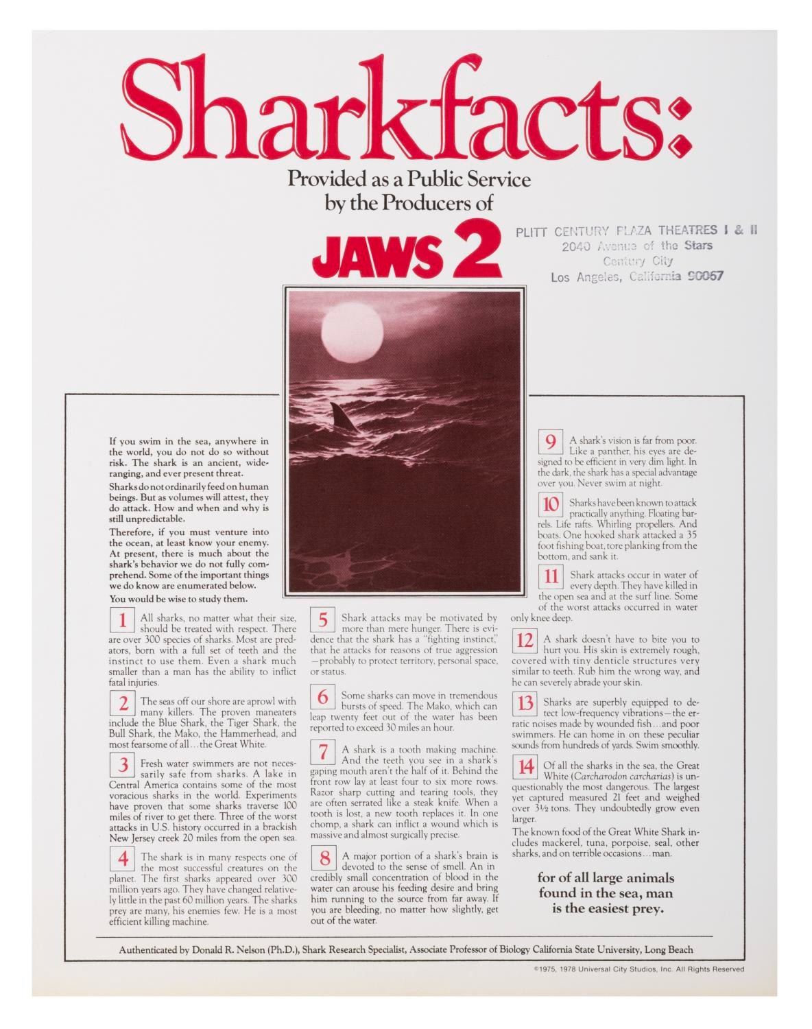(Universal, 1978) A "Jaws 2" Sharkfacts tear sheet, stamped by the Century Plaza Theatres in Century City, Los Angeles, California. Measuring 8.5" x 11" the sheet is in fine condition, with very slight discoloration to the bottom edge from age.