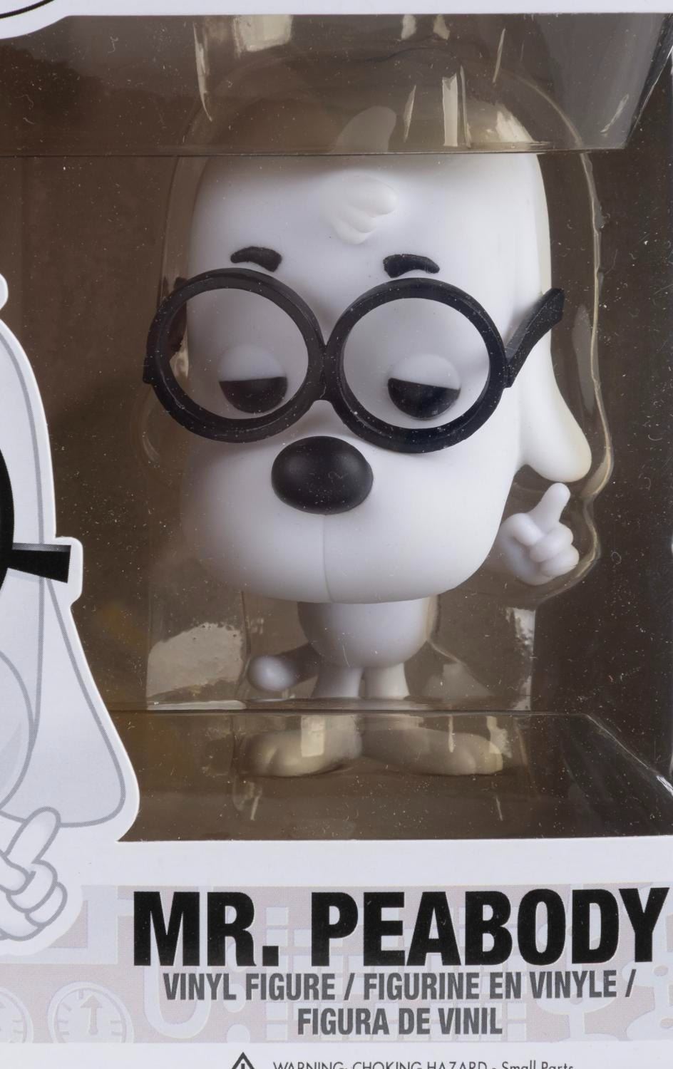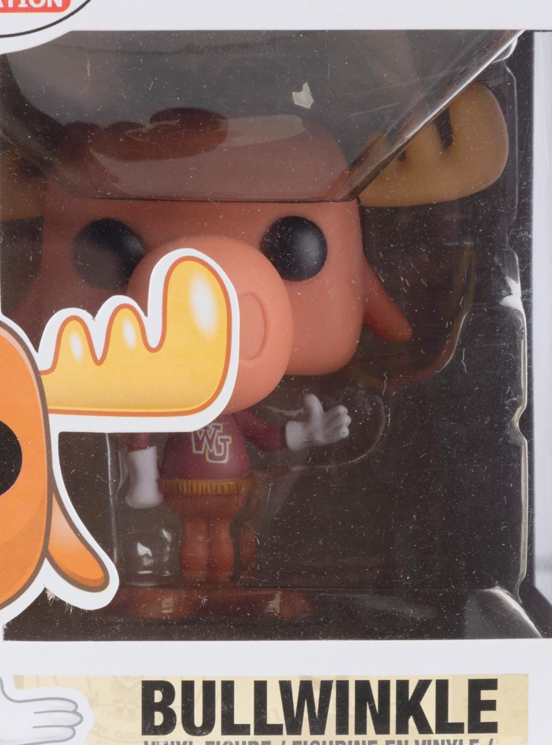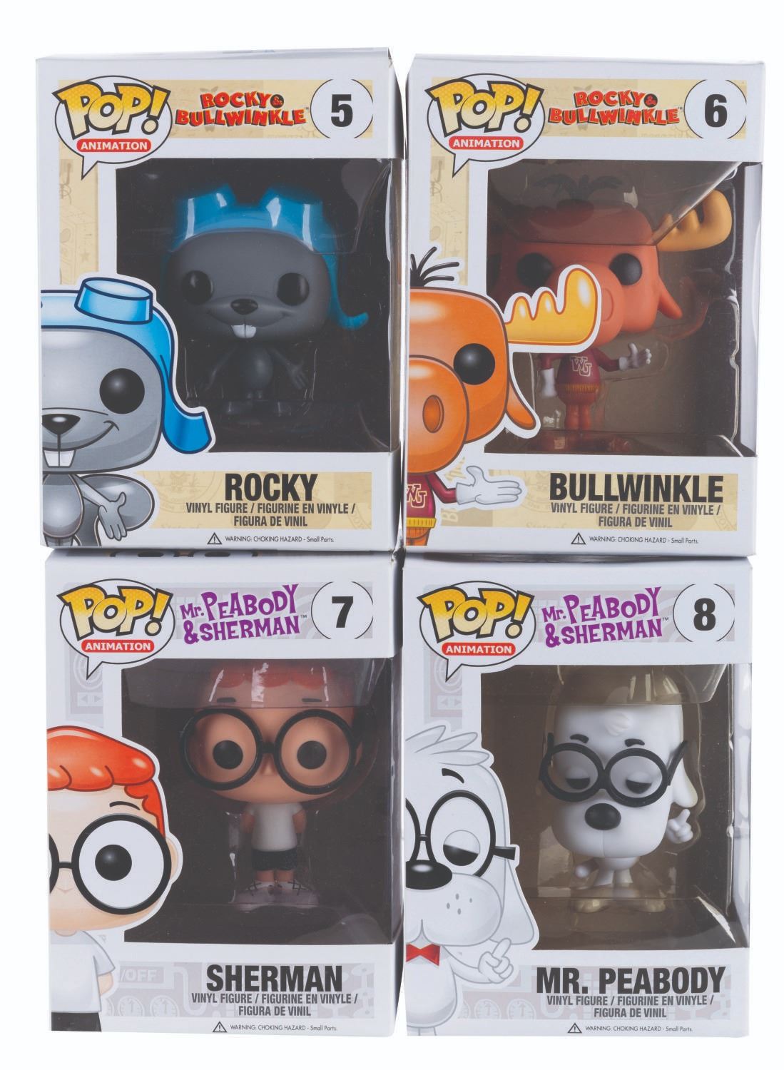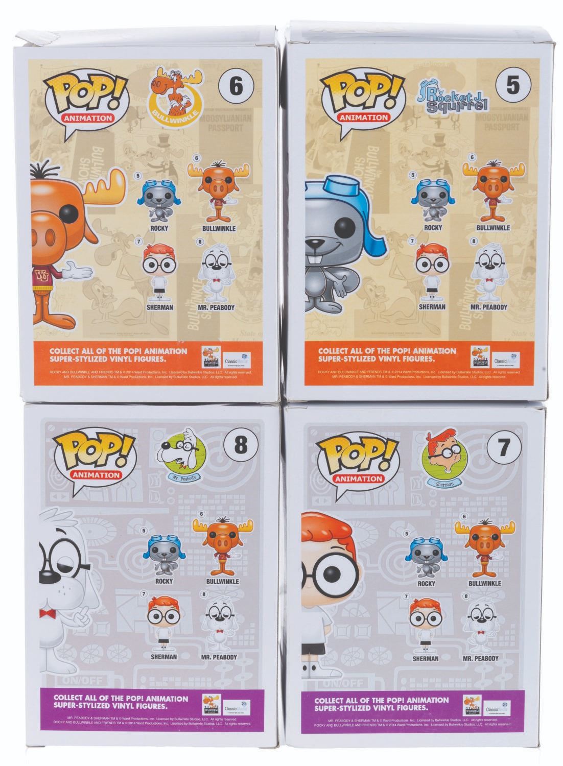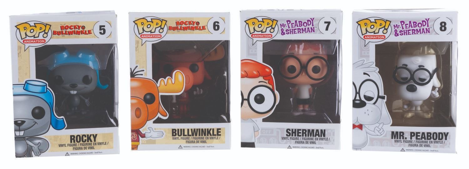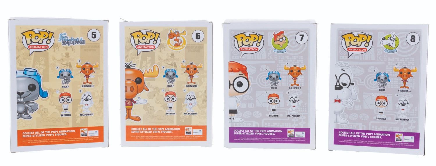 (Funko, 2014) Four Funko POP! figurines of Jay Ward Productions characters including Rocky, Bullwinkle, Mr. Peabody, and Sherman. Measuring 4.5” x 3.5” x 6.5” tall each in the original boxes, the figures are in fine condition, while their boxes are in good to very good condition with light wear, creases, and crushing.