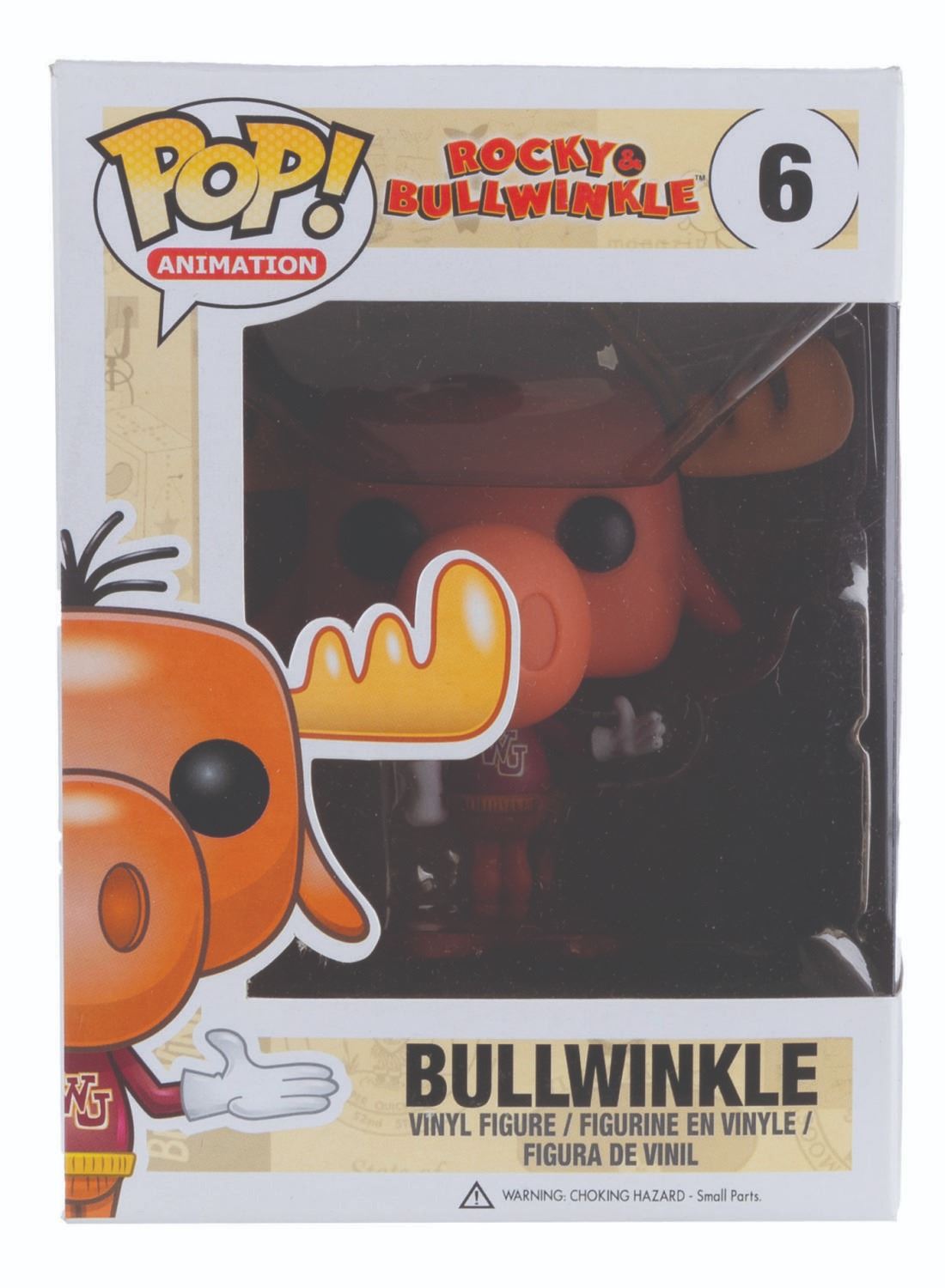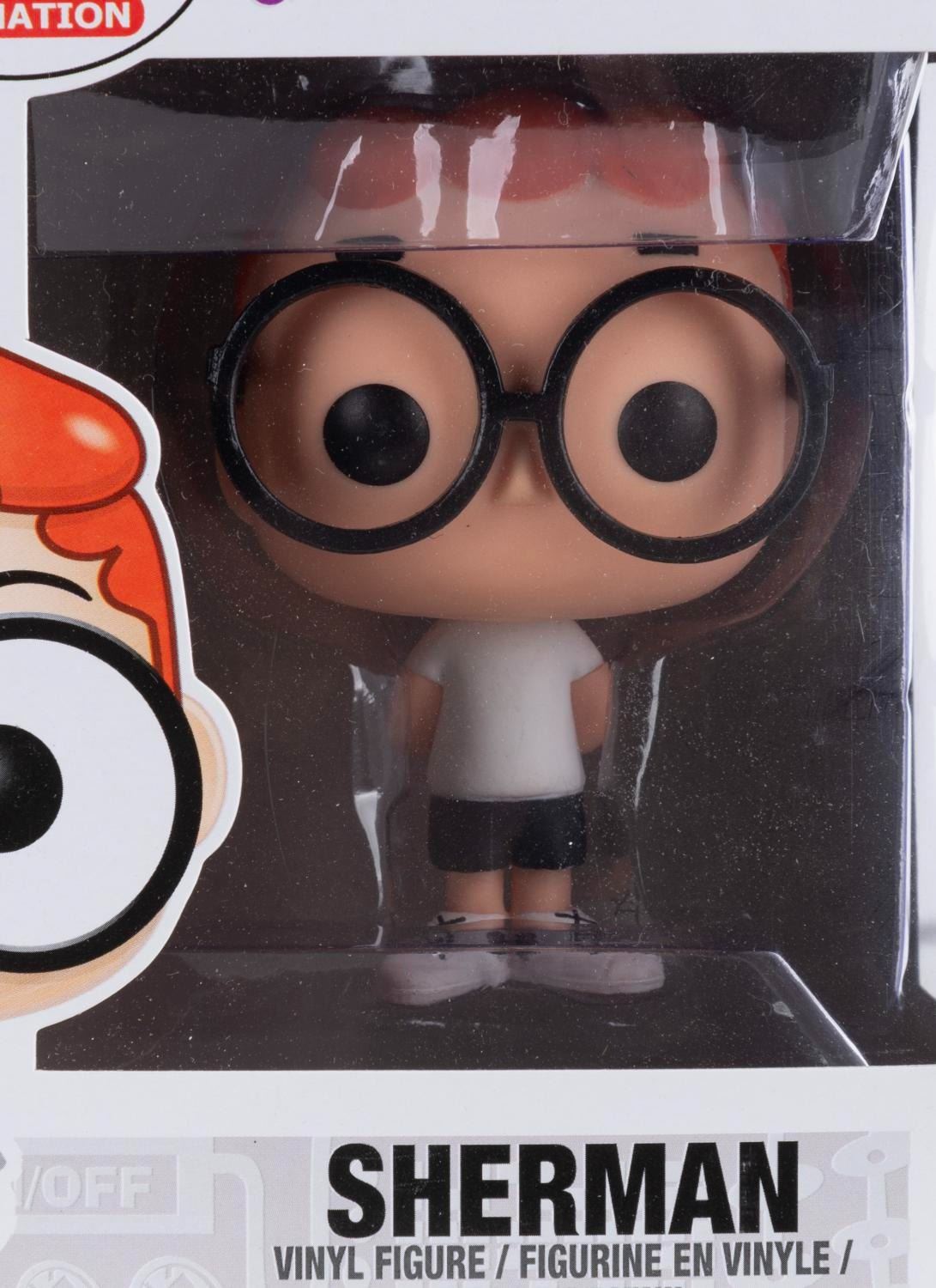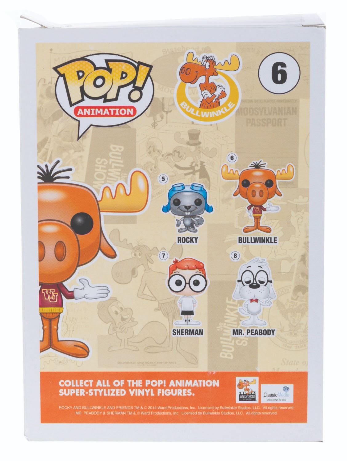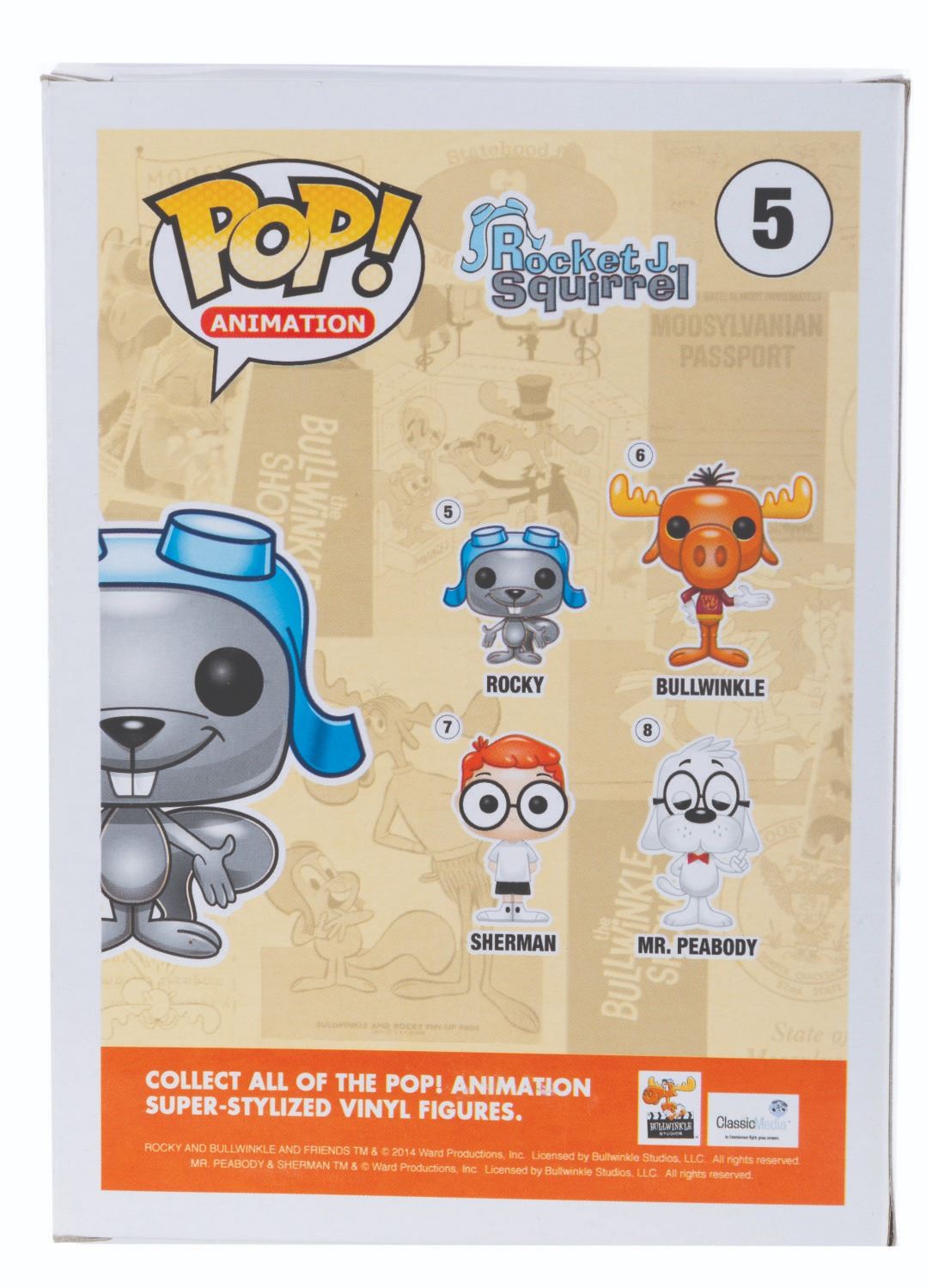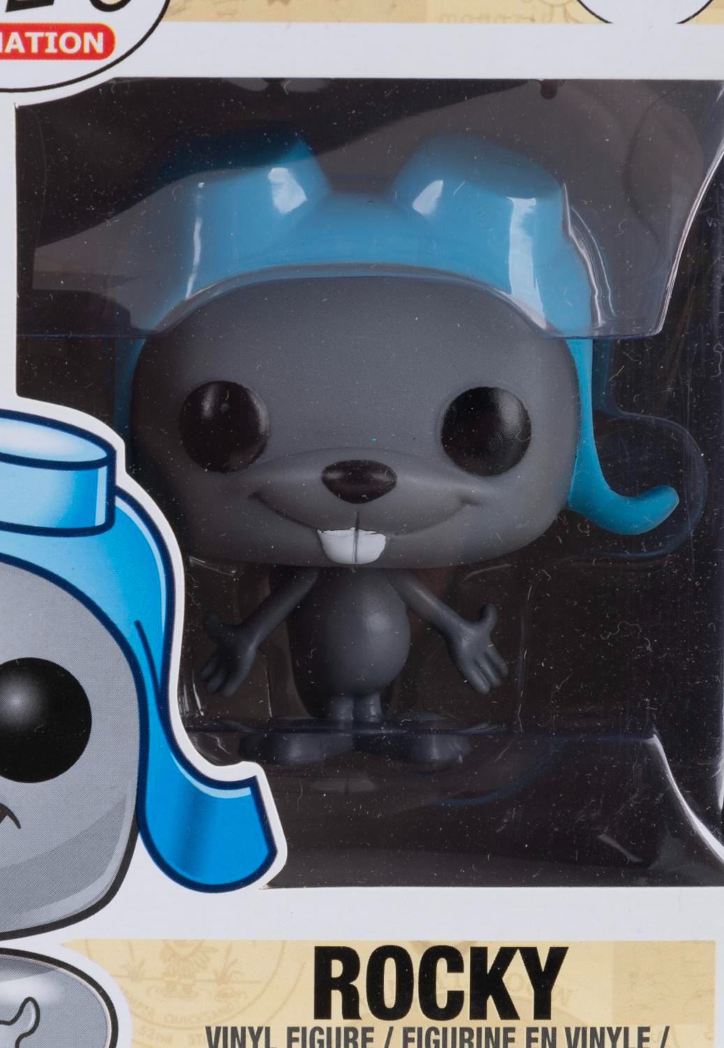 (Funko, 2014) Four Funko POP! figurines of Jay Ward Productions characters including Rocky, Bullwinkle, Mr. Peabody, and Sherman. Measuring 4.5” x 3.5” x 6.5” tall each in the original boxes, the figures are in fine condition, while their boxes are in good to very good condition with light wear, creases, and crushing.