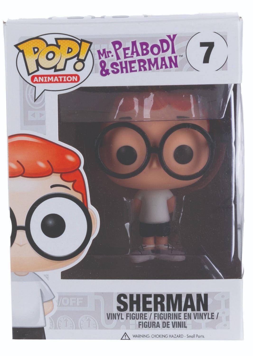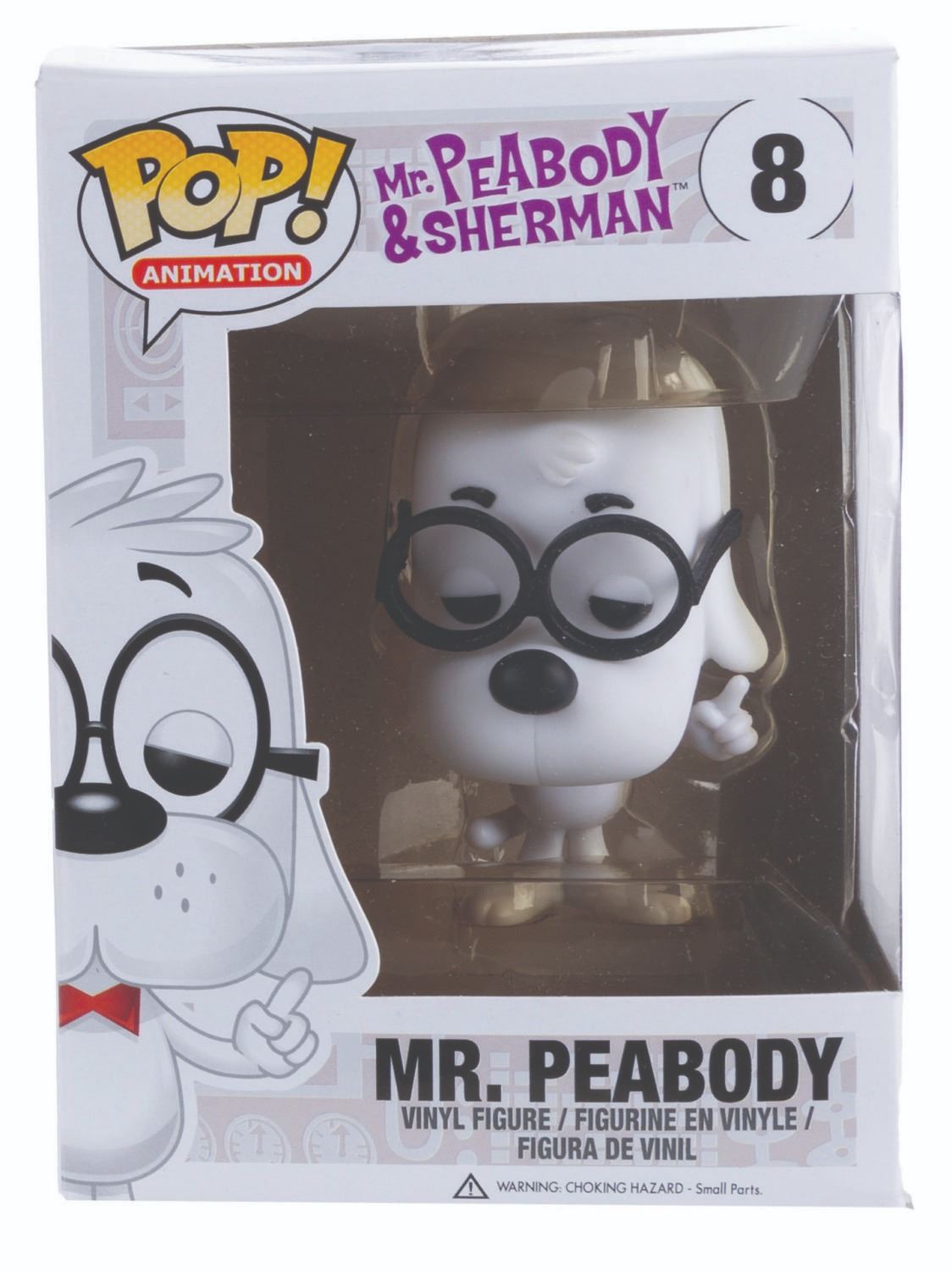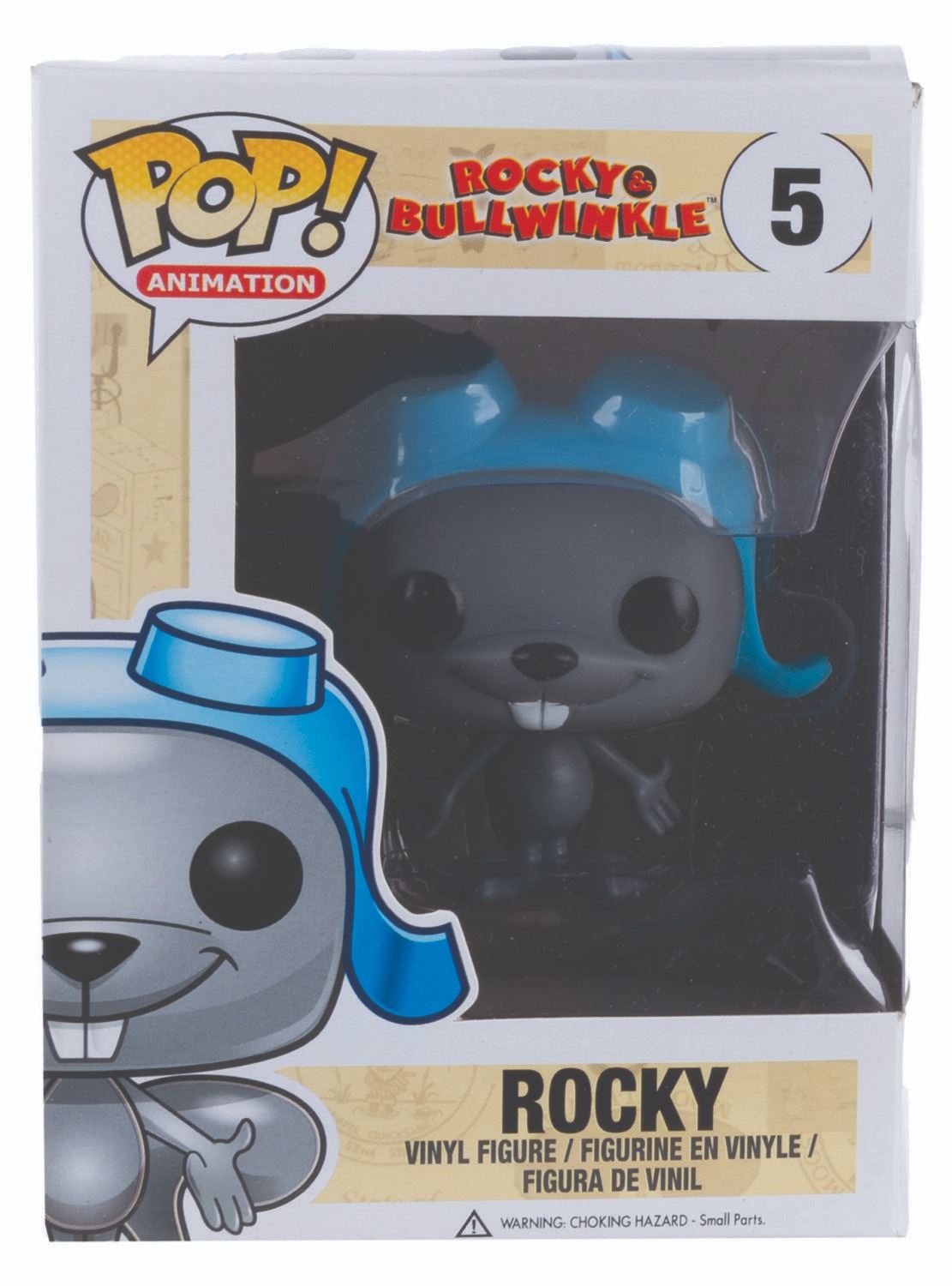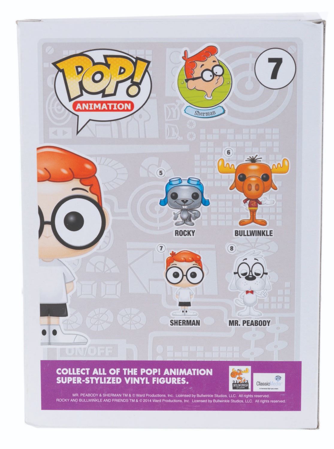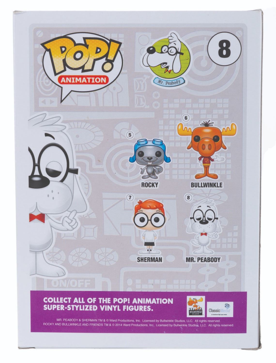 (Funko, 2014) Four Funko POP! figurines of Jay Ward Productions characters including Rocky, Bullwinkle, Mr. Peabody, and Sherman. Measuring 4.5” x 3.5” x 6.5” tall each in the original boxes, the figures are in fine condition, while their boxes are in good to very good condition with light wear, creases, and crushing.