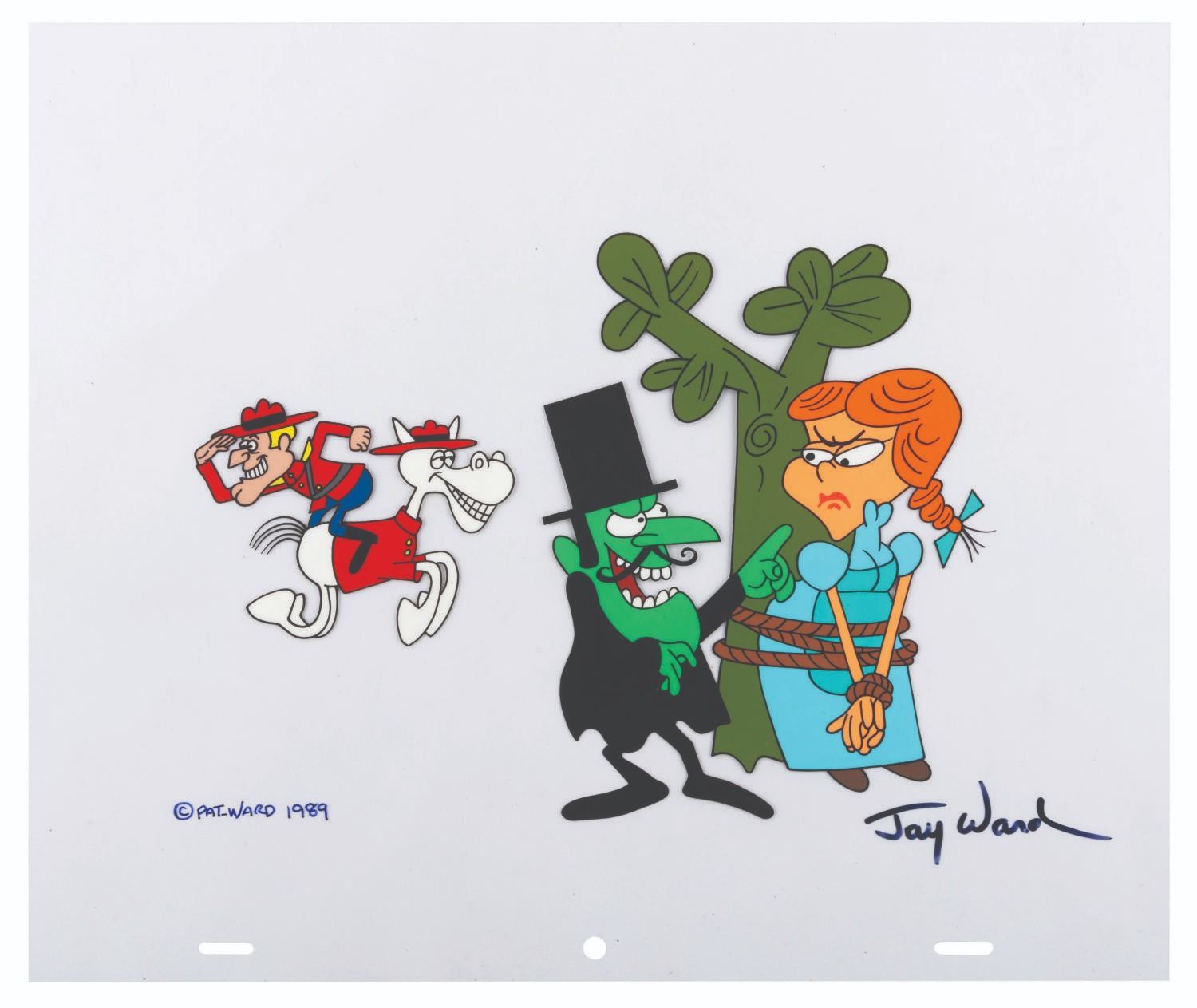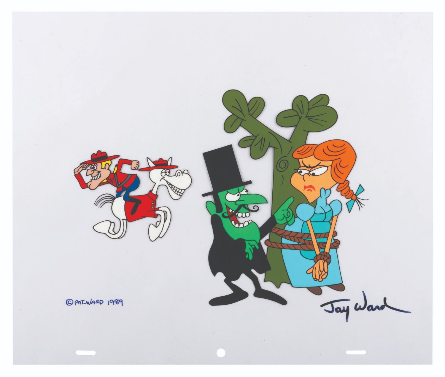 (Ward, 1989) Scene Cel #17 in the Jay Ward Productions Original Animation Scene Cels Collection, featuring Dudley Do-Right, Horse, Snidely Whiplash, and Nell, signed by Ward in black ink. The characters have an image size of 6.5" x 8.5" on a 10.5" 12.5" cel. The art displays in very good condition with scratches.