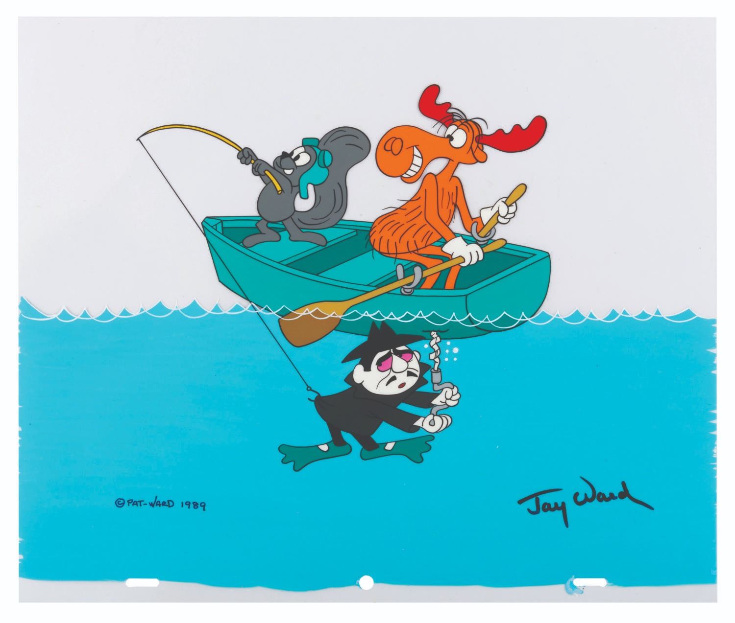 (Ward, 1989) Scene Cel #29 in the Jay Ward Productions Original Animation Scene Cels Collection, featuring Rocky, Bullwinkle, and Boris Badenov, signed by Ward in black ink. The characters have an image size of 9" x 12.5" on a 10.5" x 12.5" cel. The art displays in very good condition with light scratches and spots of paint loss.