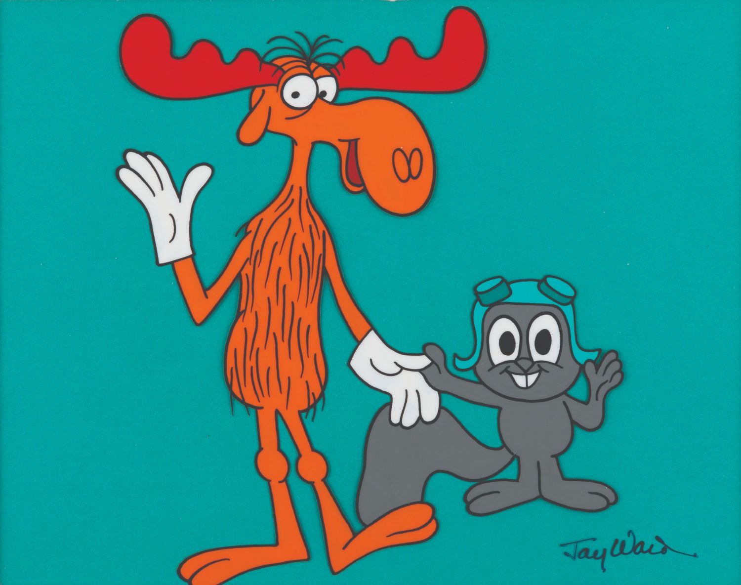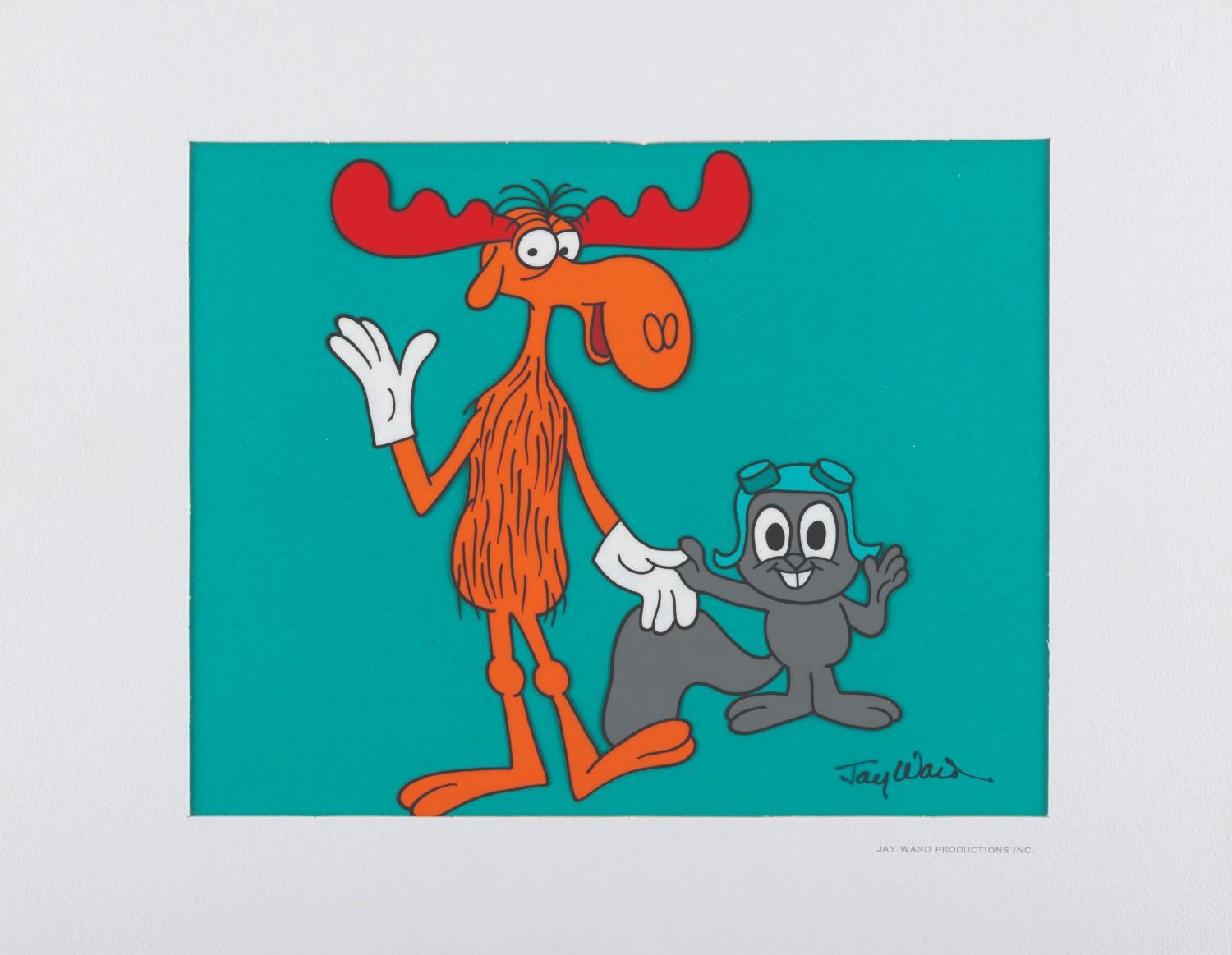(Ward, 1989) Scene Cel #33 in the Jay Ward Productions Original Animation Scene Cels Collection, featuring Rocky and Bullwinkle, signed by Ward in black marker. With an image size of 6” x 6.75” on a 7.75” x 9.25” cel, presented on teal paper in a 10” x 13” matte, the art is in very good condition with light scratches and edge wear to the matte.