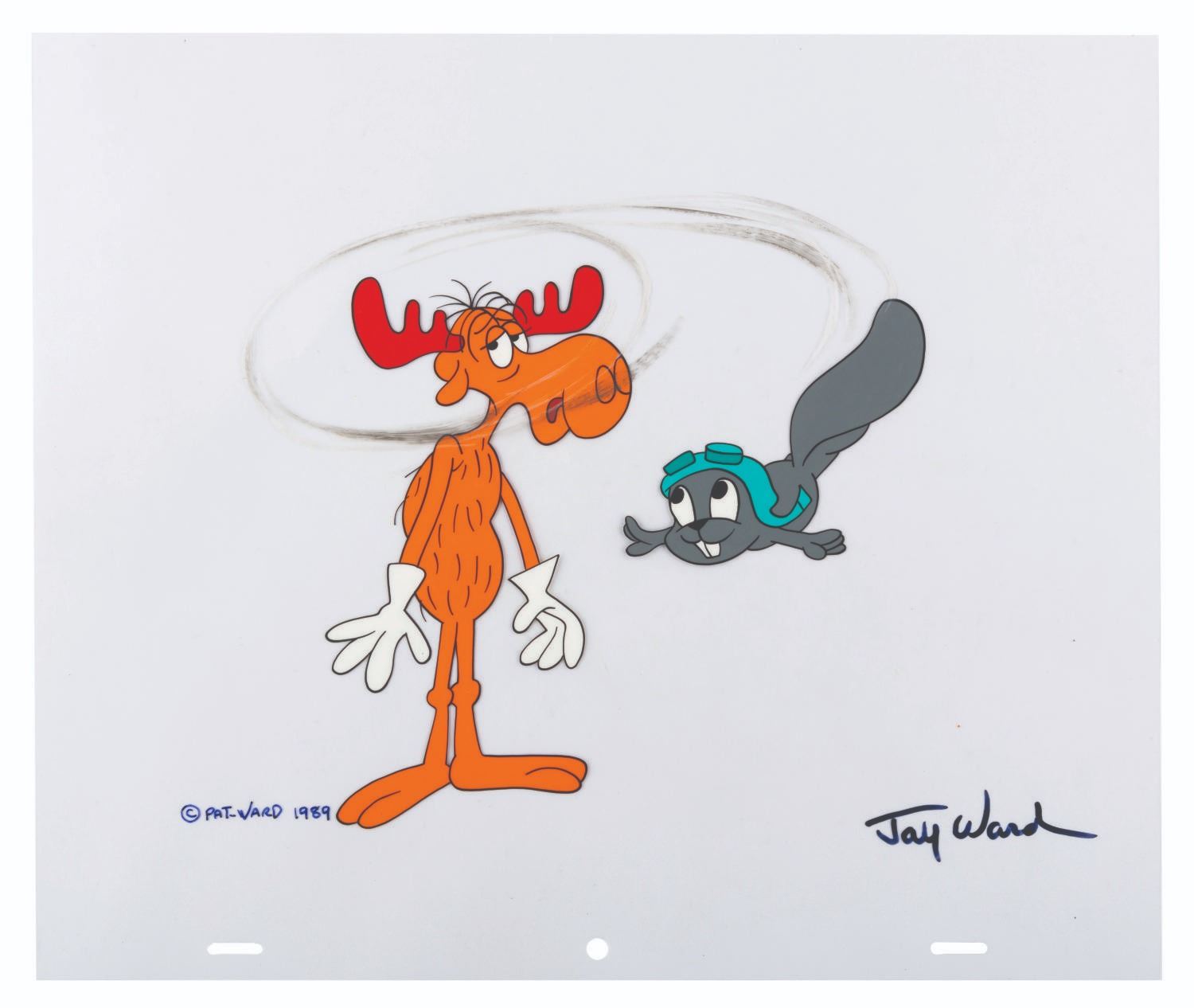 (Ward, 1989) Scene Cel #35 in the Jay Ward Productions Original Animation Scene Cels Collection, featuring the stars of"The Rocky and Bullwinkle Show," signed in black ink by Ward. The characters have an image size of 6.5" x 7.5" on a 10.5" x 12.5" cel. The art is in very good condition with light scratches.