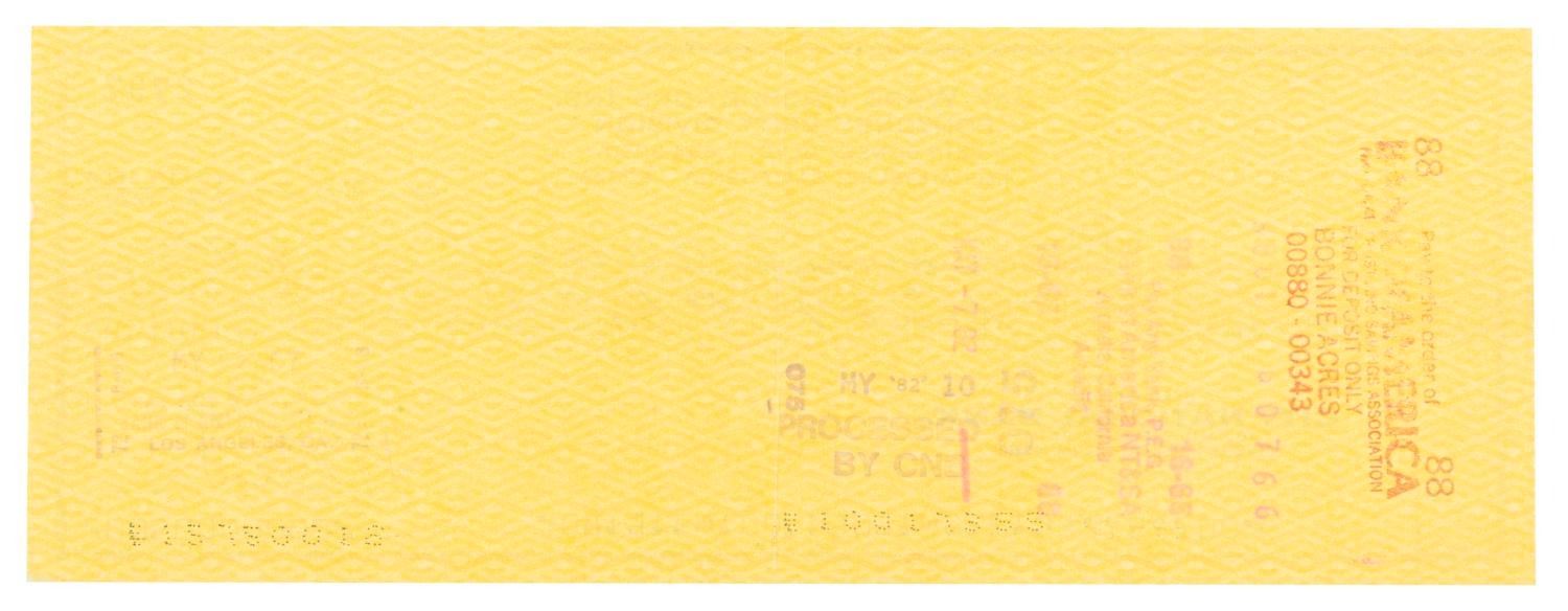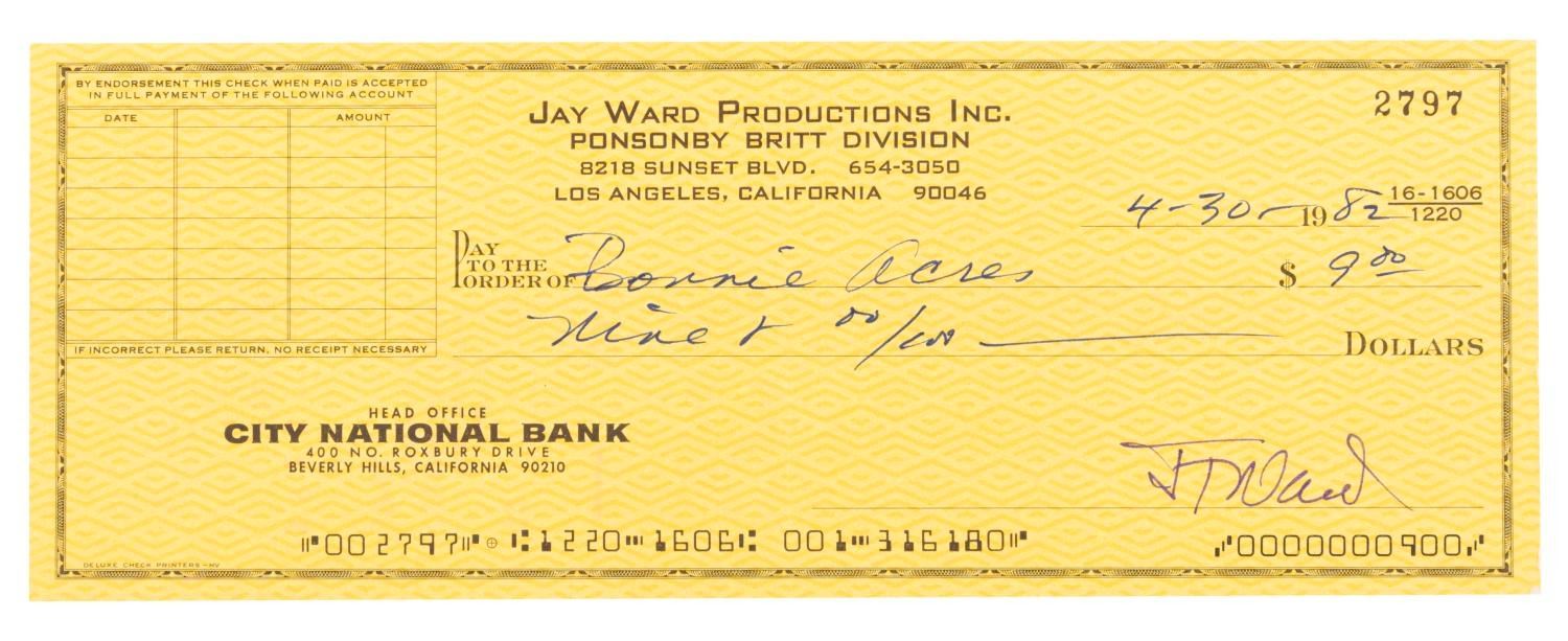 (Ward, 1982) A canceled Jay Ward Productions check signed by Ward and made out to Bonnie Acres. Measuring 3” x 8.25”, the check displays in good condition with light edge wear and a vertical fold down the center.