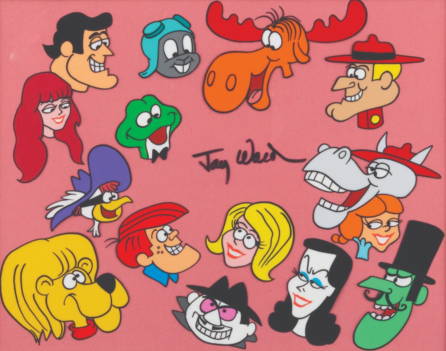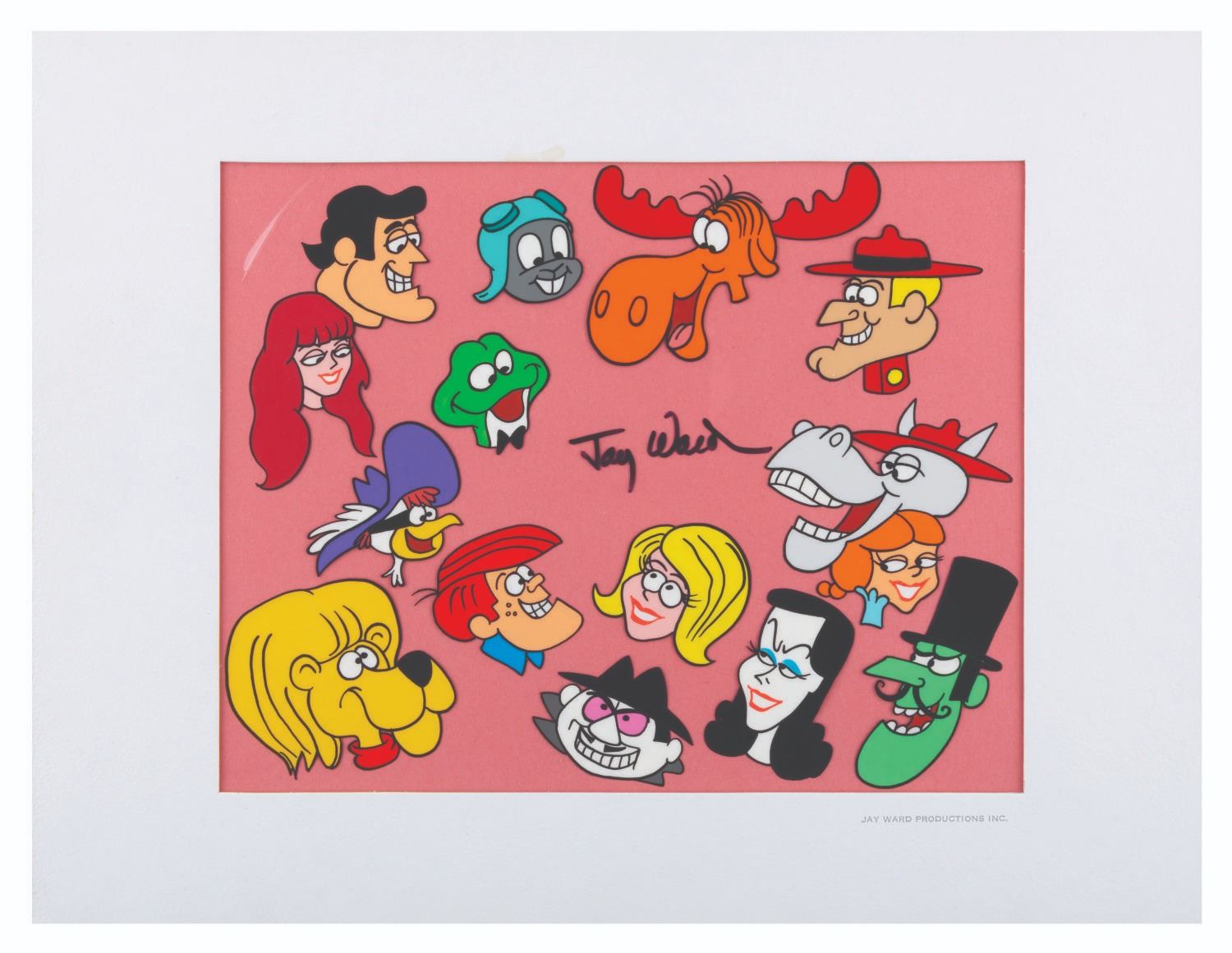 (Ward, 1980s) A Jay Ward signed scene cel featuring portraits of his major characters including Bullwinkle, Dudley Do-Right, George of the Jungle, and more. Measuring 8” x 10” in a 10” x 13” matte, the piece is in good condition with light wear, a stain on the matte, and a 1.75” crack at the top left of the cel.
