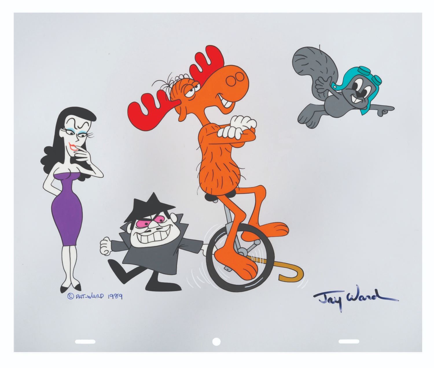 (Ward, 1989) Scene Cel #7 in the Jay Ward Productions Original Animation Scene Cels Collection, featuring the main characters of “The Rocky and Bullwinkle Show,” signed in black ink by Ward. With an image size of 7.5” x 11” on a 10.5” x 12.5” cel, the piece is in fine condition.