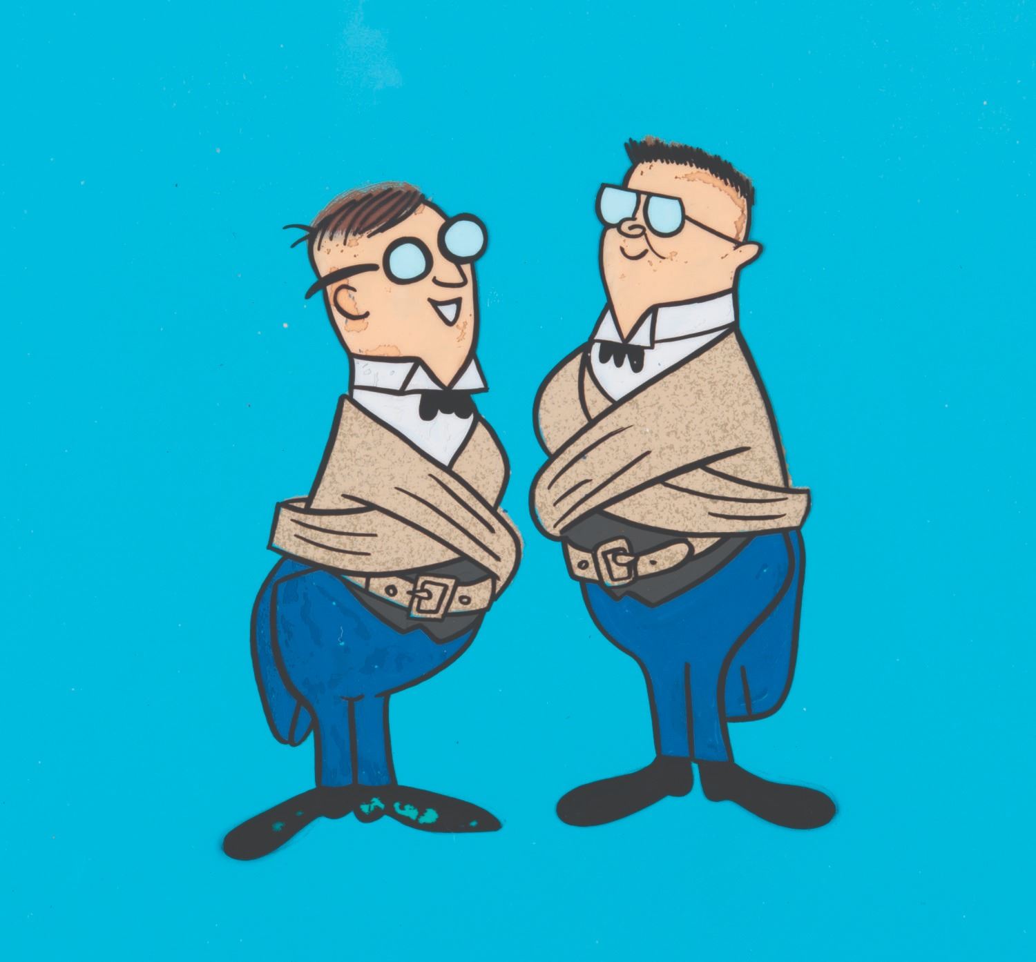 (Ward, 1964) A publicity cel for “The Nut House!!” of Jay Ward and Bill Scott in straight jackets. A pilot for this live-action sketch comedy show was created by Ward and Scott along with other Rocky and Bullwinkle writers. “The Nut House!!” aired once on CBS, but was not picked up for a series. Five years later NBC’s “Rowan and Martin's Laugh-In” utilized similar quick jokes and short sketches, showing that Jay Ward was ahead of his time. With a character image size of 4.75” x 4” on a 9.25” x 12.5” cel presented on a 10.5” x 13” hand-painted color card background, the cel is in fair condition with paint loss, paint separation from the cel sticking to the background, and tape residue along the edges of both the cel and background.