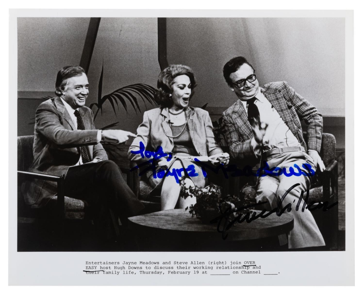 (PBS, 1970s-80s) A publicity photo from the PBS talk show "Over Easy" hosted by Hugh Downs and signed by guests Jayne Meadows and Steve Allen. The photo is in very good condition with light scuffing to the reverse.