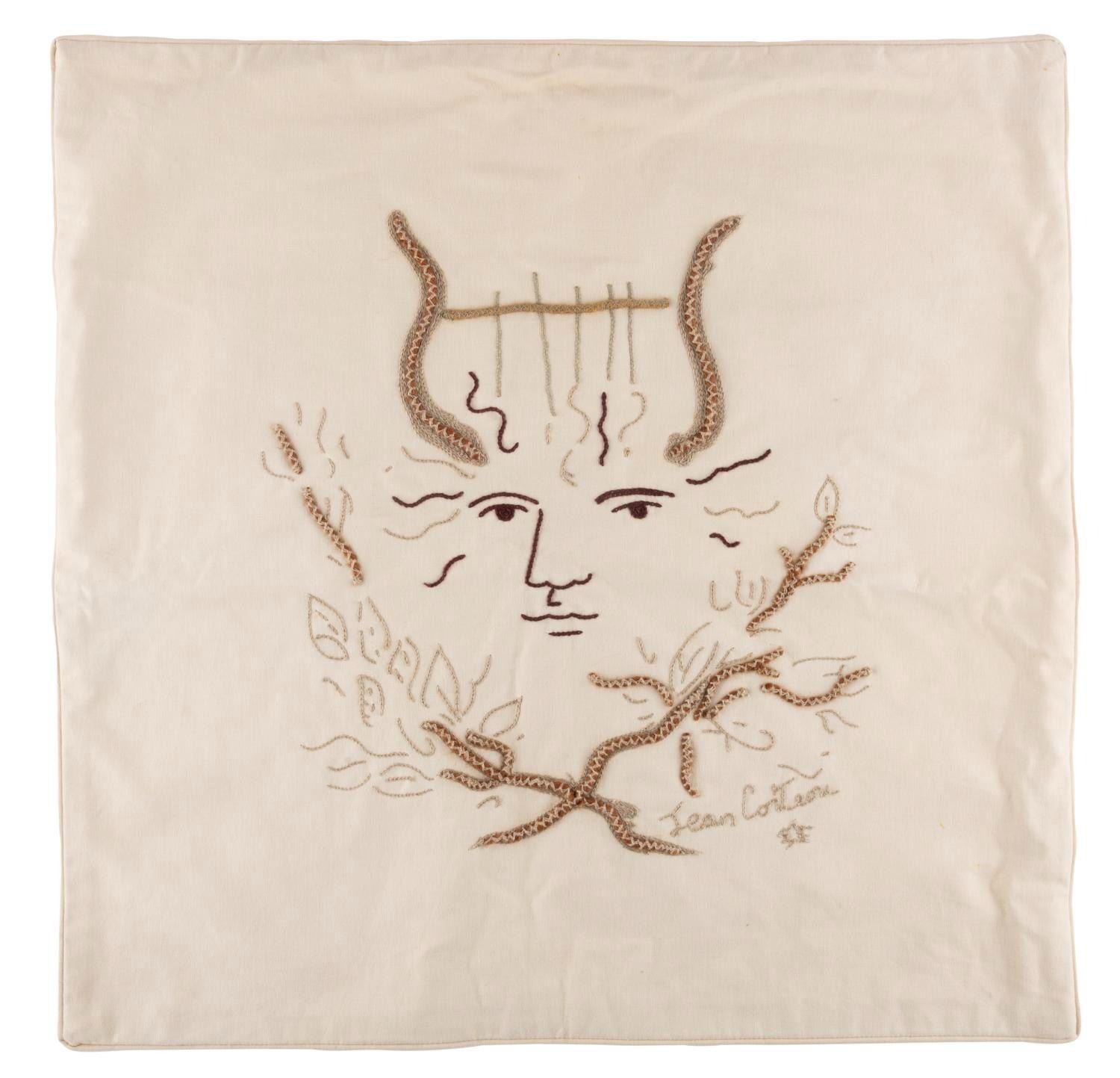 (Jean Francois Lesage, 1990s) A decorative cushion cover featuring a design originally by Jean Cocteau, with his signature embroidered on the front. Measuring 24" x 24", the cover is in very good condition with very light wear.