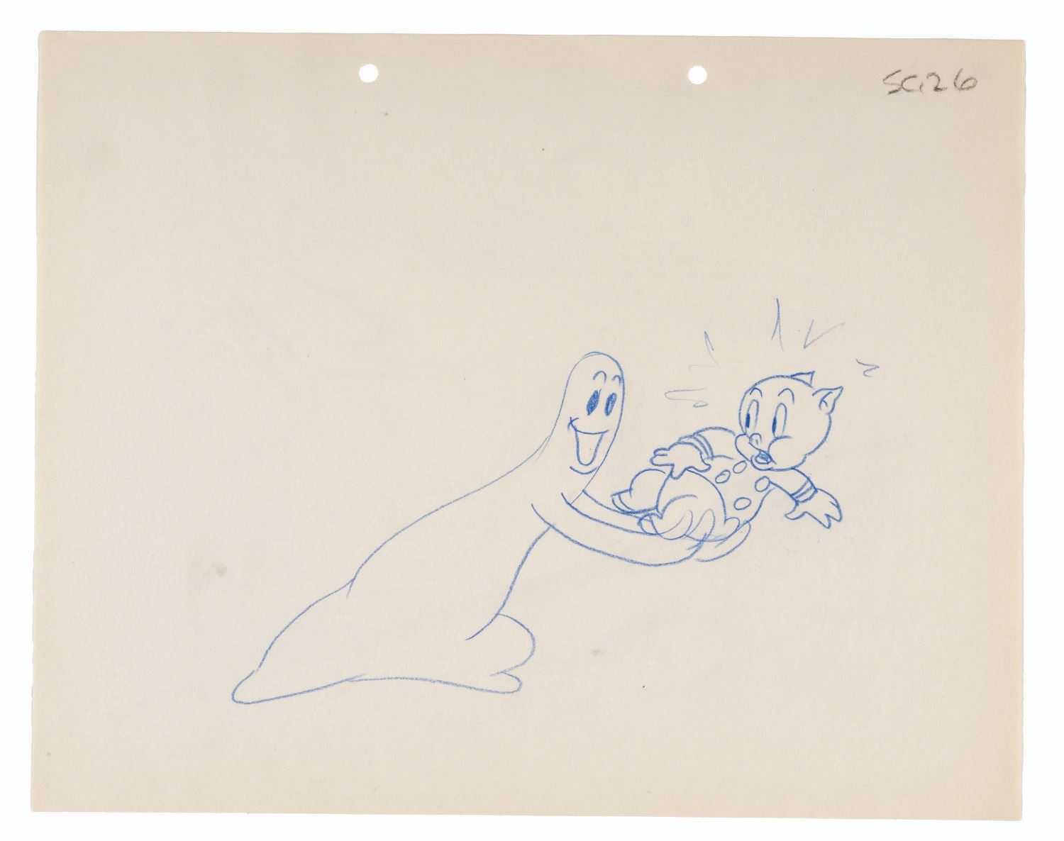 (Schlesinger, 1939) An original layout drawing of Porky Pig and the ghost from “Jeepers Creepers.” Measuring 5.5” x 7.5” on 9.5” x 12” animation paper and accomplished in blue colored pencil, the drawing is in very good condition with light creases and smudges from handling.