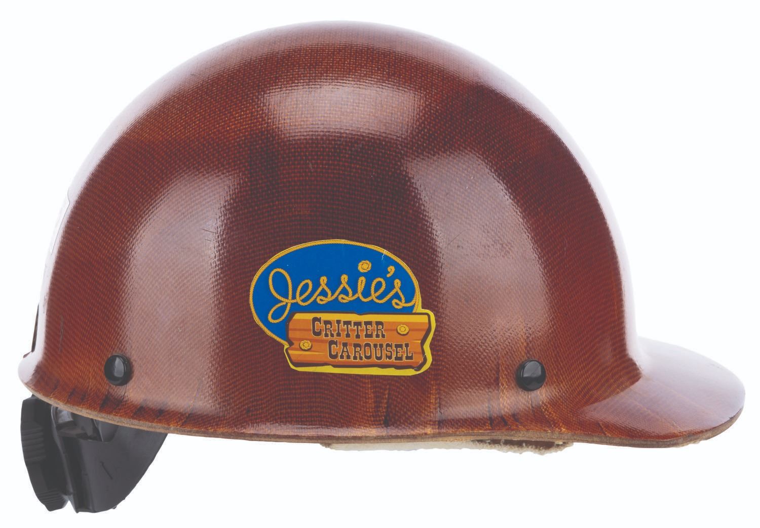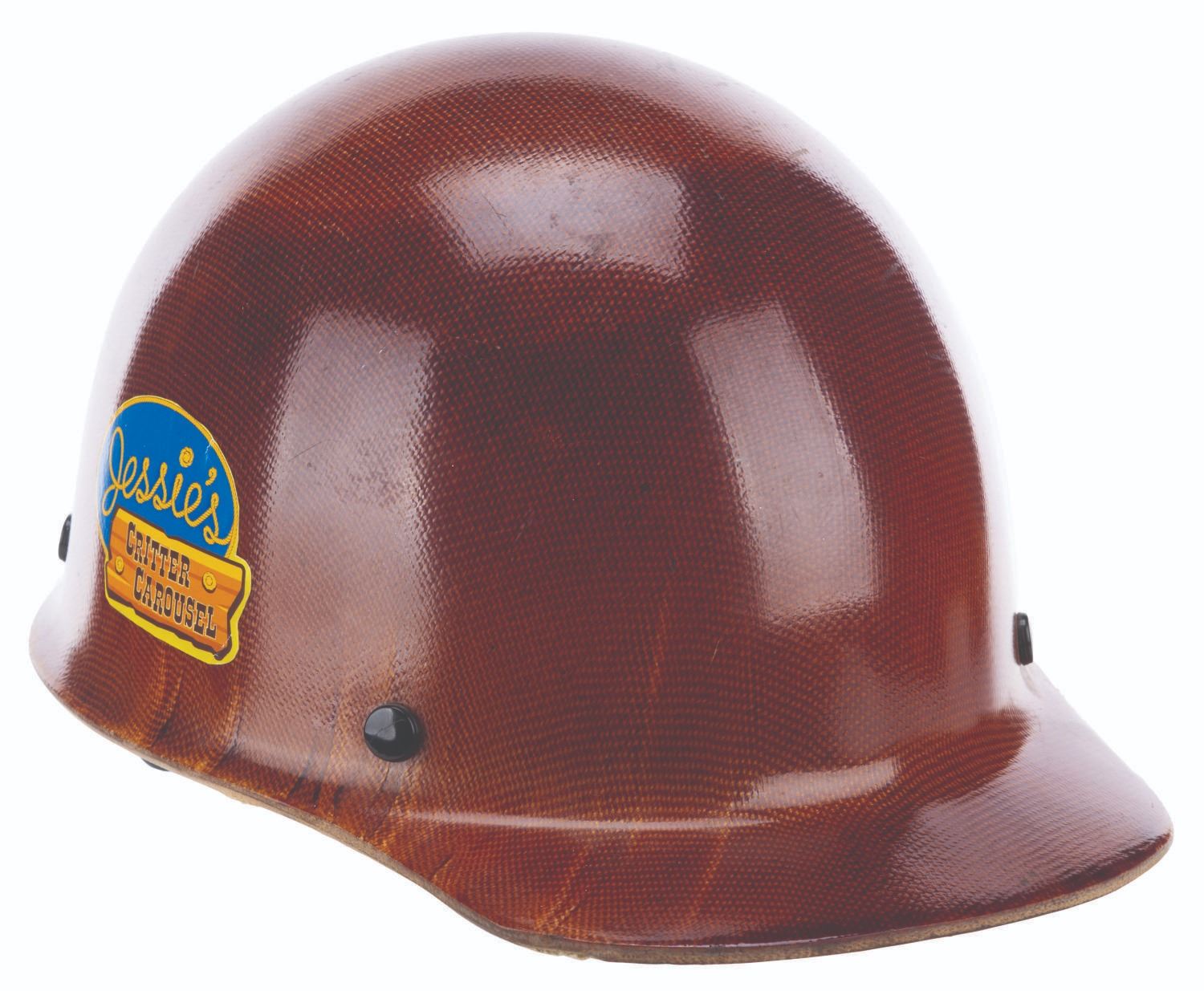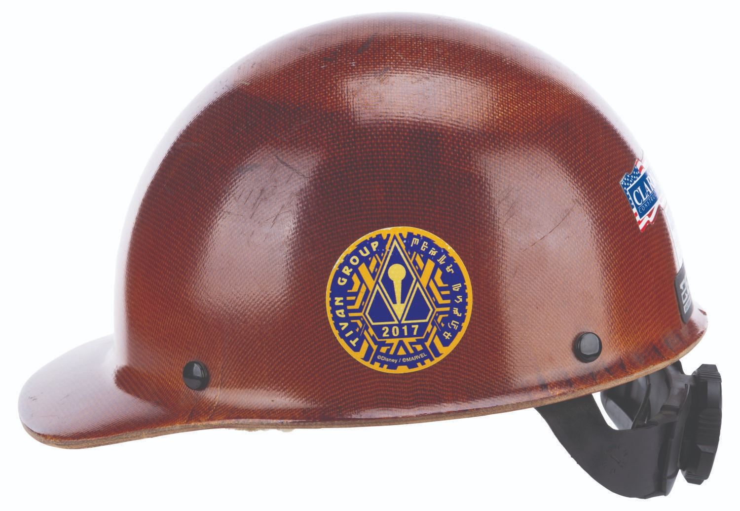 (Disney California Adventure, 2017-19) An Imagineering hard hat featuring project stickers from Jessie's Critter Carousel and Guardians of the Galaxy - Mission: Breakout! Labeled a size Medium, the hard hat displays in very good condition with wear from Park use, including scuffs, scratches, and fraying under the brim.