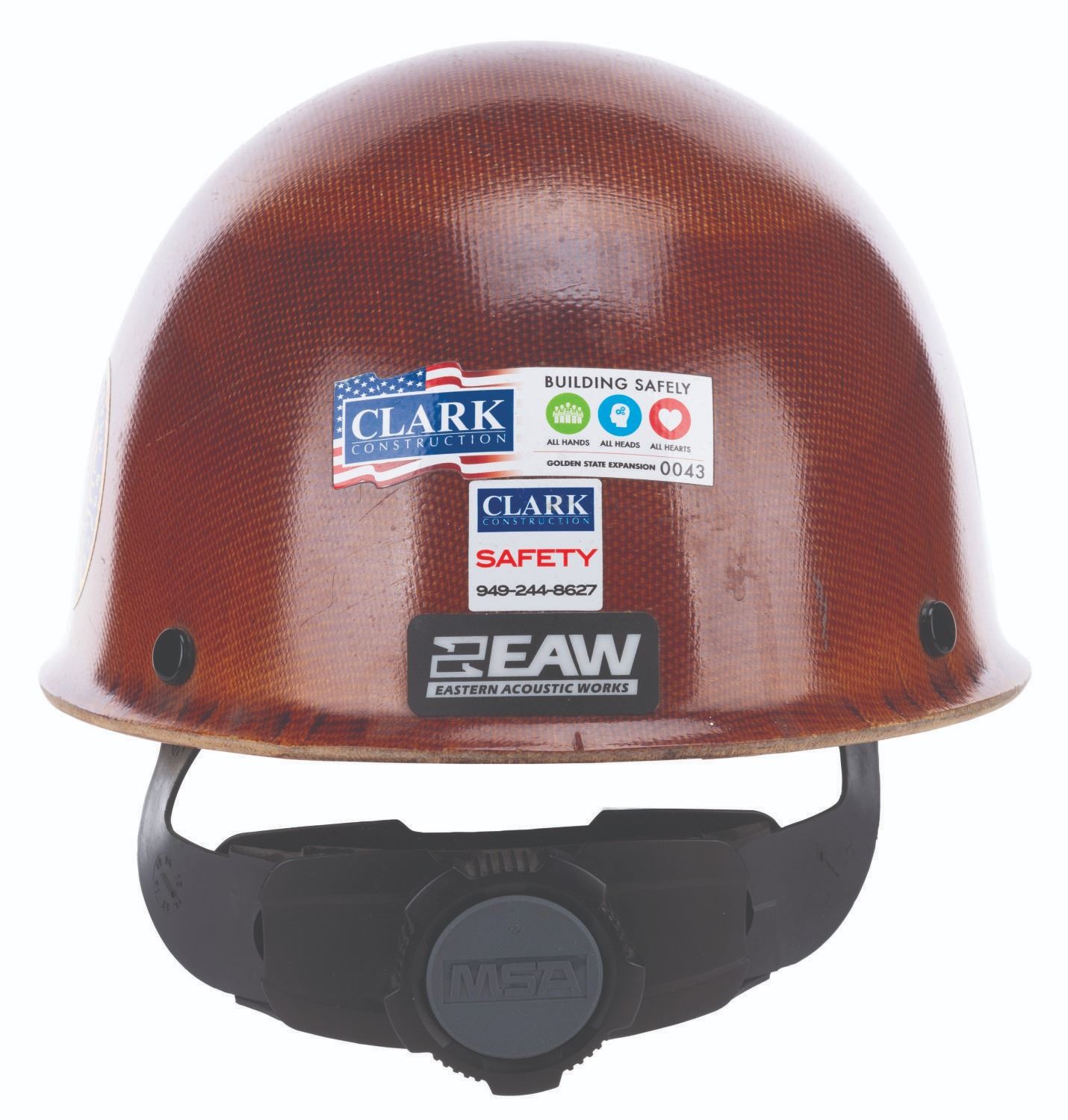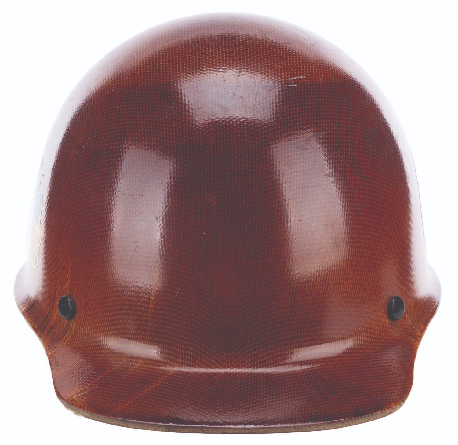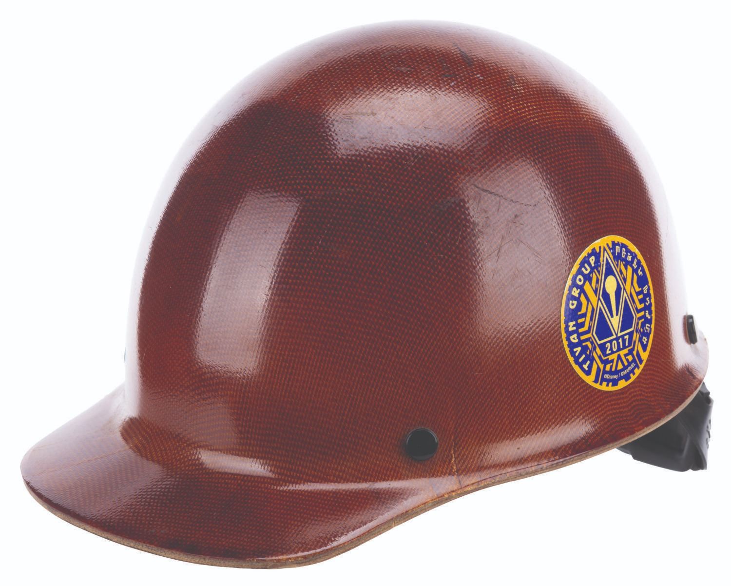 (Disney California Adventure, 2017-19) An Imagineering hard hat featuring project stickers from Jessie's Critter Carousel and Guardians of the Galaxy - Mission: Breakout! Labeled a size Medium, the hard hat displays in very good condition with wear from Park use, including scuffs, scratches, and fraying under the brim.