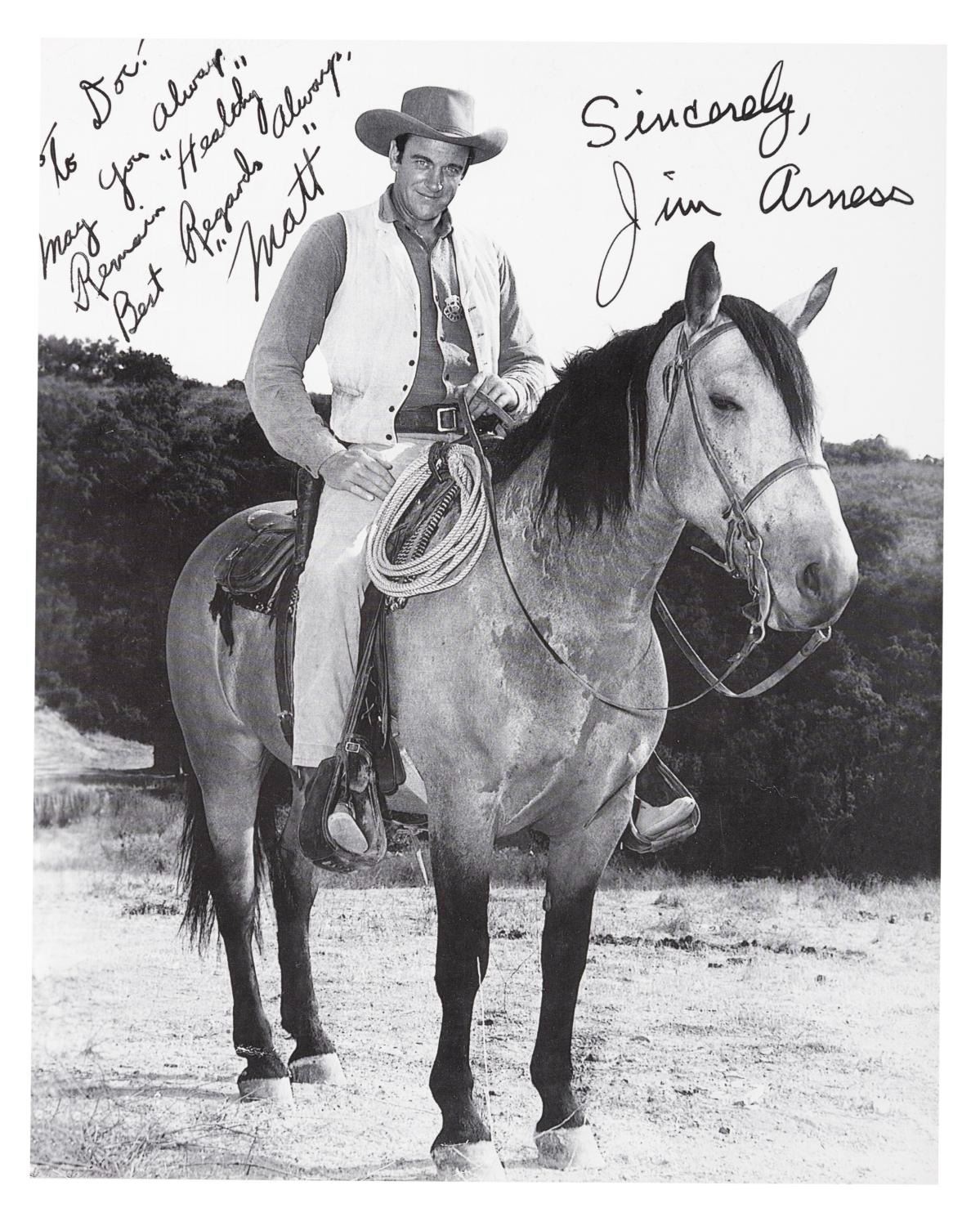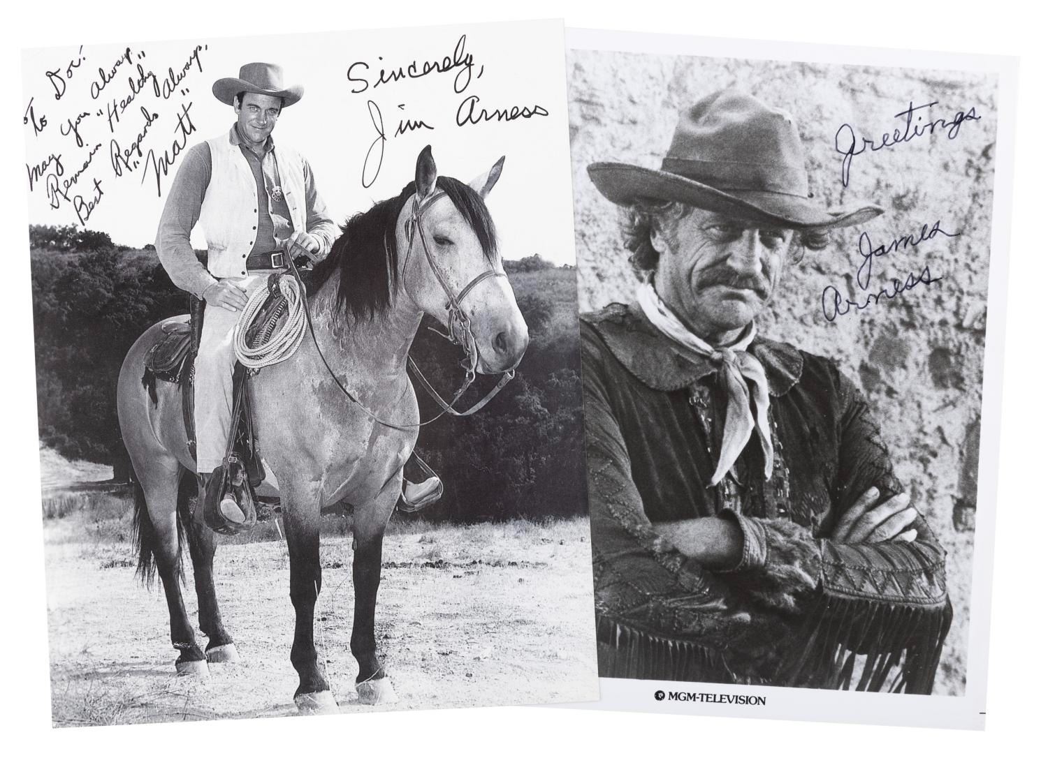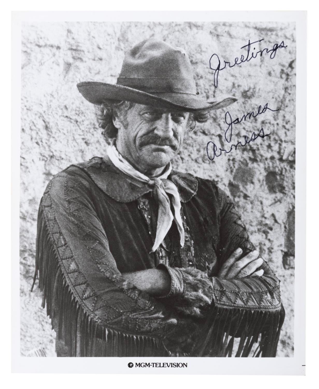 (MGM, 1990s-2000s) A signed photo of James Arness in the television series "How the West Was Won," with a personalized dedication on the reverse. Also included is a printed copy of a signed "Gunsmoke" photo. Measuring 8" x 10", the signed photo is in good condition with scratches, light creases, wear, and indentations from another message being written over the photo.
