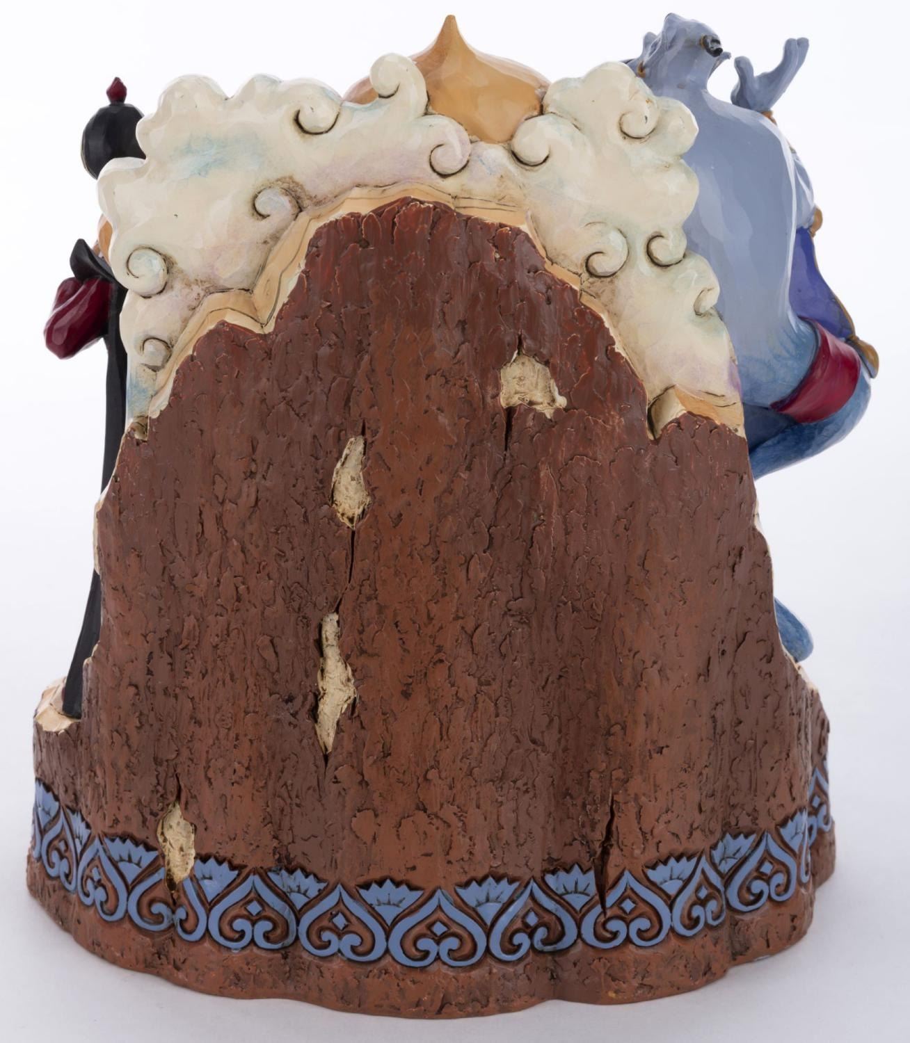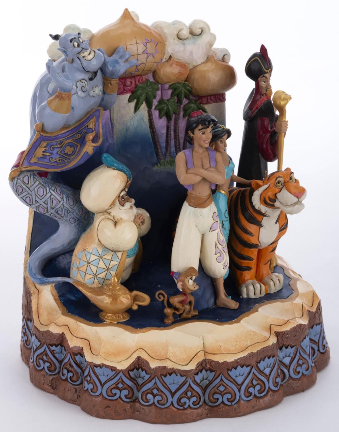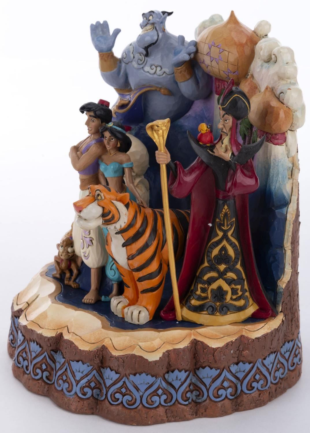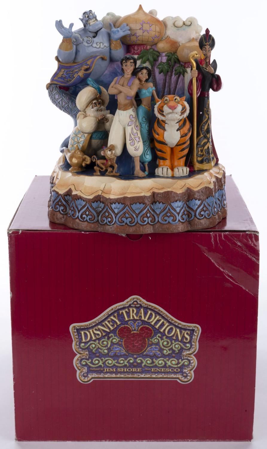 (Enesco, 2000s) A Disney Traditions figurine of Aladdin, Jasmine, Genie, Carpet, Abu, Jafar, Sultan, and Rajah from Disney's “Aladdin.” Titled 'A Wondrous Place," the resin figurine was designed by Jim Shore and released as part of the Disney Showcase Collection. Measuring 6.5" x 6.5" and 7.5" tall, the figurine is in fine condition and comes with the original 8.75" x 8" x 9.25" box.