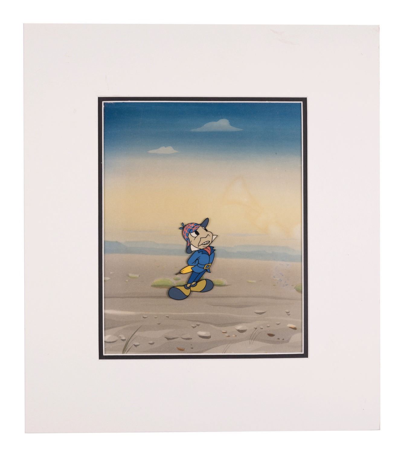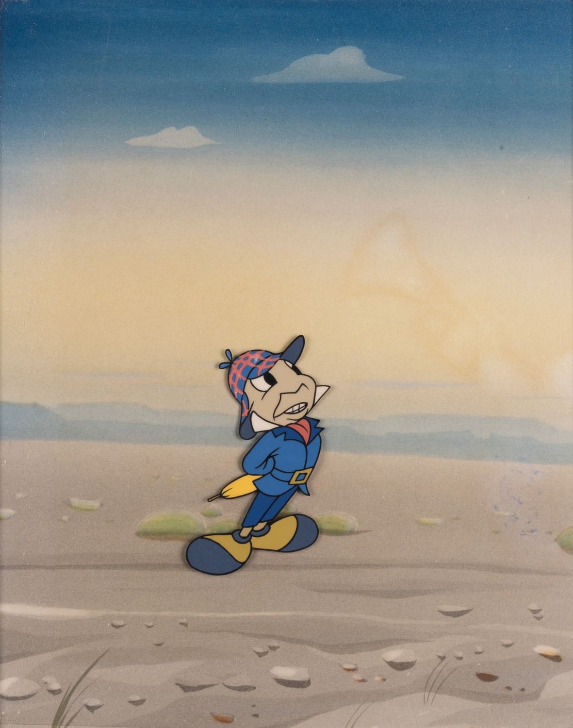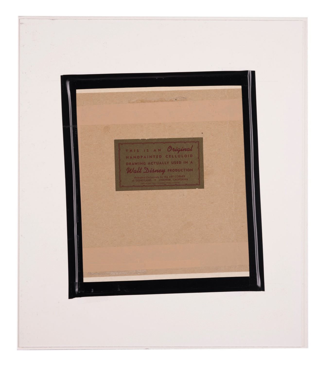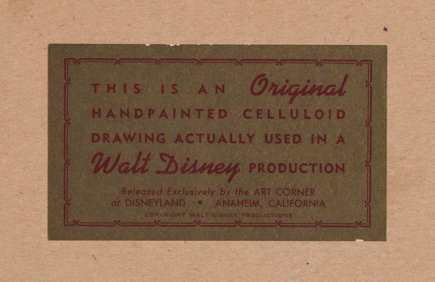 (Disneyland, 1960s) An original production cel of Jiminy Cricket Cel purchased from the Art Corner in Disneyland. The cel features Jiminy Cricket for a televised segment and was trimmed at the studio in preparation for sale through the Art Corner at Disneyland. The image size of Jiminy is 3.25"x1.75" while the entire piece measures 10"x8.5" and is in very good condition with minor wear from age. It retains the original mat backing and bears the "Walt Disney Original Disneyland" gold sticker on the reverse.