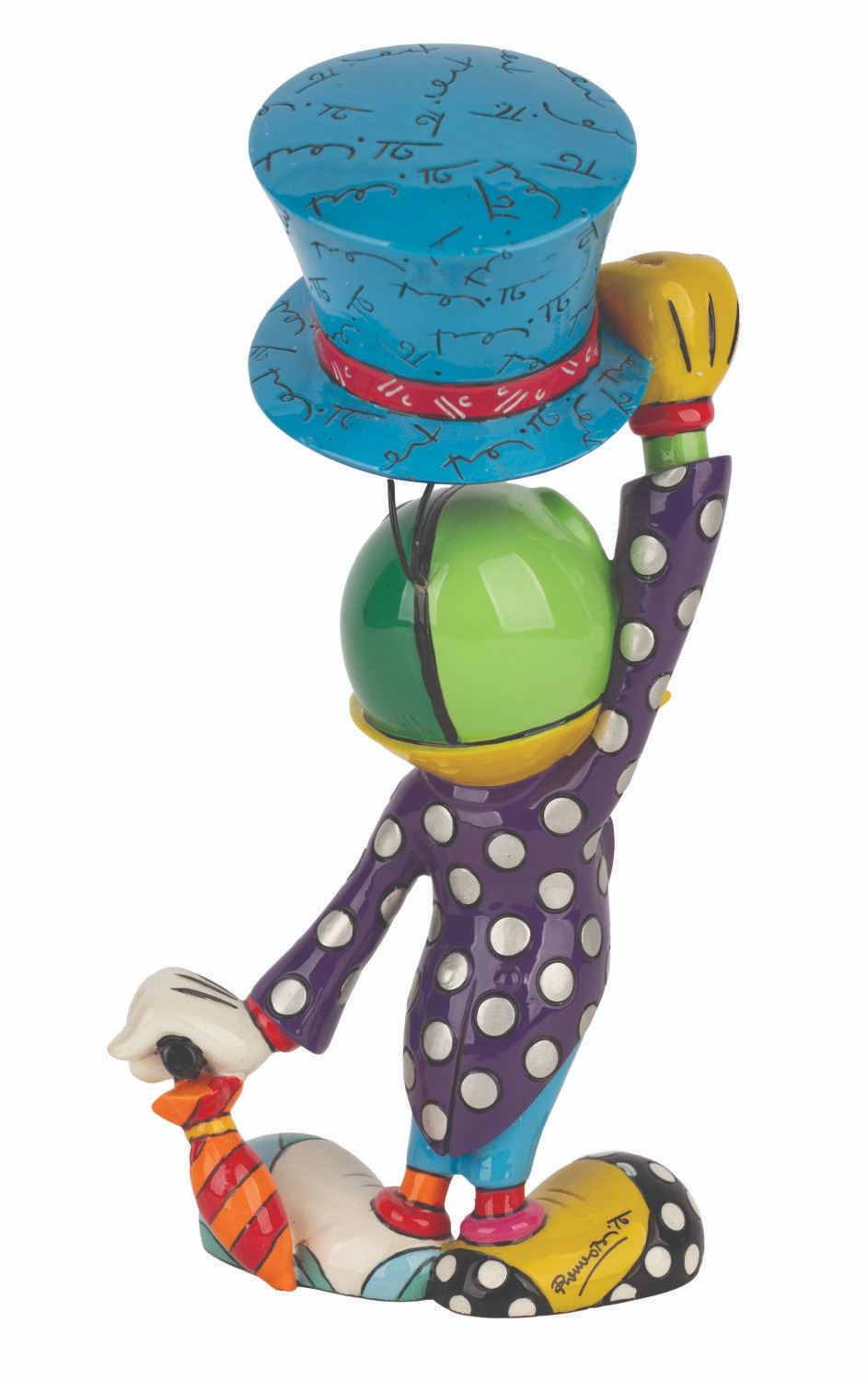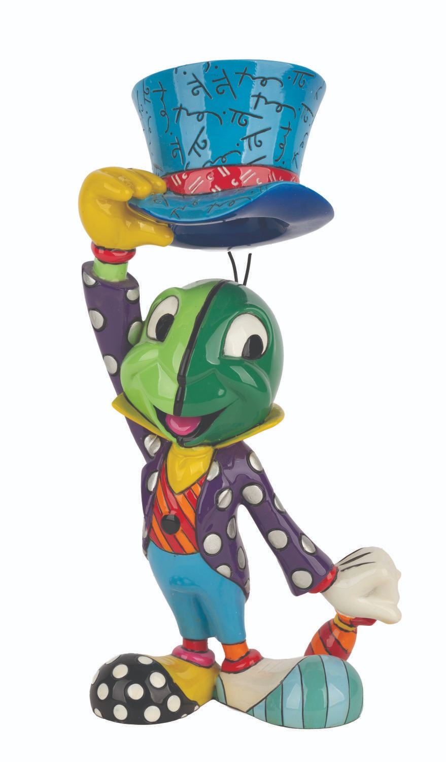 (Enesco, 2011) A Disney Jiminy Cricket figurine designed by Romero Britto and released by Enesco. Measuring 8” tall with its original 5.5” x 6” x 10.25” tall box, the figurine is in very good condition with several small stains.
