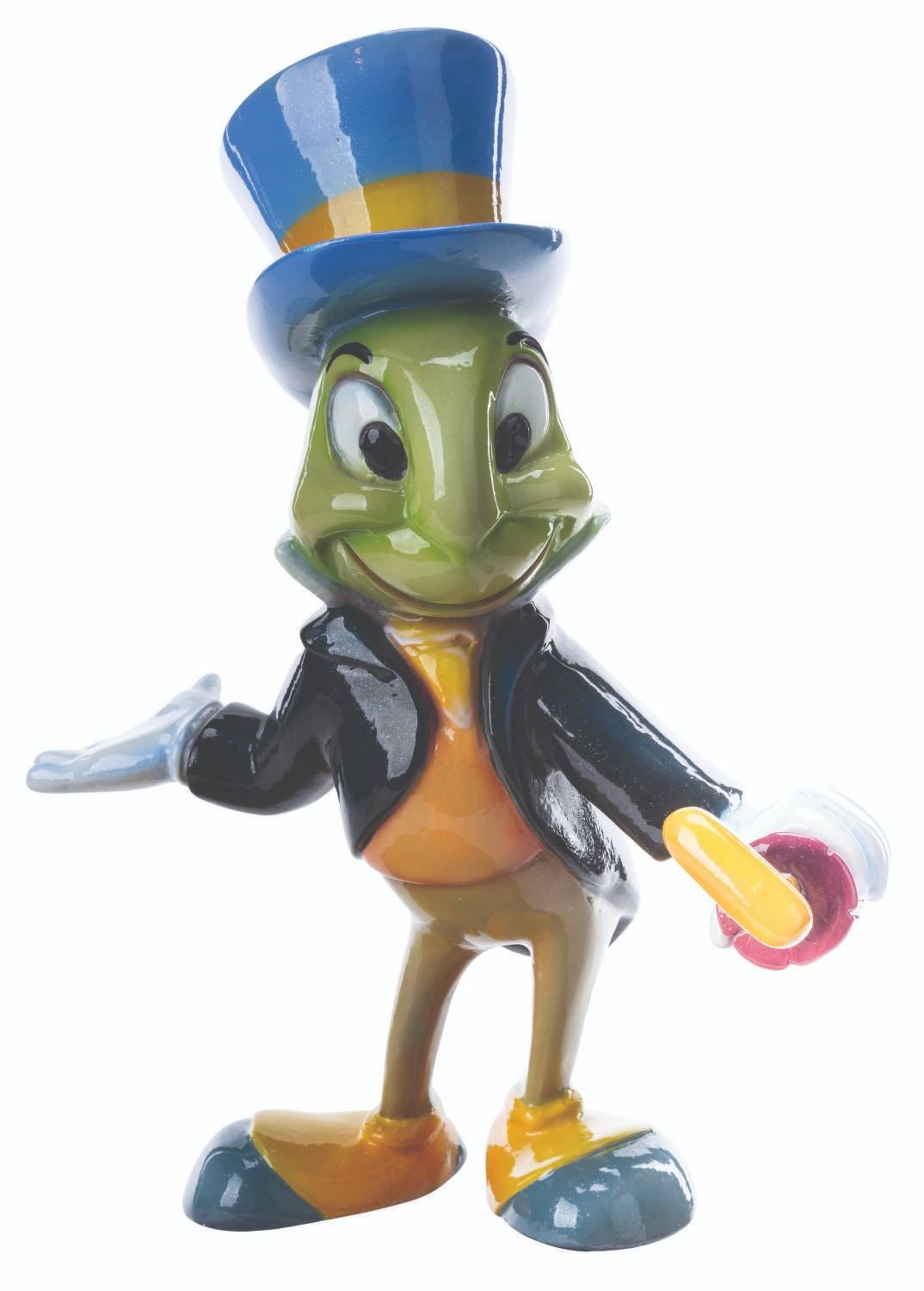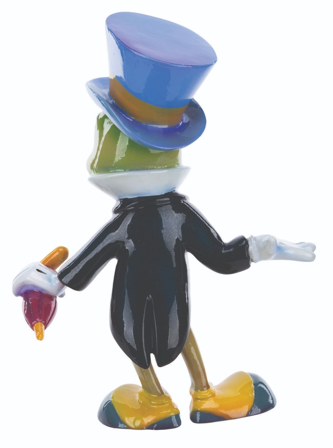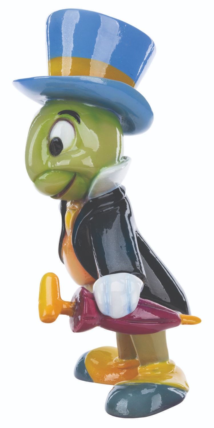 (Disney, 1990s-2000s) A Disney Store display figure of Jiminy Cricket from "Pinocchio." Measuring 6" x 9.25" x 13.5" tall, including its rod, the fiberglass figure displays in very good condition with discoloration from age, paint loss, wear, and heavy cracks at the umbrella handle's base.