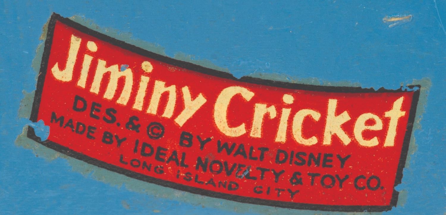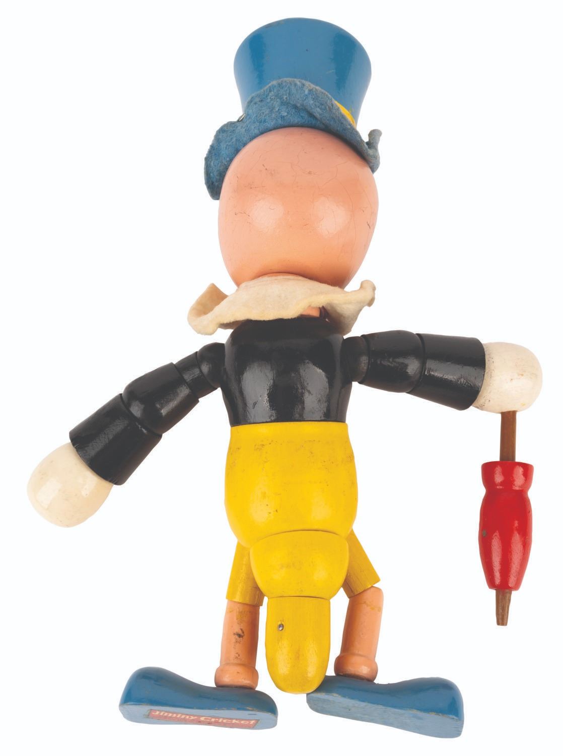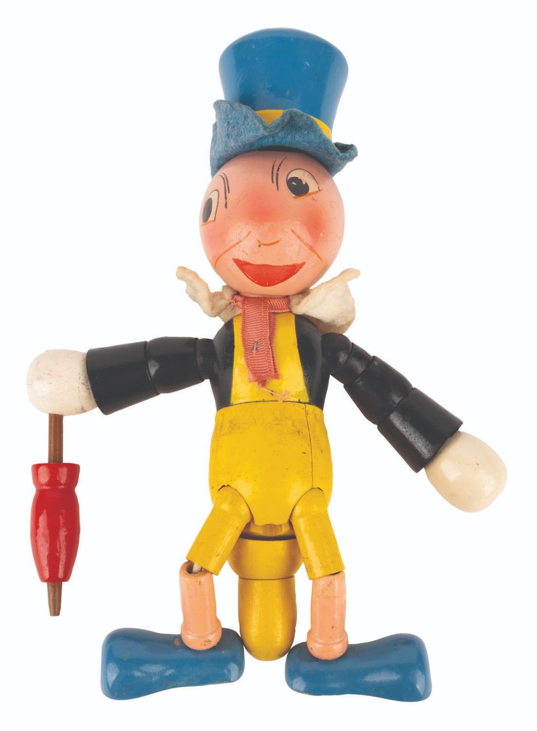 (Ideal, 1940s) A wooden jointed doll of Jiminy Cricket from Walt Disney’s"Pinocchio," manufactured by the Ideal Novelty and Toy Company. Standing 8.5" tall the wooden doll is in very good condition with typical wear from age and use.