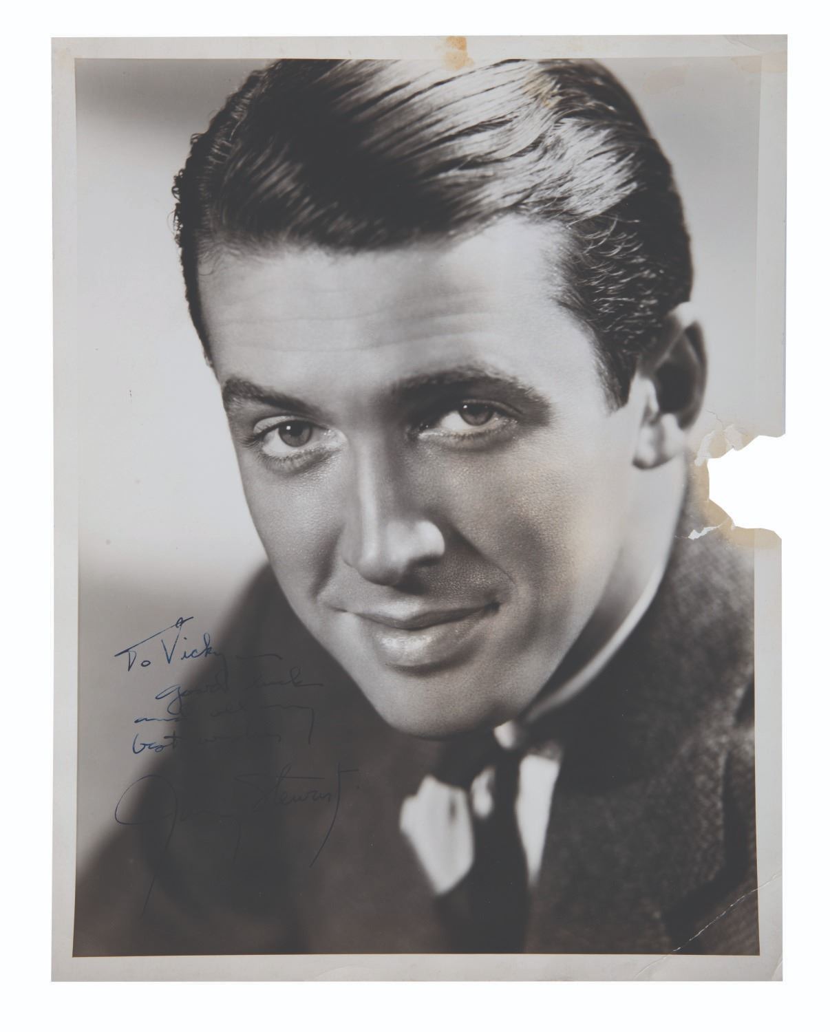 (James Stewart, 1930s) A photo of actor James Stewart, signed with dedication to MGM Costume and Wardrobe Matron Vicky Nichols. Measuring 10"x13", the vintage photo is in fair condition, with light toning, light wear from handling and age, a crease to one corner and smudge at top center border, and a 1.5" square torn from the center right side.