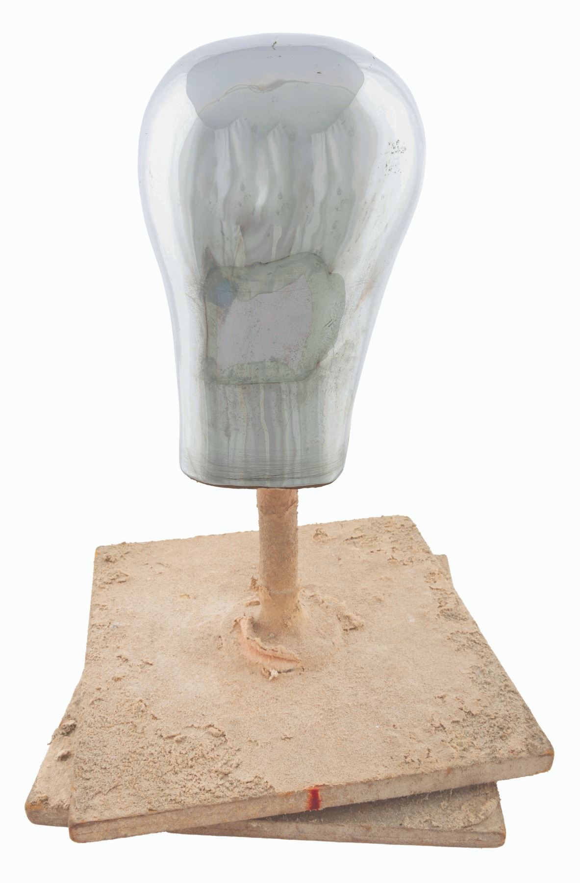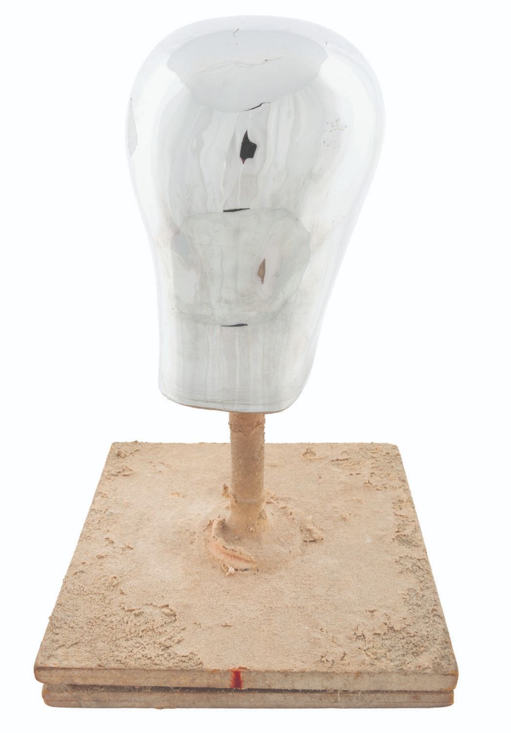 (Chambers/Warner Bros., 1966-2012) One of John Chamber’s original bald cap forms, used as a background prop in “Argo.” Chambers revolutionized bald caps for television and film. Instead of using rubber, the traditional method, he used liquid plastic sprayed onto one of two metal head-shaped forms. This original form was seen behind John Goodman, portraying Chambers, in the film “Argo.” It was also used for countless historic productions including “Star Trek,” “Mission: Impossible,” and even Chambers’ work with the C.I.A. The chrome metal form is supported by a rod atop a two-part base, with the top designed to rotate easily to allow even application of the liquid plastic. The rod and base are covered with years of liquid plastic buildup from Chambers’ use. Measuring 10” x 10” x 15.5” high, the form is in very good condition with the wear expected from production use.