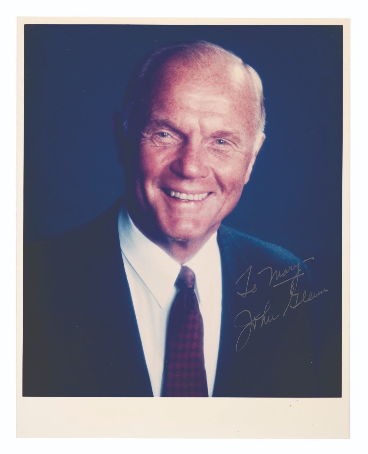 (John Glenn, 1980s-90s) A photograph signed by former NASA astronaut John Glenn. John Glenn (1921-2016) was selected by NASA to become one of the "Mercury Seven". Glenn continued with NASA, becoming the first American to orbit the Earth, the third American and fifth person in history to be in space, and was subsequently bestowed many honors and awards. Measuring 8"x10", this color photo was signed by the astronaut, personalized to "Mary," and is in very good condition, exhibiting a few small dimples and minor wear.