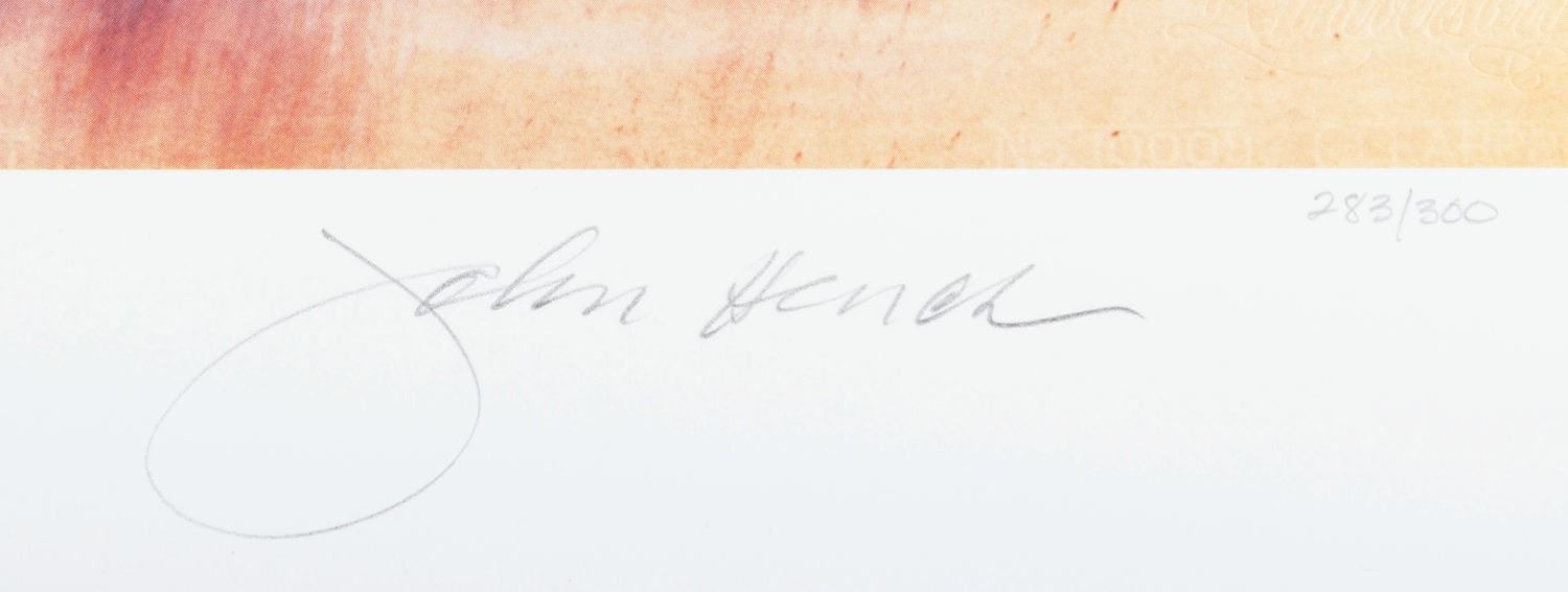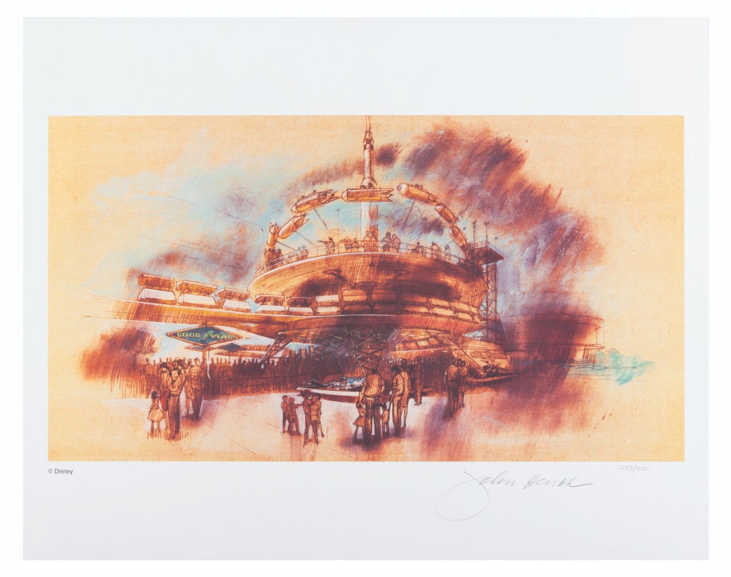 (Disneyland, 1997) A Disney Gallery Tenth Anniversary print of John Hench’s 1965 concept art for the PeopleMover and Rocket Jets. This print has been signed by Hench in graphite, hand-numbered 283/300, and bears The Disney Gallery Tenth Anniversary embossed seal. Measuring 11” x 14”, the Tomorrowland print is in fine condition.
