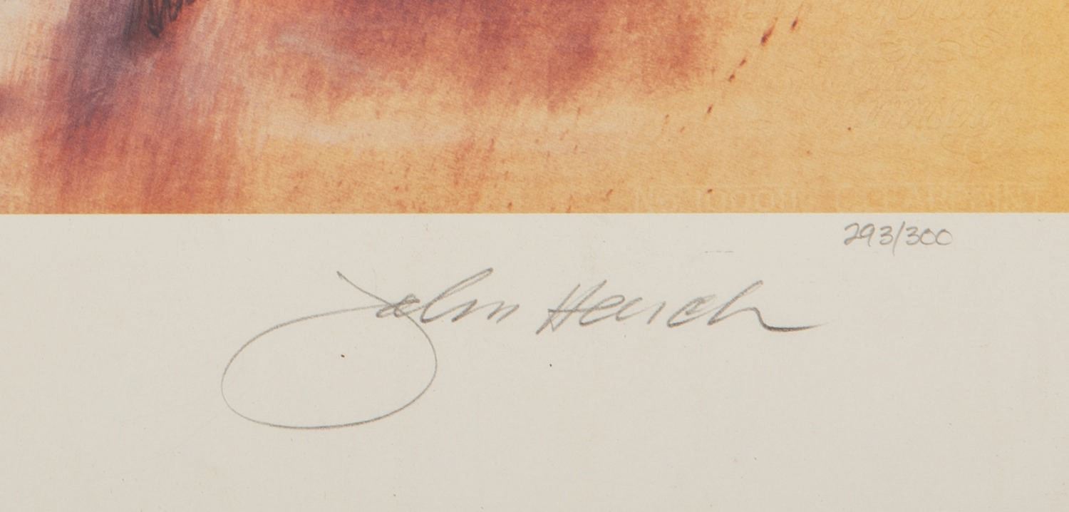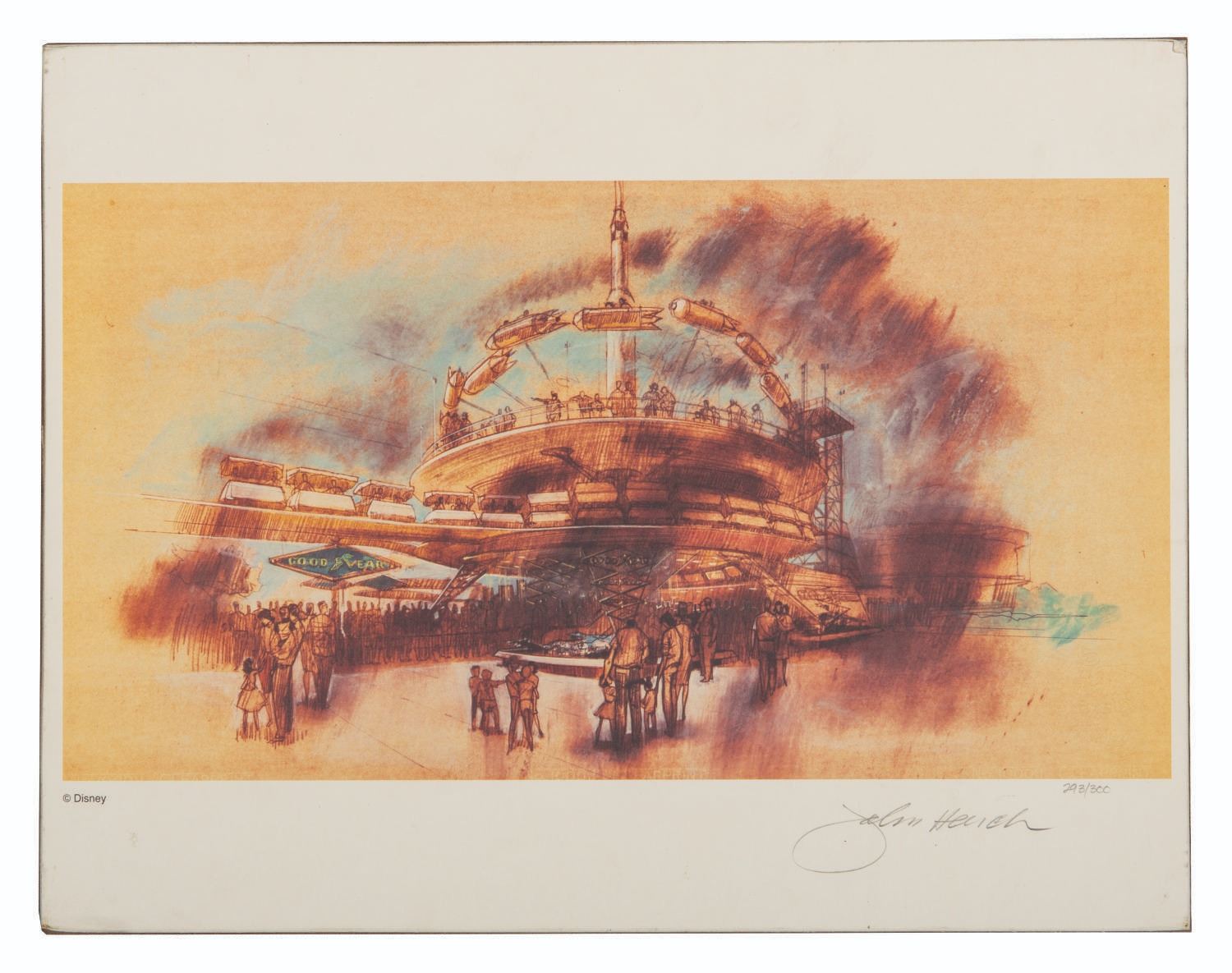 (Disneyland, 1997) A Disney Gallery Tenth Anniversary print of John Hench's 1965 concept art for the PeopleMover and Rocket Jets. This print has been signed by Hench in graphite, hand-numbered 293/300, and bears The Disney Gallery Tenth Anniversary embossed seal. Measuring 10.5” x 13.5”, the print is in very good condition with minor wear to the corners.