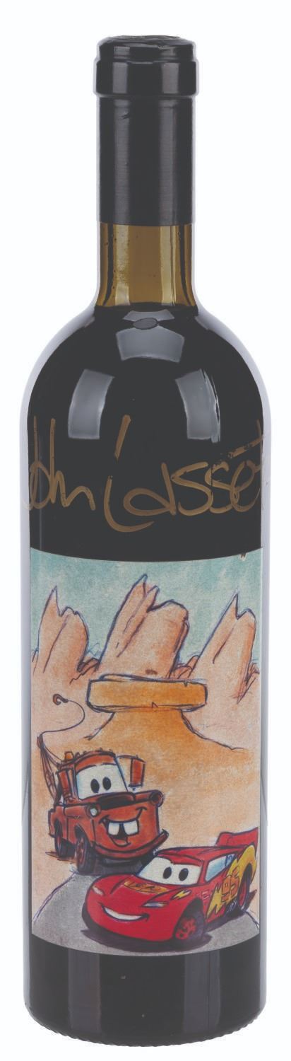 (Pixar, 2006) A bottle of 2003 Alexander Valley Red Wine Blend with a custom"Cars" label featuring Lightning McQueen and Mater, signed by the film's director and Pixar Chief Creative Officer John Lasseter. The fourth vintage of the Lasseter Family Winery, this bottle comes from an edition of 150 cases and was given to the cast and crew of the film. Measuring 12" tall and 3" in diameter, the sealed wine bottle is in very good condition with some loss on the signature and a small scuff on the label.
