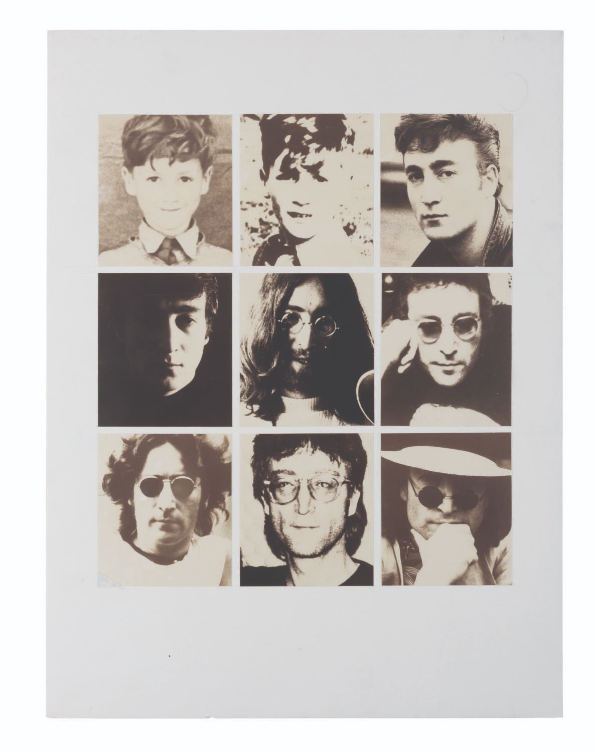 (Lennon, 1990s) A photo layout of John Lennon at nine different ages in his life, for an unknown poster or print project. With an image size of 12" x 13.75" on 15" x 20" art board, the piece is in very good condition with toning to the photo image elements from age.